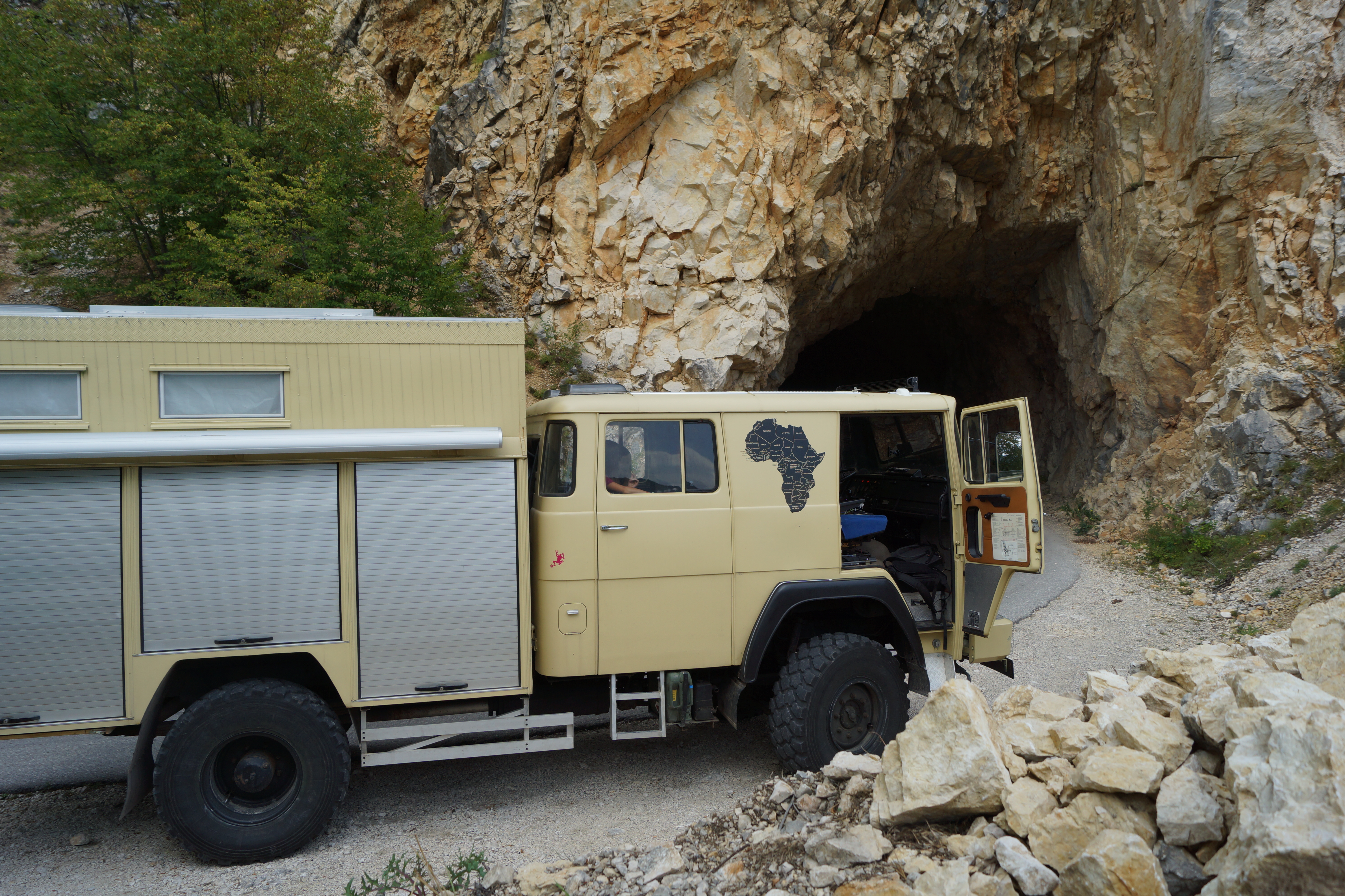 Am 4. September verlassen wir gemeinsam mit den Nickels und ihrem Rundhauber Susi Albanien und werden an der Grenze in Hani i Hotit von neugierigen Grenzbeamten zur Seite gewunken. Bei jedem Grenzübergang auf der gesamten Rückreise müssen wir anhalten, das Procedere ist immer das Gleiche, wir sollen die Rolltore auf der Fahrerseite öffnen, da diese fest verschlossen und verbaut sind führen wir die Beamten auf die gegenüberliegende Seite, öffnen das Rolltor. Das große Fragezeichen über den Köpfen der Beamte löst sich auf „aah, Camping!“. Als dann noch Fiona in Position geht und die Türe vom WC-Häuschen öffnet wird gelacht und wir dürfen mit guten Reisewünschen des Weges ziehen. Also kein Problem an den Grenzen, wir hatten aber auch nichts zu befürchten – alles legal! Dafür sind wir sehr erstaunt als beim Warten die Grenzziege Josephine ständig meckernd von Albanien nach Montenegro läuft und ihr keiner Aufmerksamkeit schenkt.