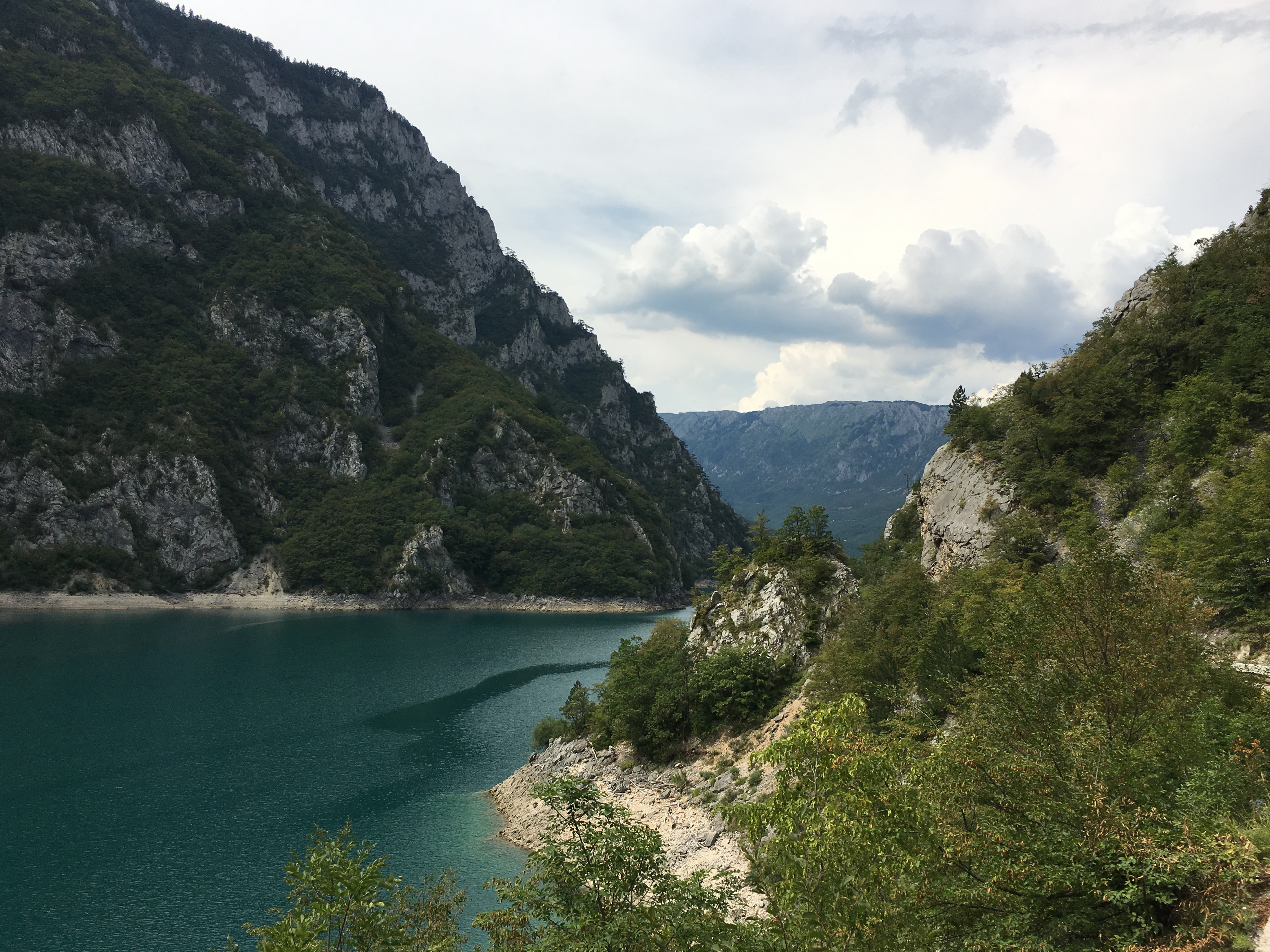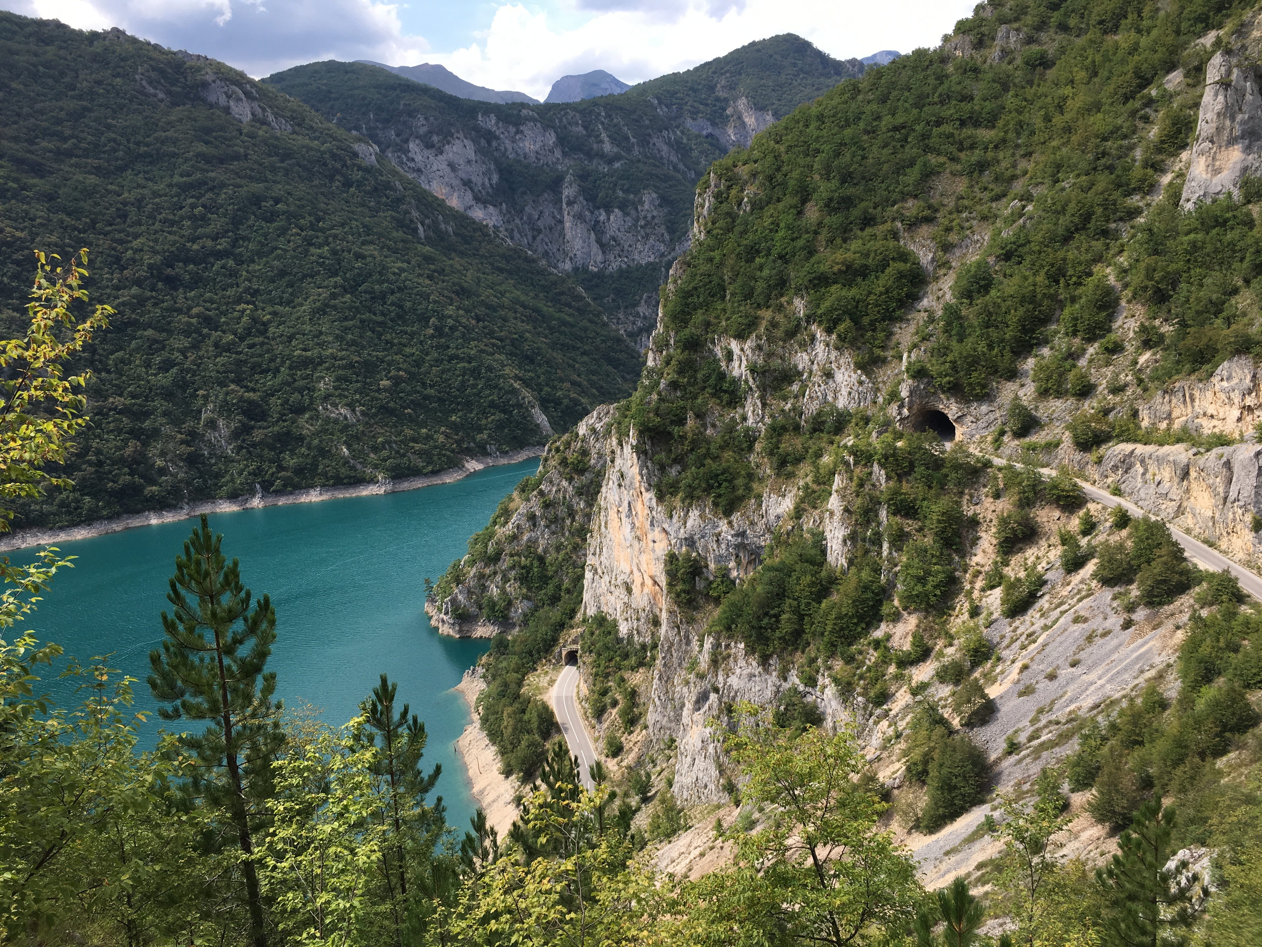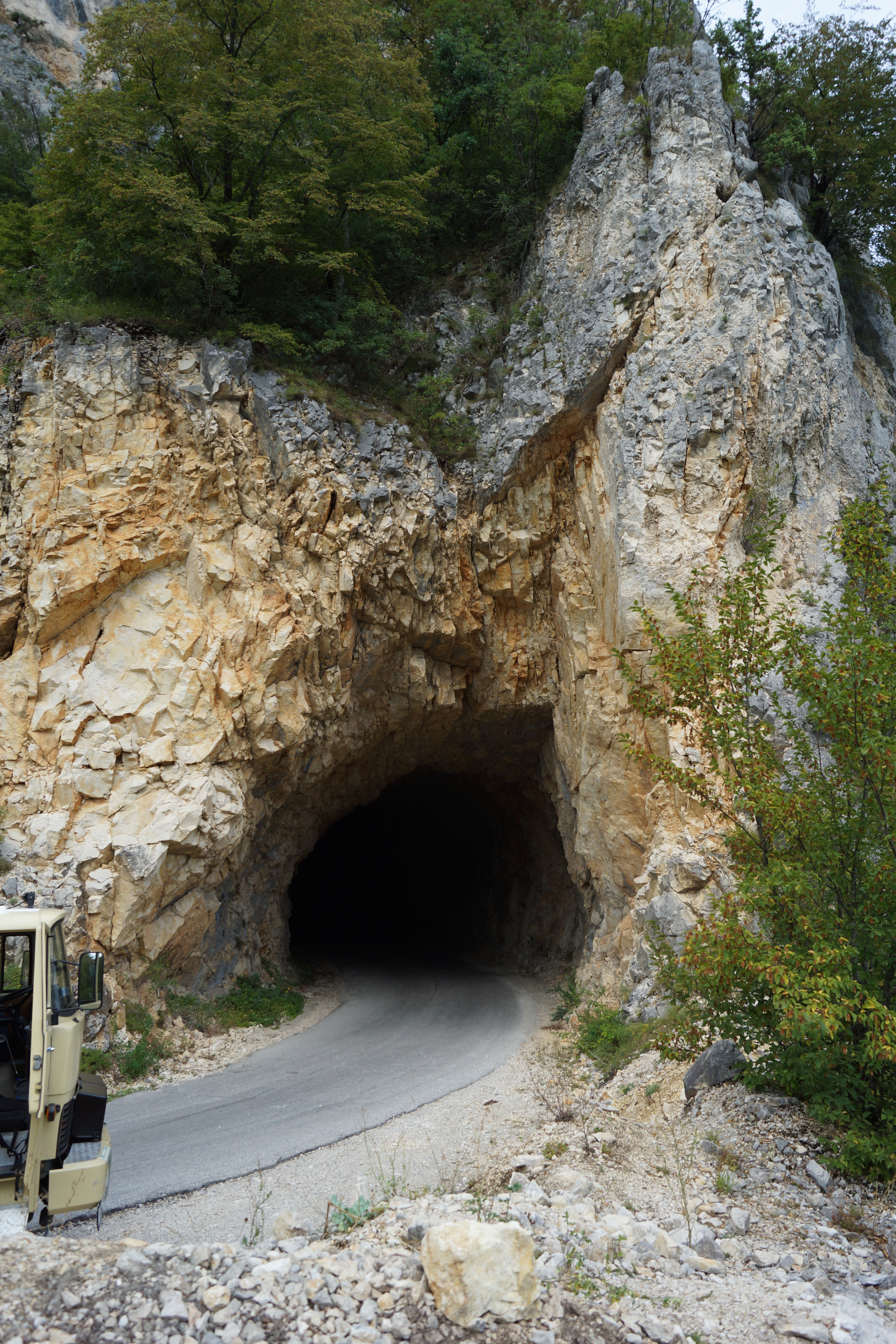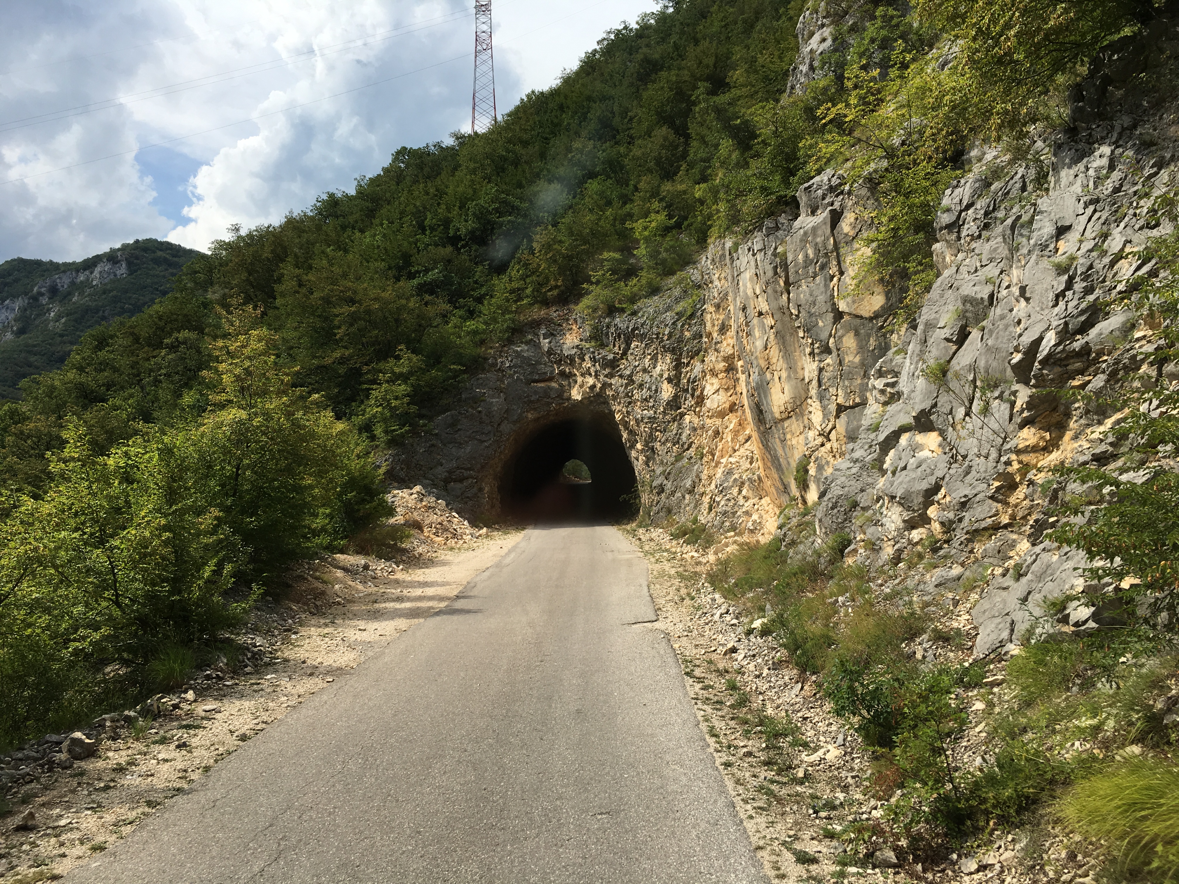Die Straße am Fluss führt uns durch atemberaubende, tiefe Schluchten und unbeleuchtete Felstunnel bis zur Abzweigung scharf links in Richtung Durmitor Nationalpark.