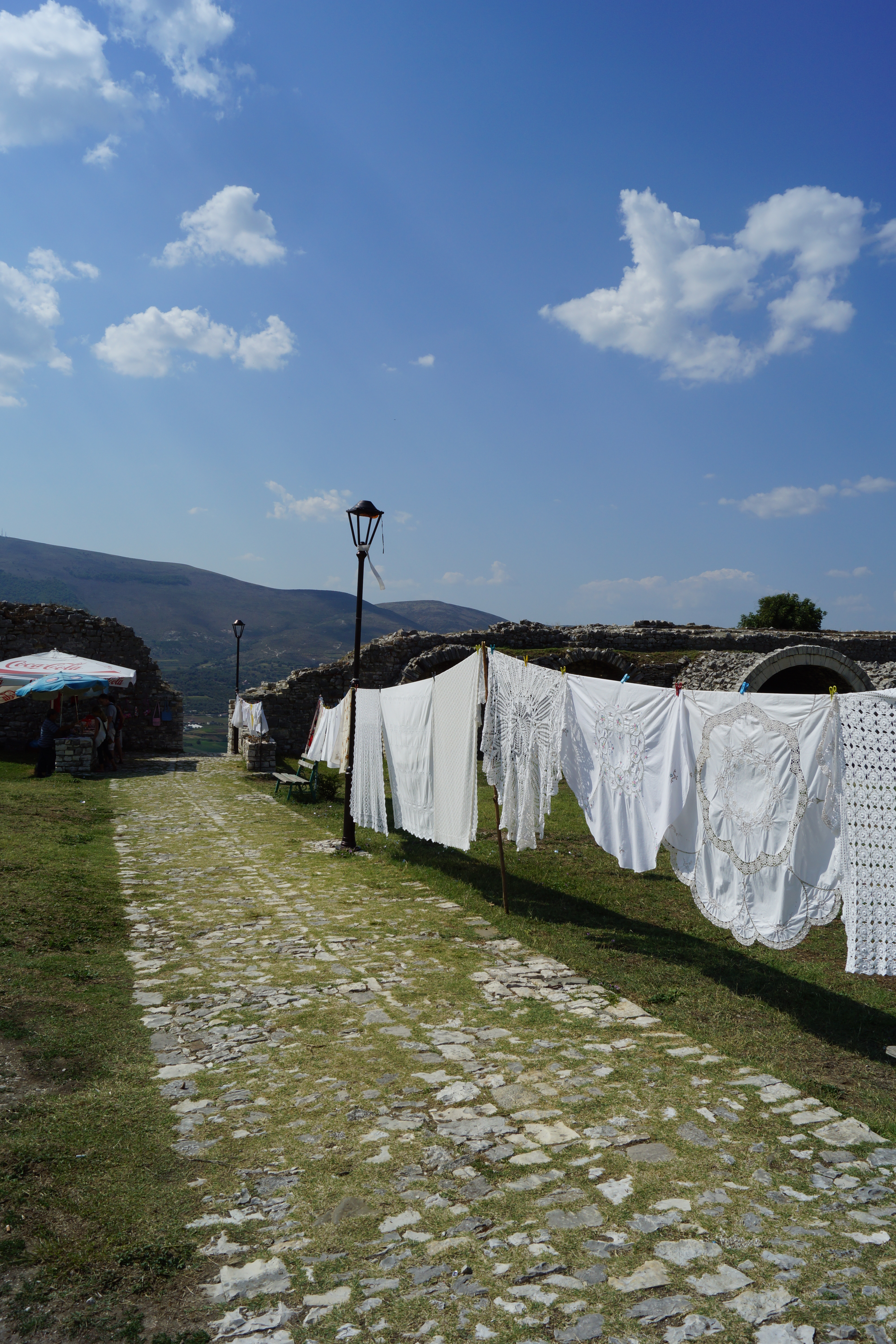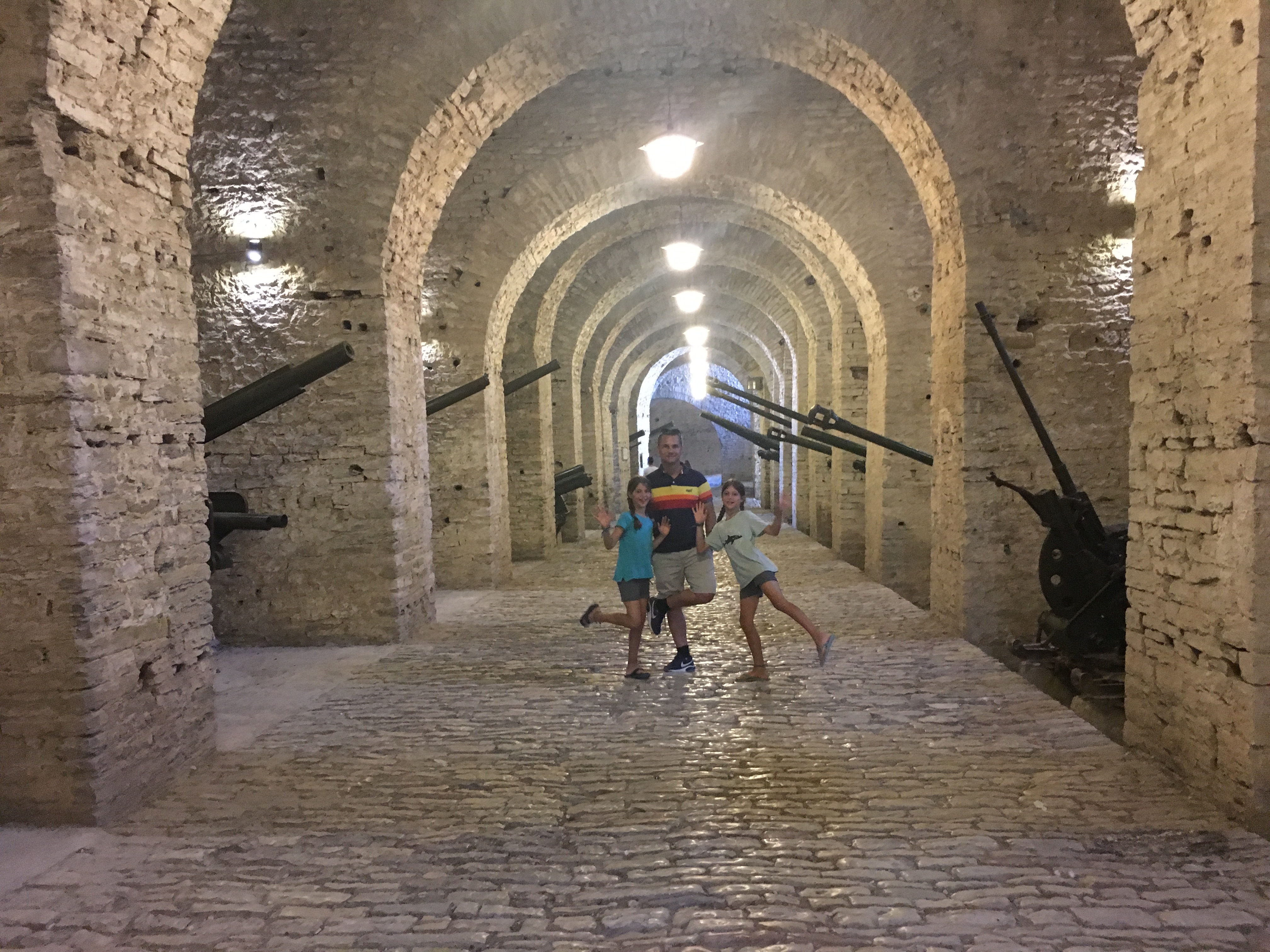 Nach endloser Suche erreichen wir den Campingplatz (www.camping-gjirokastra.com), ein Haus mit 4 Stellplätzen, erst seit 2 Wochen geöffnet. Die Inhaberin heisst uns herzlich Willkommen, zeigt uns stolz das wirklich tolle Bad und die Toiletten, das super gepflege Gelände. Wir beseitigen das Chaos in der Kabine, wenn man die Kistensicherung vergisst muss man danach eben aufräumen und die Nudeln aus dem Teppich kehren – aber kaputt gegangen ist bis jetzt trotz wilder Fahrten noch nichts! Neben uns parkt ein weiterer Gast, bzw. ein junges Pärchen – Roxana und Adrian mit deren Kindern, Sie kommen mit ihrer ausgebauten Mercedes 310 Feuerwehr aus Rumänien und wir fühlen uns gleich als Team. Mit 2 Taxis geht es in die Stadt und wir verbringen einen netten Abend bei ein paar Bier und nicht gerade kulinarischen Highlights. Dafür sind die Geschichten und Storys um so spannender und wir beschließen am nächsten Tag gemeinsam weiterzufahren. Wir starten mit einer weiteren Stadtbesichtigung in Gjirocastra, trinken einen Espresso in der wirklich tollen Altstadt mit einem türkischen Basar, kleinen Ladengeschäften und einer Moschee und besichtigen die Burg. 2005 zum UNESCO-Weltkulturerbe ausgezeichnet wirkt die steinerne Zitadelle fast bedrohlich. Die Festung überragt die Stadt und öffnet einen tollen Blick an den Bergketten entlang über die weiten Ebenen. Der Diktator Enver Hoxha erklärte seine Geburtsstadt 1961 zur Museumsstadt, ihm haben wir dann doch zu verdanken dass dieses Städtchen so gut erhalten ist.