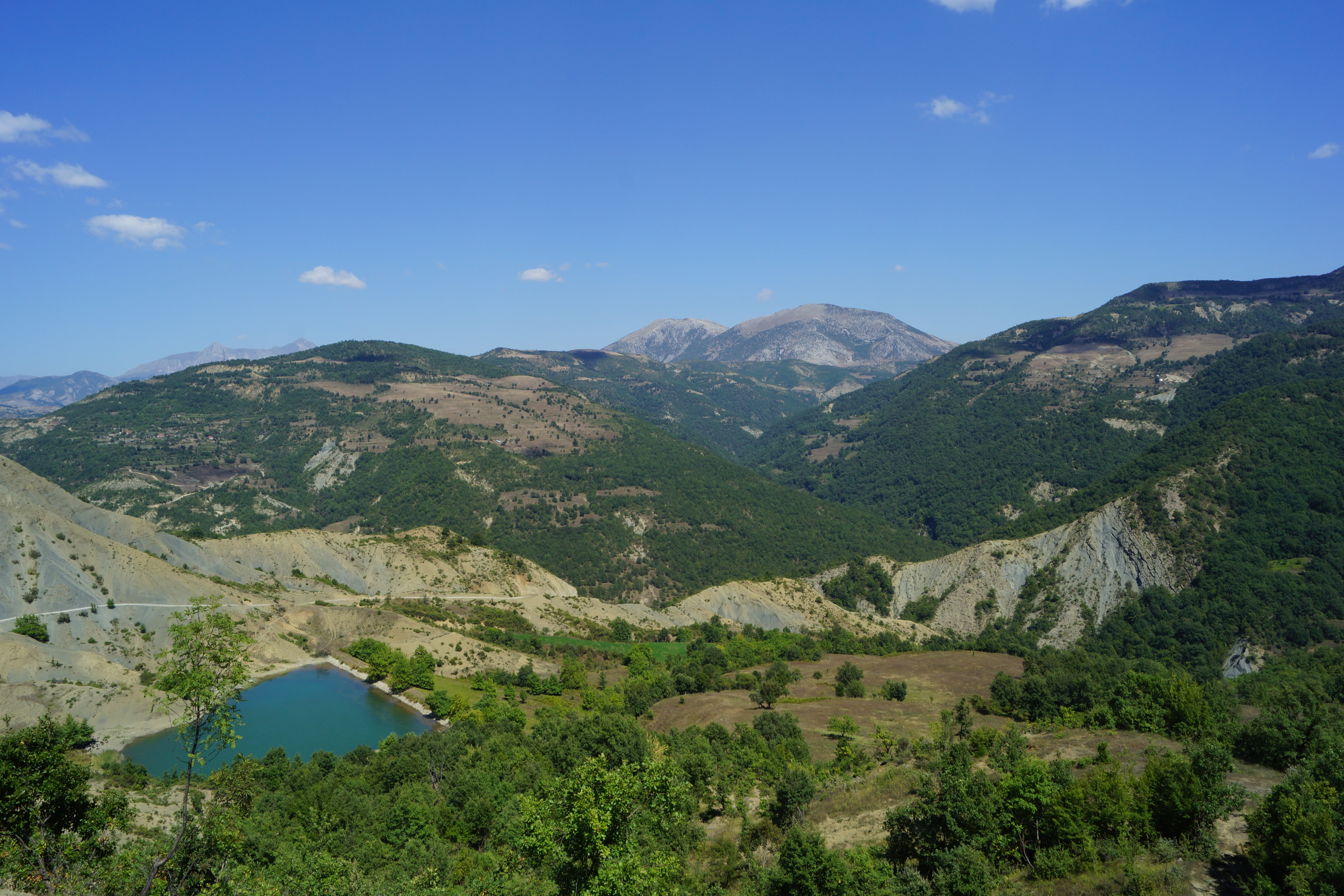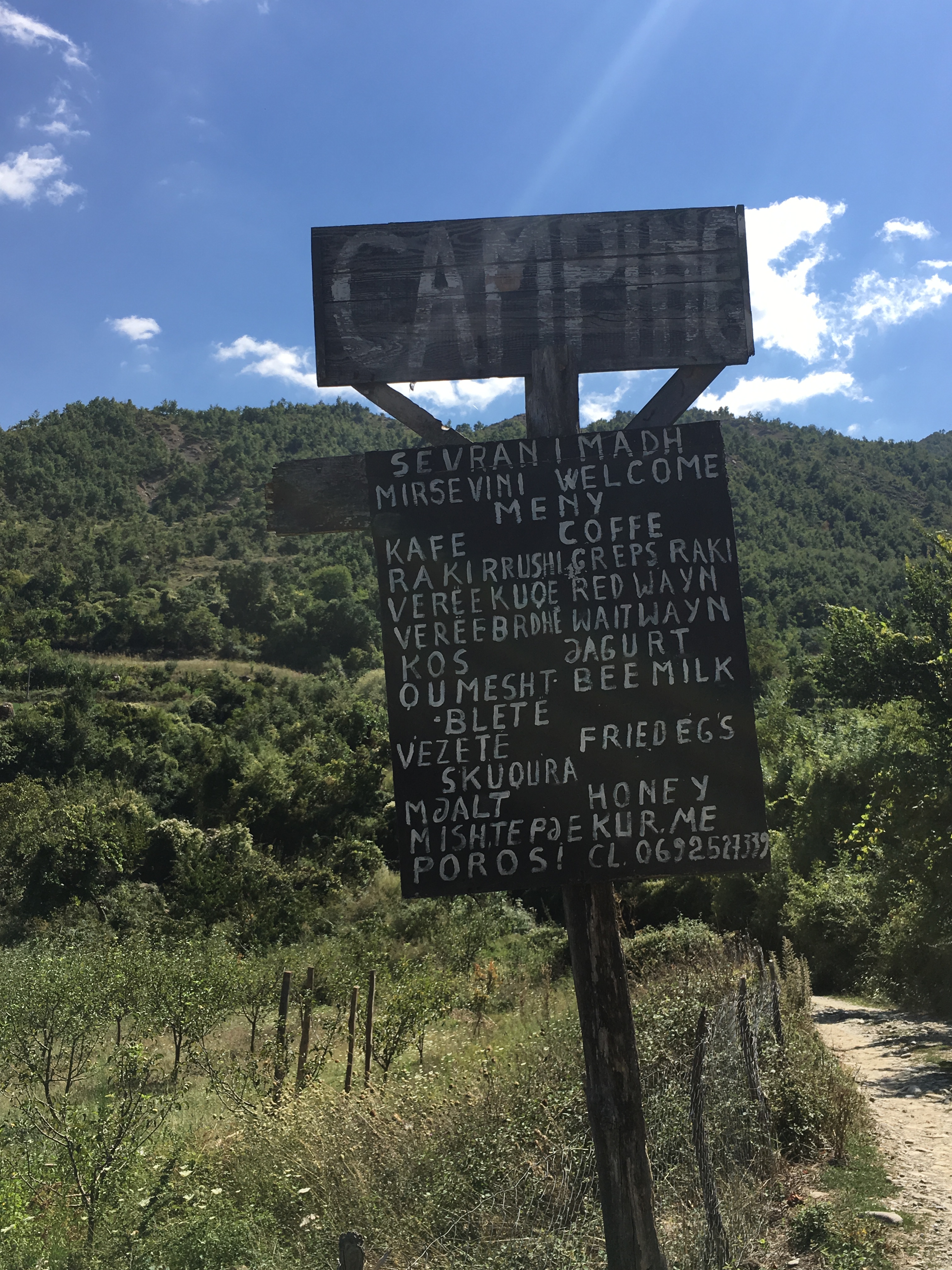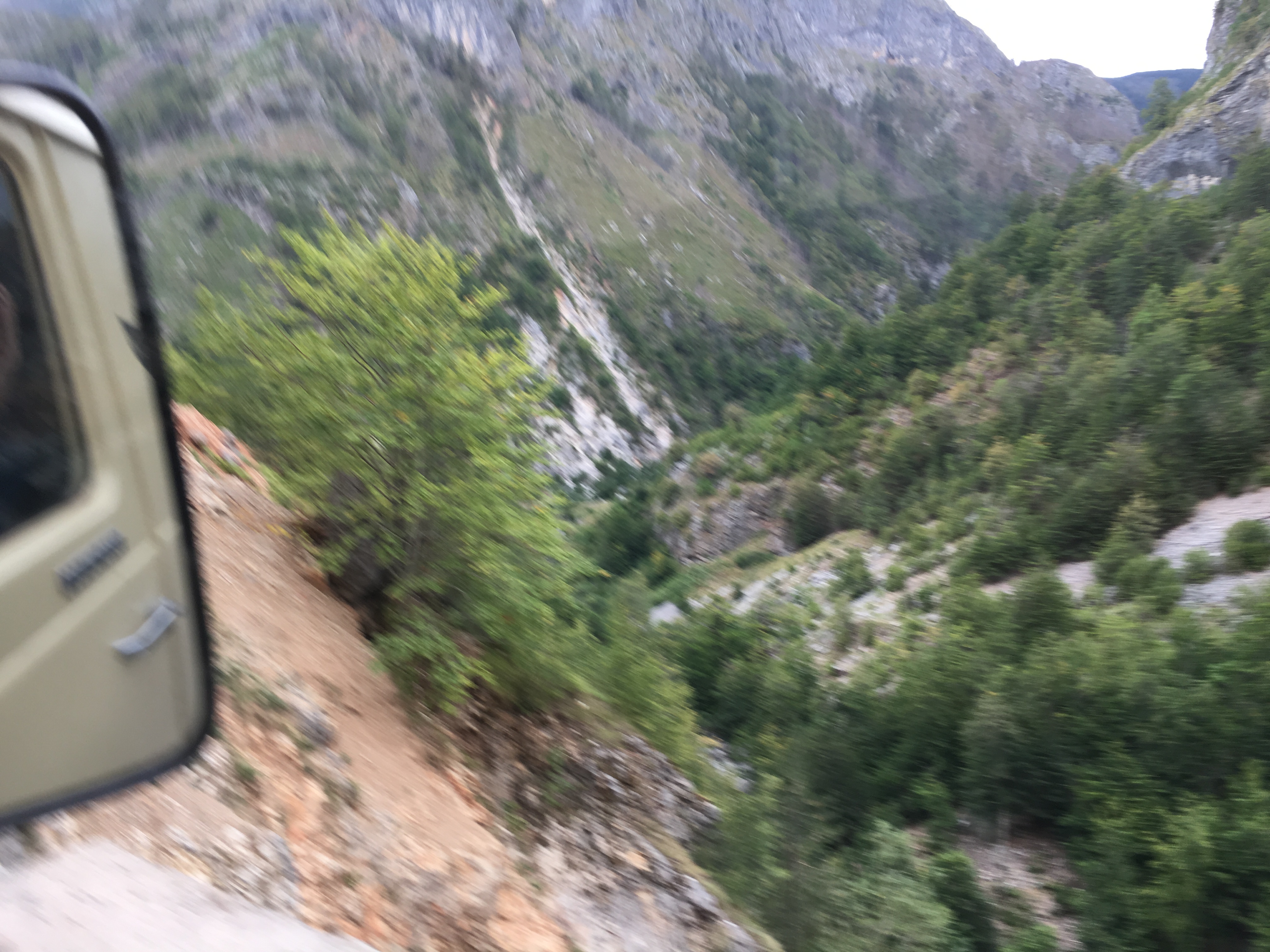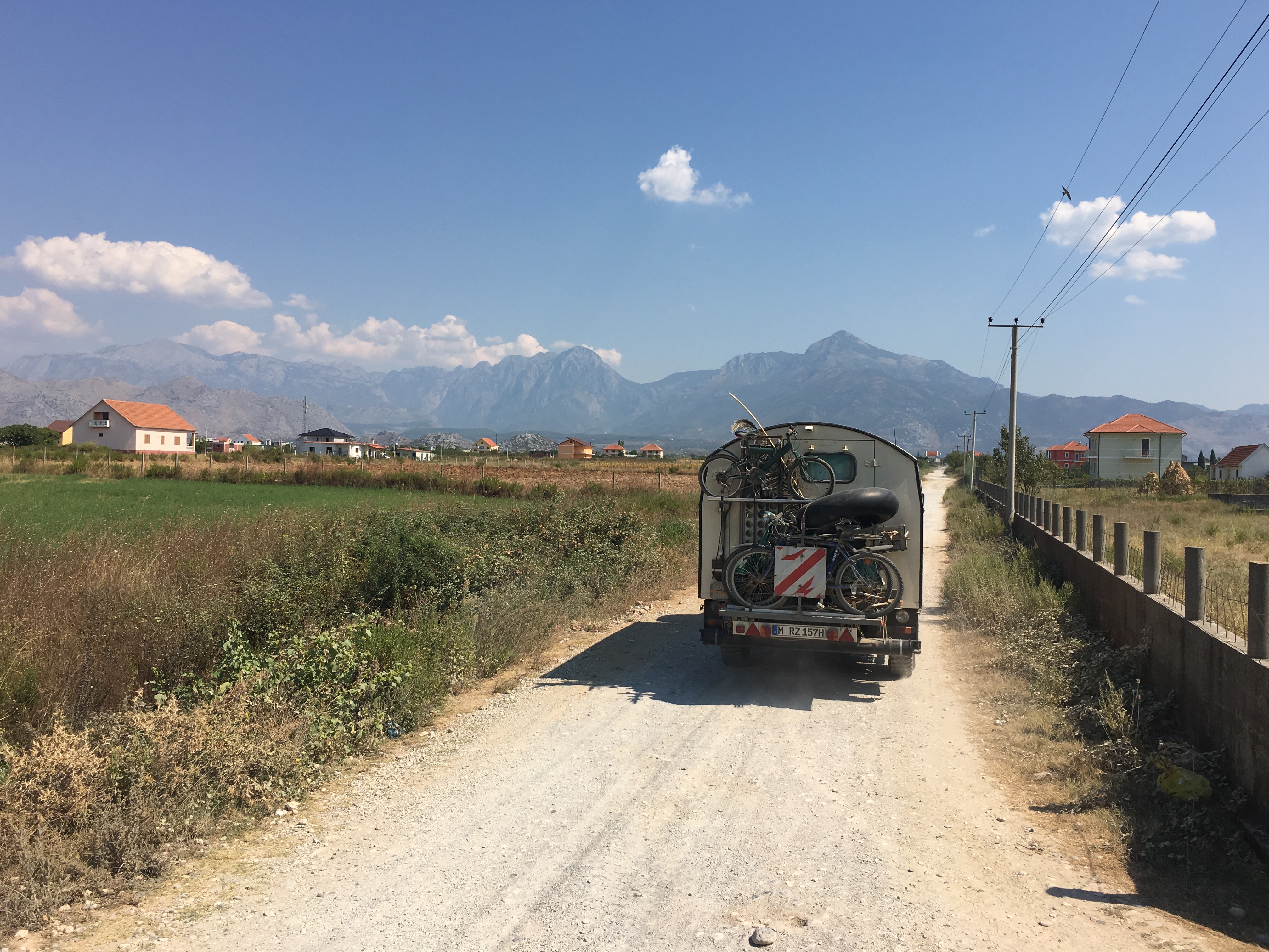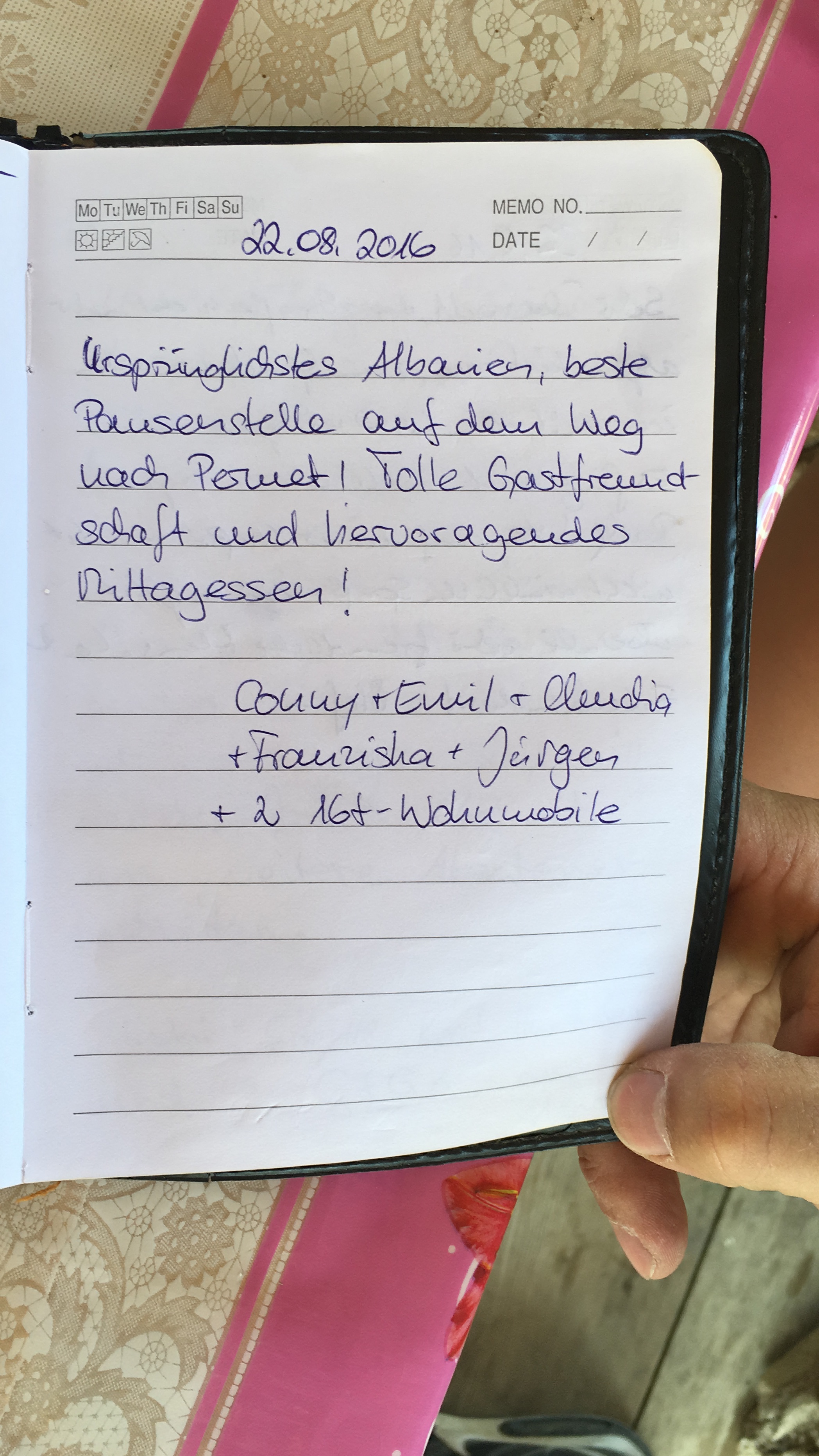 Vor lauter Aufregung rammen wir beim Rückwärtsfahren einen Kleinwagen, der nette Besitzer meinte wir sollen weiterfahren, der Wagen ist eh schon in einem recht fragwürdigen Zustand. Wir geben ihm 50 Euro um mit gutem Gewissen das Land zu verlassen. Nach 3 Stunden Fahrzeit (Zabljak – Grenzübergang) sind wir in Albanien angekommen. Die Grenzkontrolle ist sehr entspannt, wir waren nur 3 Fahrzeuge an der Grenze (anders als von vielen beschrieben, sehr freundlich und unkompliziert). Die Passdaten werden mit großer Sorgfalt von Hand eingetragen. Die Einreise nach Albanien wird uns erleichtert als der Zöllner das Stromkabel auf Durchfahrtshöhe unserer Maggy anhebt – wir können passieren. Nach 50 m Teerstraße merken wir unverkennbar – wir sind in Albanien angekommen.