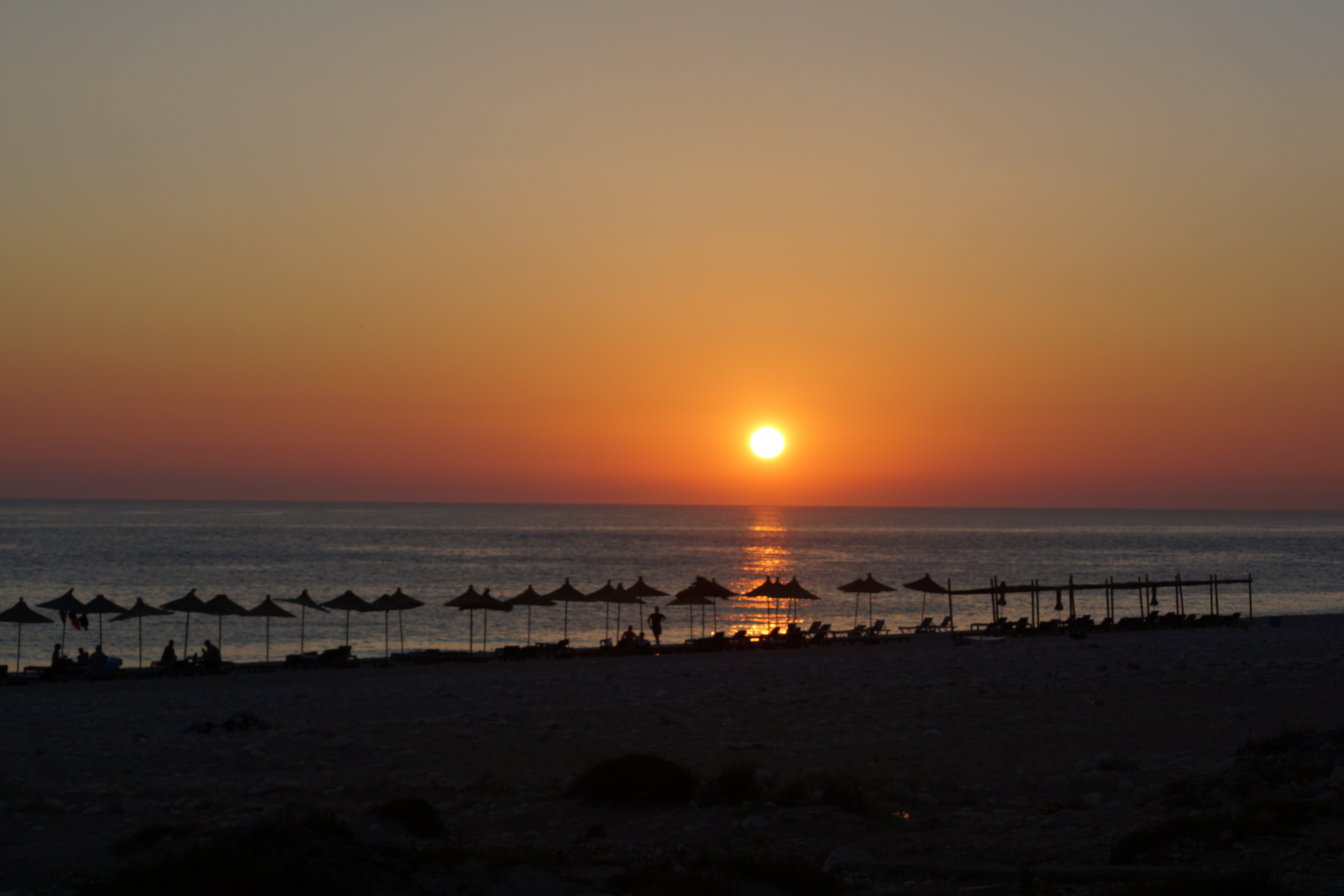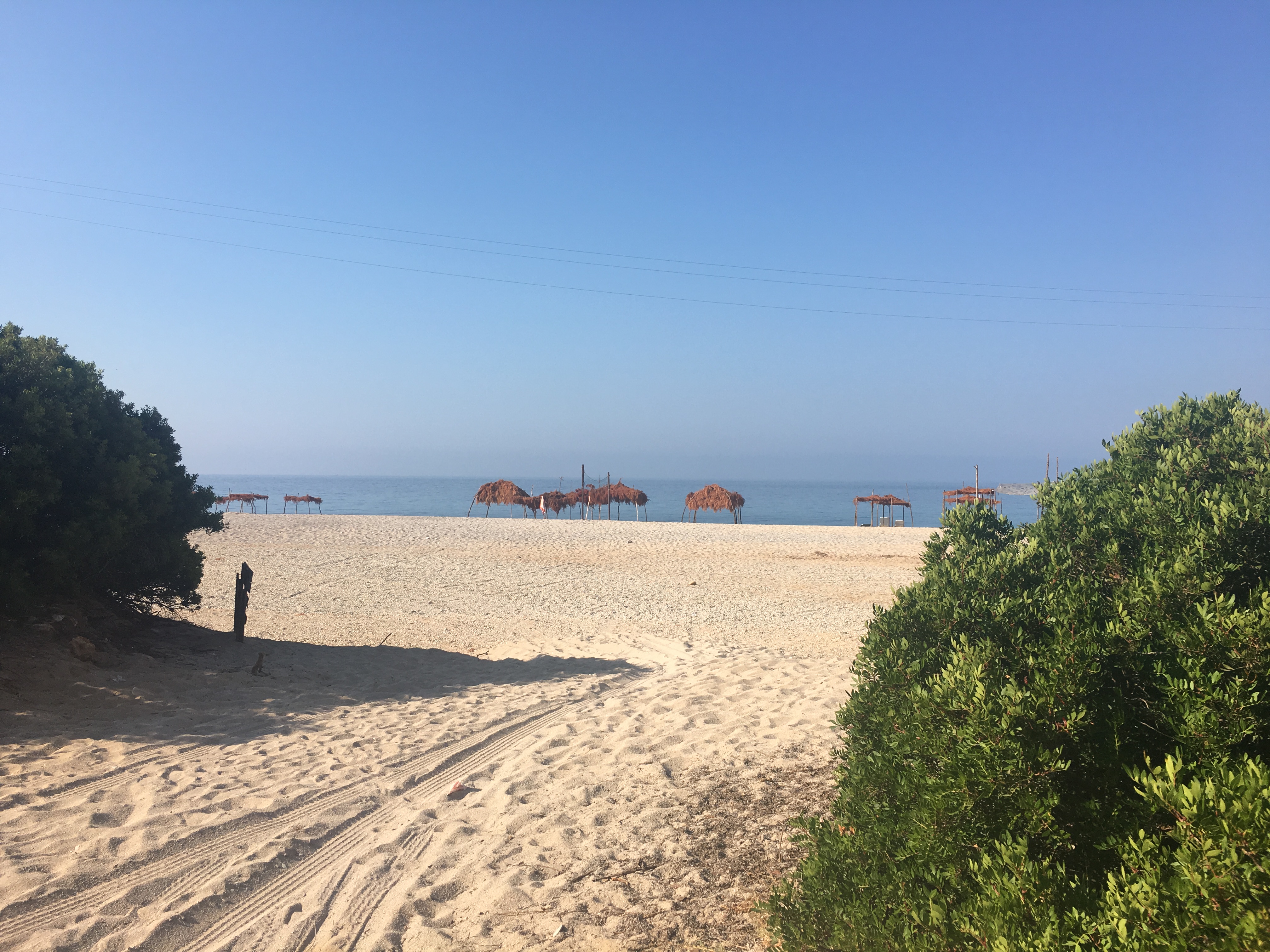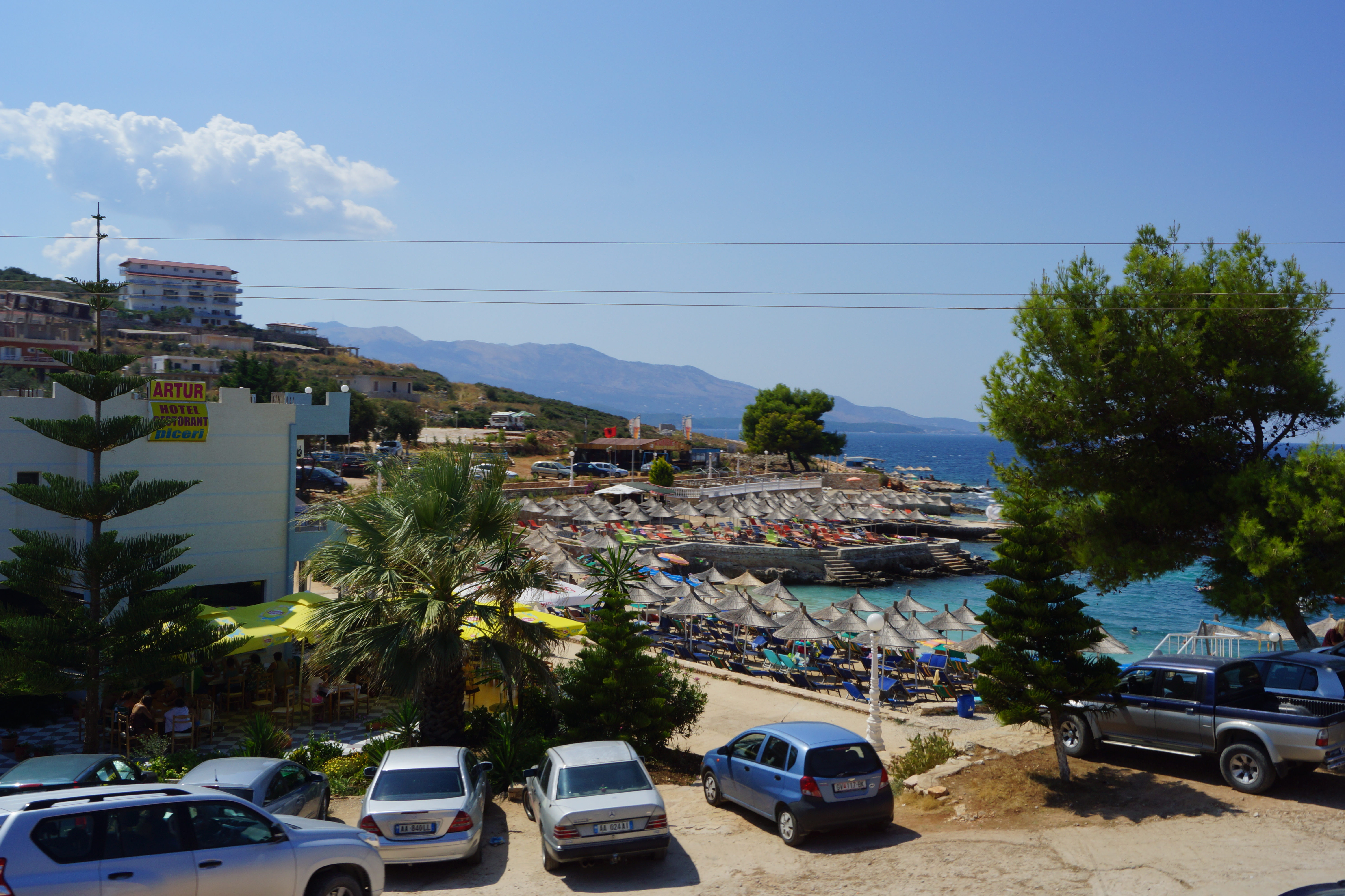 Nicht gerade ein Traumstrand mit seiner riesigen, im Bau befindlichen, Anlage im Rücken, außerdem ein beschirmter Strandabschnitt am Anderen. Eine riesen Disco und jede Menge Bars. Aber noch kein fest gemauertes Gebäude außer einer Toilette. Wir beschließen erst einmal ins Meer zu springen. Die Mieterin des Parkplatzes spricht sehr gut deutsch und ihr Vater gut italienisch. Wir können uns also ohne Probleme verständigen. Später stellt sicher heraus, dass sie den Platz gepachtet hat, ihr Deutsch nur aus dem Fernsehen und einem Buch gelernt hat und alles dafür tut den Müll vom Strand zu schaffen. Der Platz kostet uns 5 Euro am Tag, zwei Strandliegen kosten 500 Lek (3,60 Euro). Wir schwimmen und schnorcheln im türkisblauen Wasser und genießen die relaxte Stimmung. Gegen Mittag gehen wir einen Pizza essen und erkunden die Bucht.