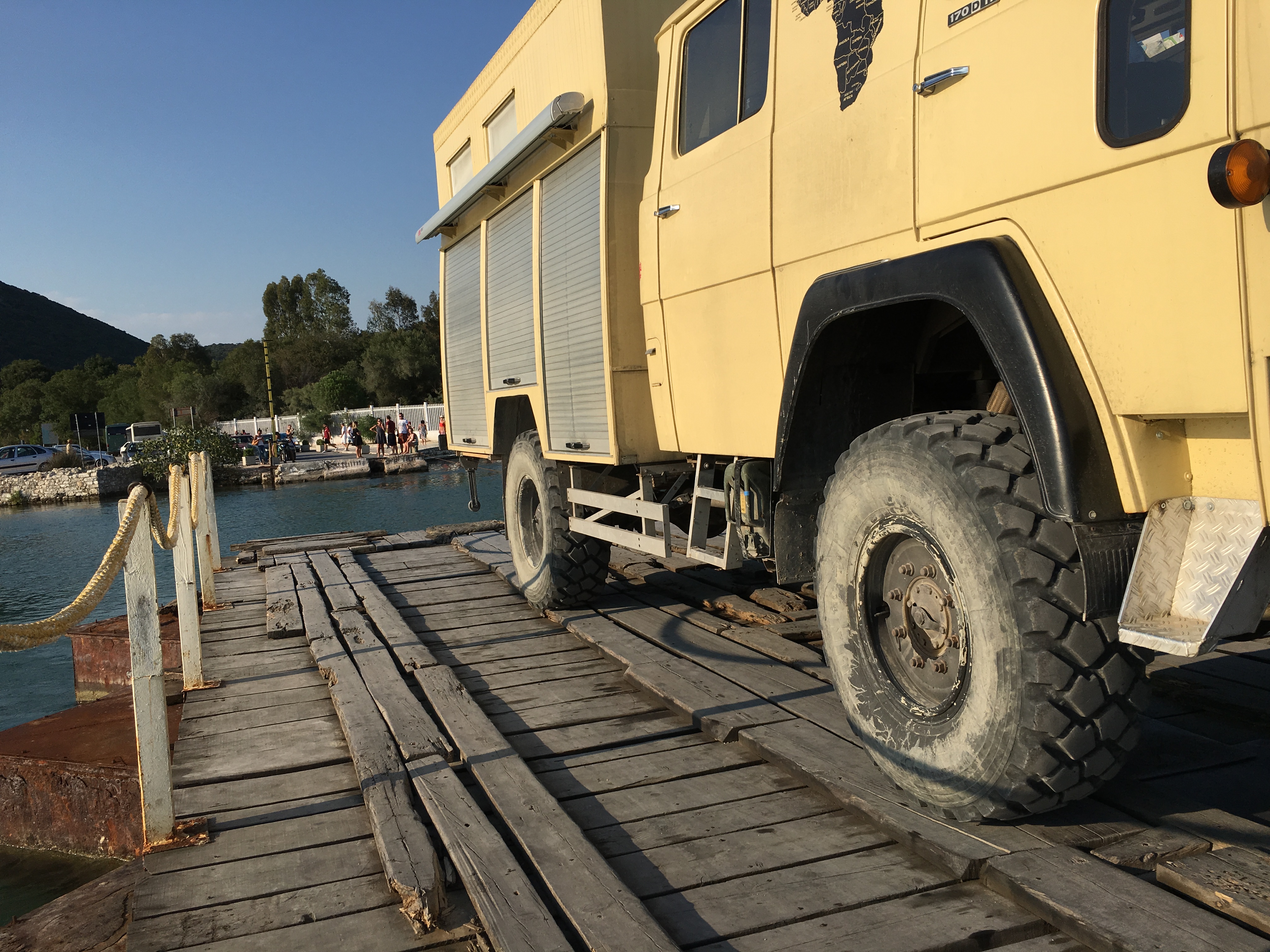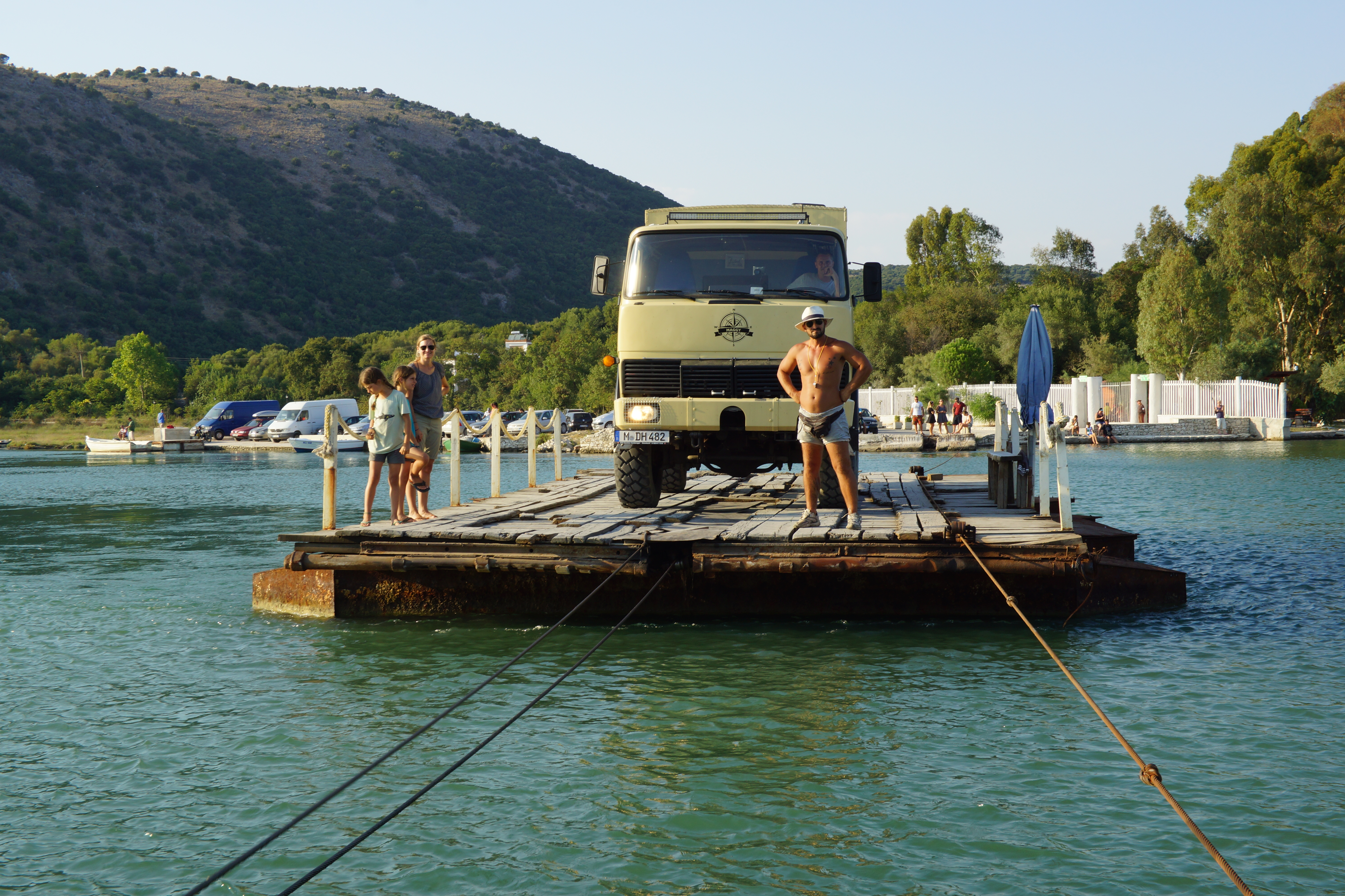 Wir stärken uns im Restaurant beim Nationalpark, die Kinder sind von einem kleinen Kätzchen und Welpen hingerissen, wir genießen Linguini Scampi und Salat. Zügig geht es weiter zu einem Traumstrand. Adrians Freund hat ihm davon berichtet, es ist der schönste Strand an der Rivieraküste. In zweieinhalb Stunden müssten wir es schaffen, es ist schon spät und die Zeit rennt, wir müssen vor dem Dunkel werden ankommen. Um etwas schneller zu sein nehmen wir die Fähre beim Park. Ein Floß mit Holzplanken bringt unsere Maggy über den Fluss, ein wirkliches Ereignis. Wir sind am südlichsten Punkt unserer Reise angekommen, nur noch 5 km, dann wären wir in Griechenland. Für uns ist es der Wendepunkt.