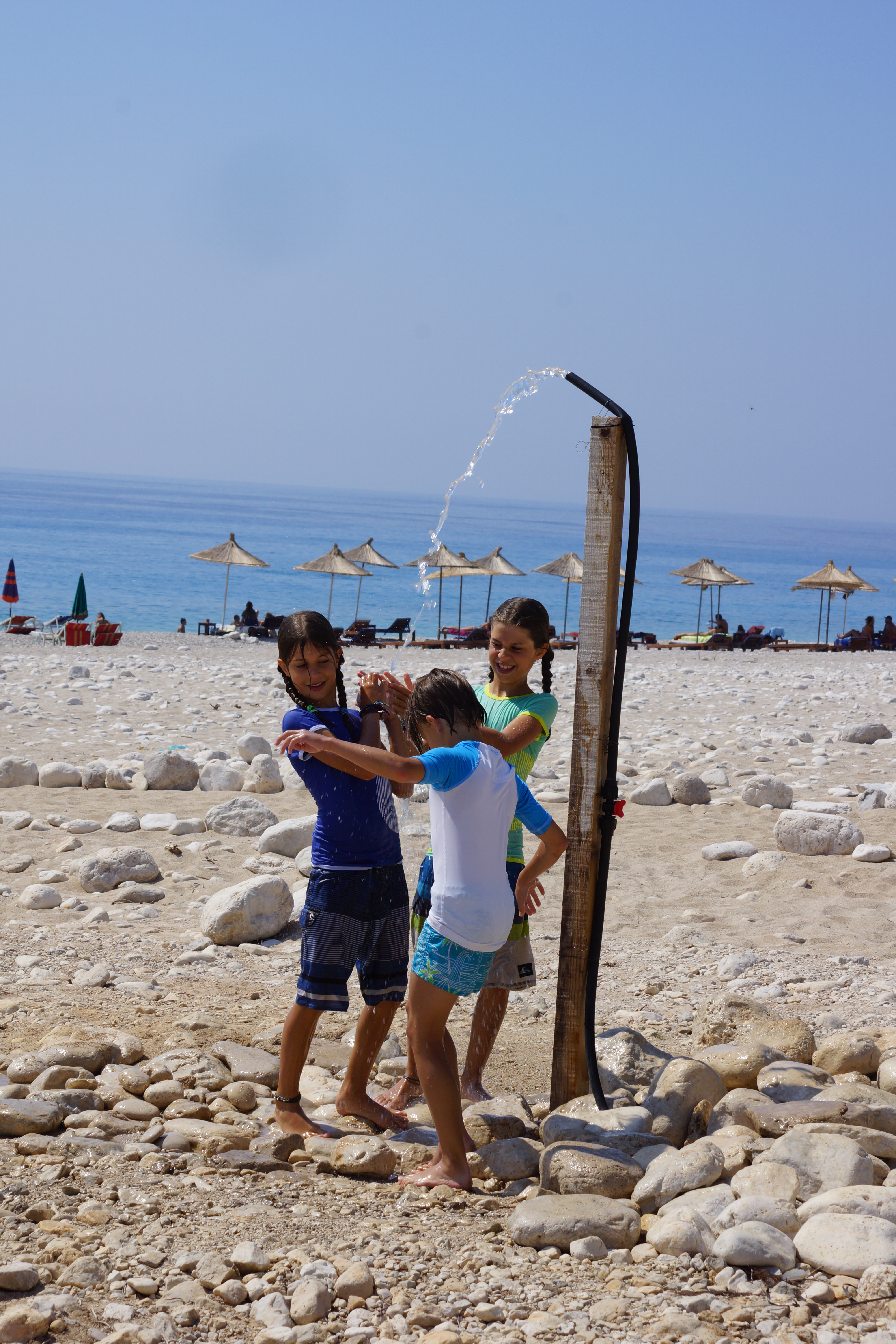 Seit einigen Jahren ist Albanien im Wandel, das Land wird aufgebaut und von der EU und UN unterstützt. Viele Flüchtlinge kehren zurück und nehmen den Westlichen Einfluss mit um ein schönes, friedliches Albanien zu schaffen. Der Tourismuss nimmt mehr und mehr zu und man versucht schöne Orte zu schaffen. Nicht leicht, die Müllentsorgung lässt zu wünschen übrig, nur in Großstädten gibt es eine Müllabfuhr, oft werden die Abfälle in Löcher geschmissen und zugegraben oder einfach verbrannt. Entsprechend werden vom Meer ganze Müllberge an die Strände gespült. Die Menschen werfen ihre mitgebrachten Sachen einfach in die Wiese oder lassen sie liegen. Ähnlich verhält es sich mit Wasser und Strom. Während des Kommunismus musste man dafür nicht bezahlen. Das Wasser wird einfach laufen gelassen. Wir treffen viele Albaner, besonders in den touristischen Regionen, die ihre Natur und ihr Land lieben, wir erzählen ihnen von Beach-Cleaning-Aktionen in Frankreich, Portugal und Spanien, von Surfern auf der ganzen Welt, die immer eine Mülltüte dabei haben wenn sie an den Stand gehen. So haben wir auch hier angefangen zusammen mit den Albanern das wohl erste offizielle Beachcleaning zu starten. Mal sehen ob es fruchtet – es scheint wie ein Tropfen auf den heissen Stein, aber wer weiss.