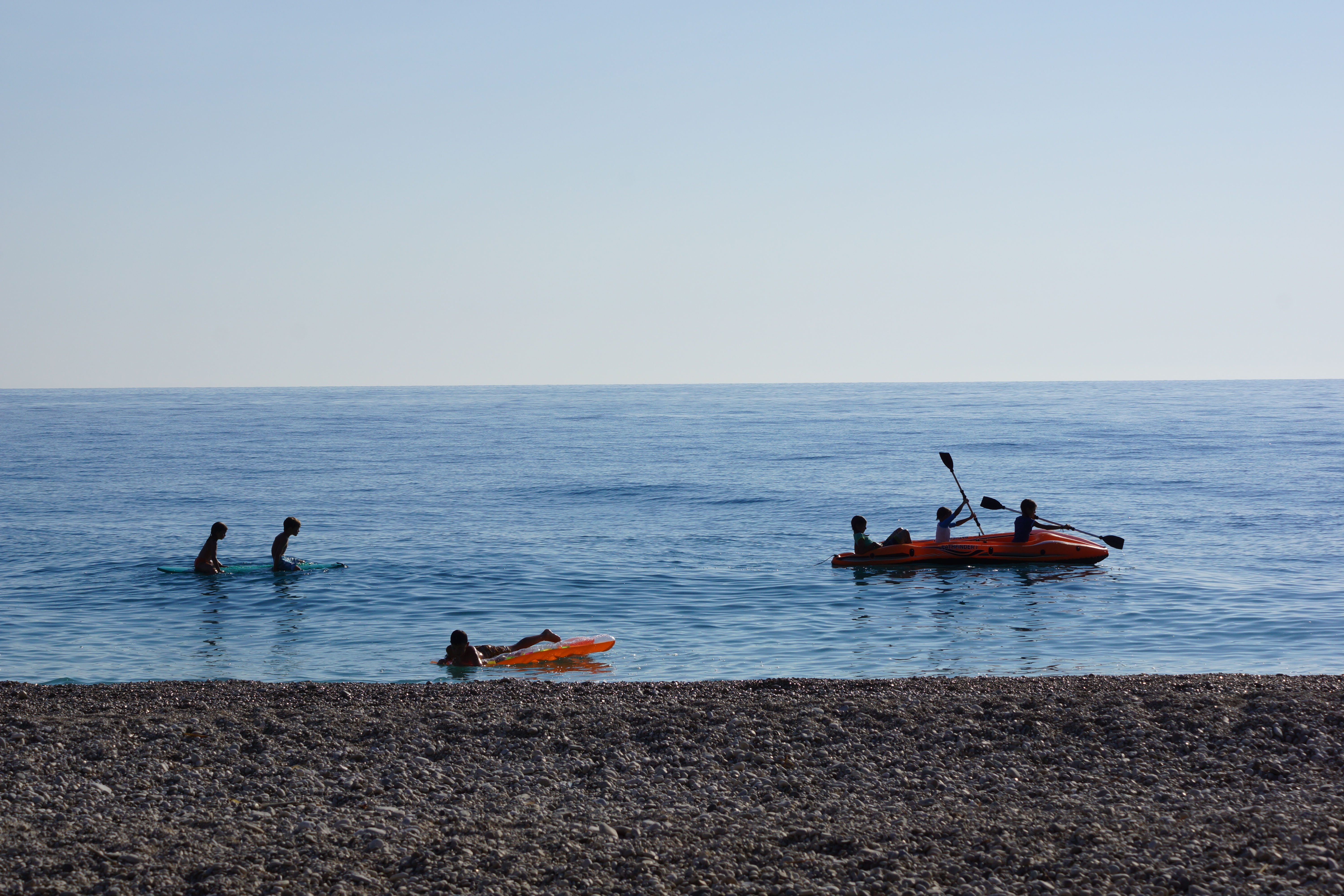 Es folgen einige Strände, die uns gar nicht zusagen – viele Touristen, Sonnenschirme, Liegen, volle Parkplätze und schreckliche Hotelanlagen. Wir landen mitten einem Konvoi mit Staatkarossen und landen schließlich an dem letzten Strand bevor uns die Passstraße wieder über die Berge führt. Am Palas Beach werden wir in den Parkplatz gewunken.