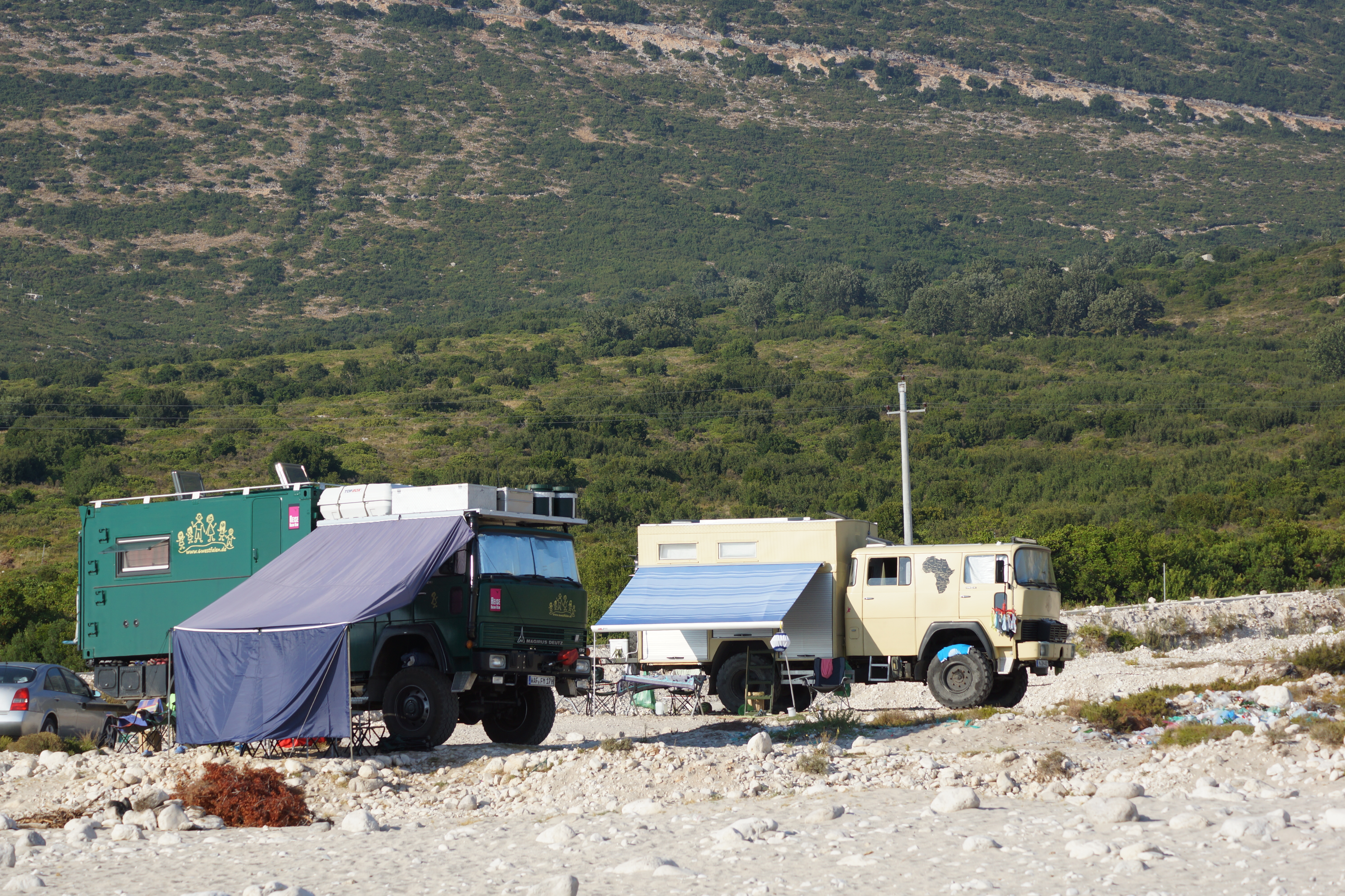 Bei Dämmerung und Sonnenuntergang fahren wir die wunderschöne Küstenstraße entlang. Ziegen, Esel und Schweine lassen uns immer wieder bremsen, aber auch die egoistischen Albaner, die halsbrecherische Überholmanöver wagen, lassen uns immer wieder den Kopf schütteln. Eigentlich seltsam dass wir noch keinen einzigen Unfall gesehen haben. Dank Adrians Funkgeräte bleiben wir in Kontakt. Meggy ist etwas laut, ich kann nur Fetzen durch das Funkgerät verstehen. Die Rumänen sind schon auf dem Weg nach unten zum Traumstrand.