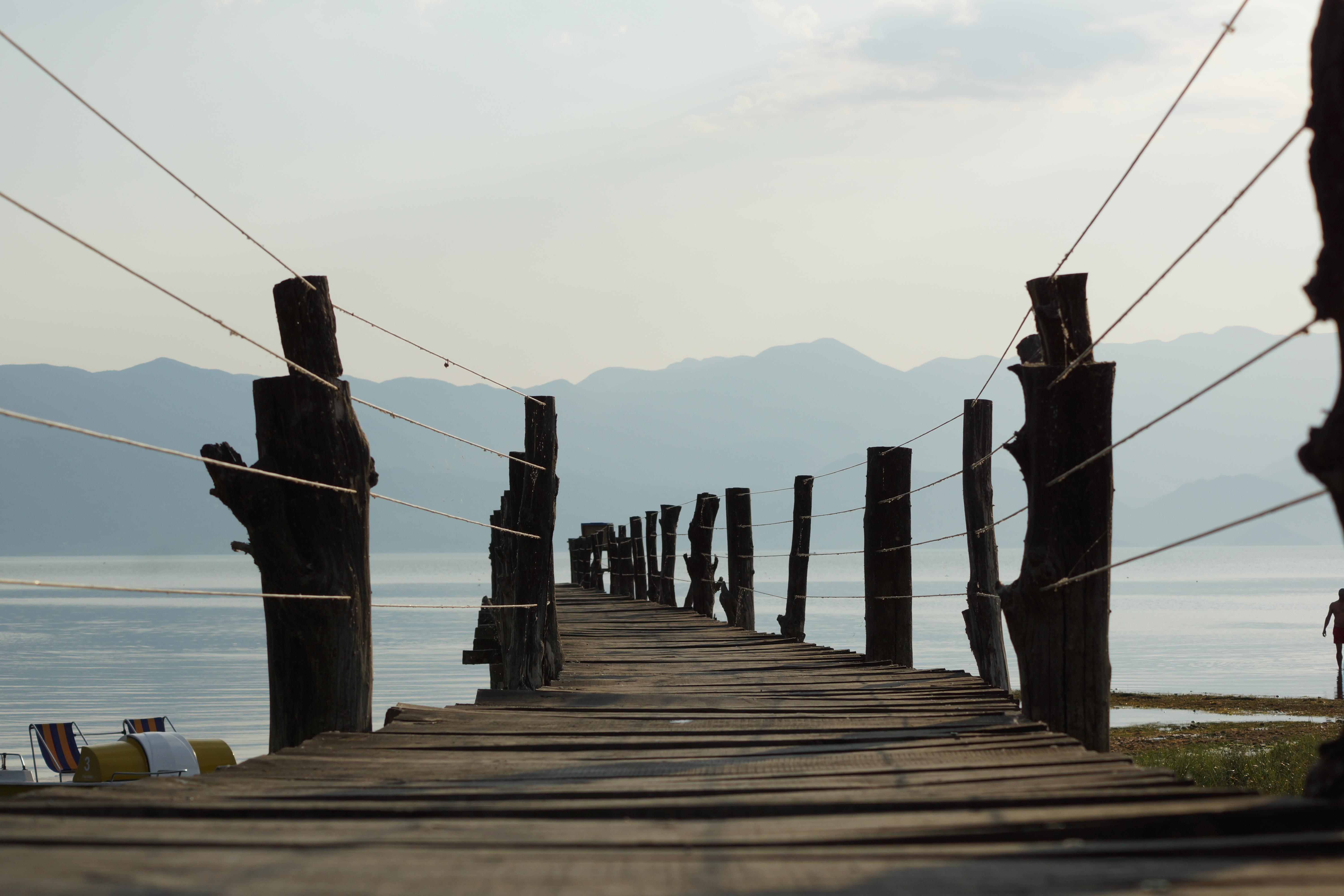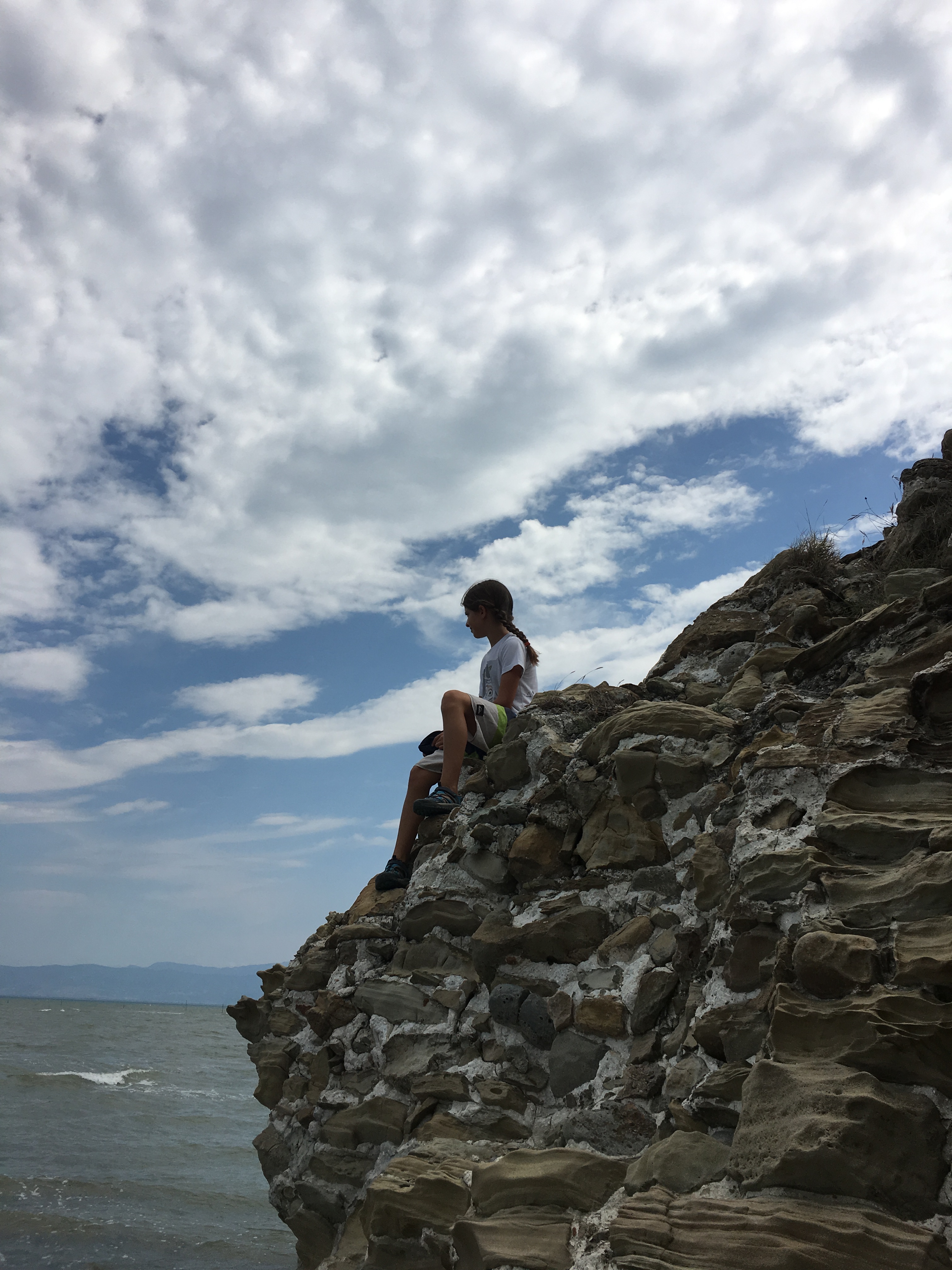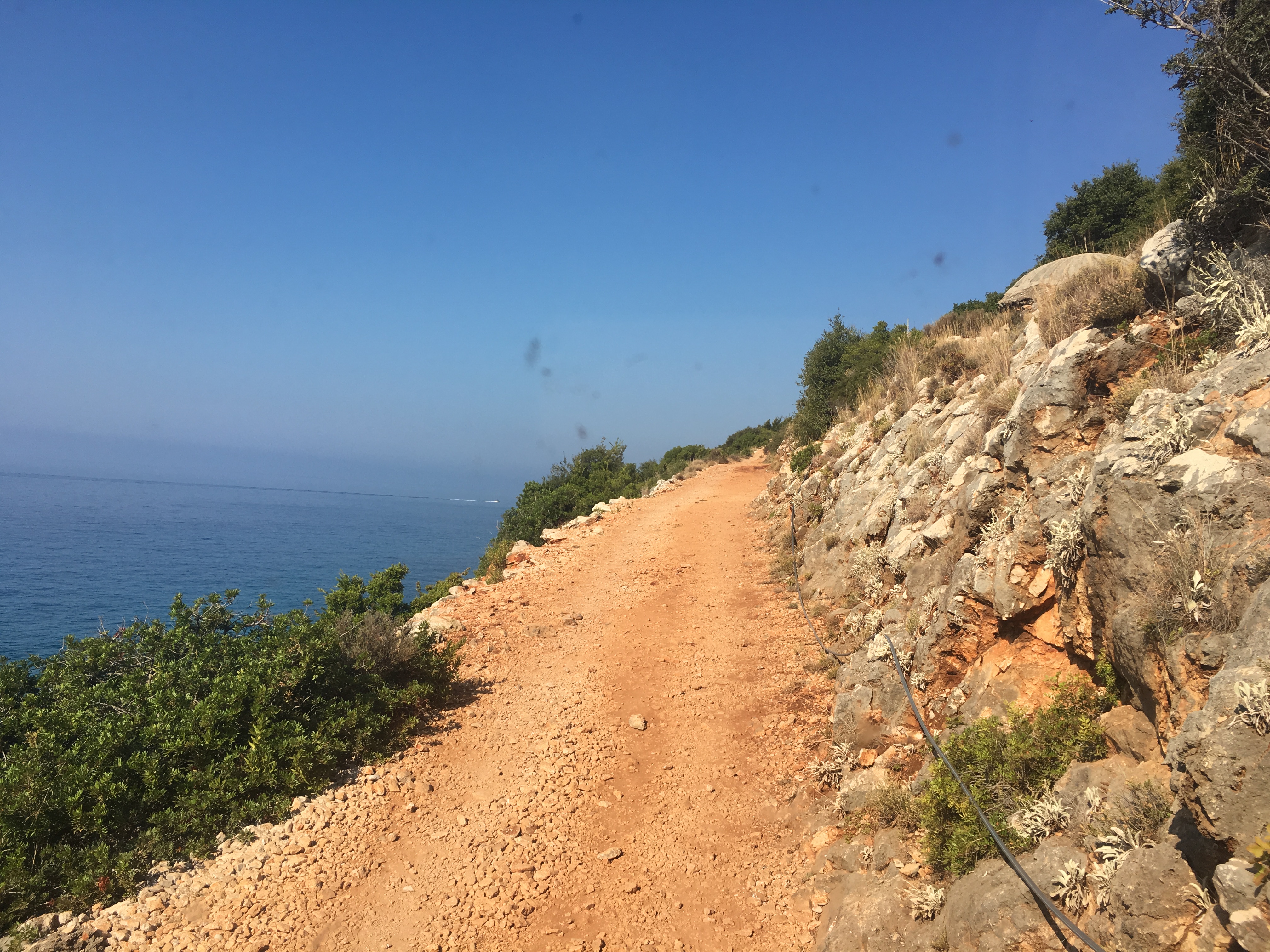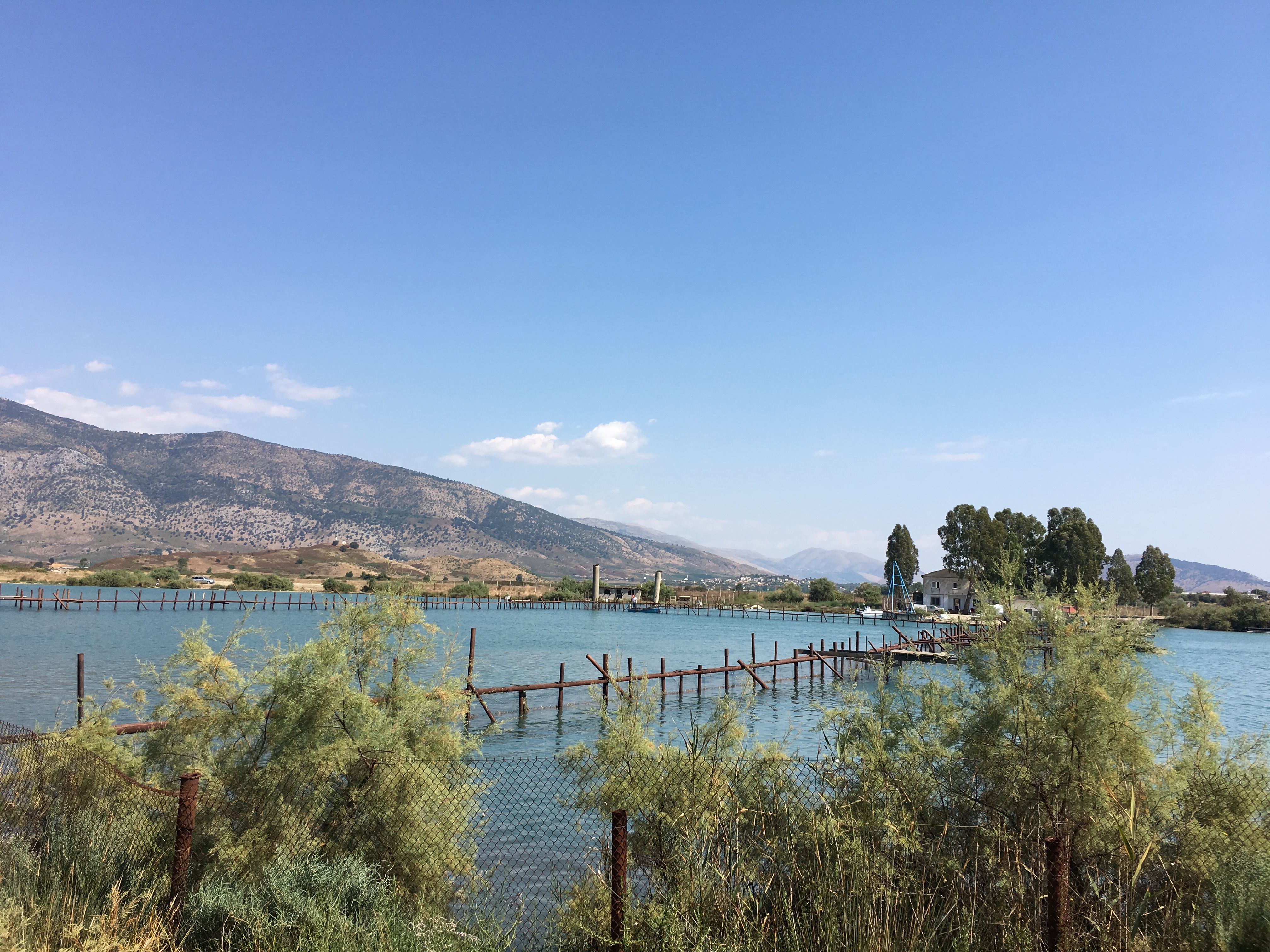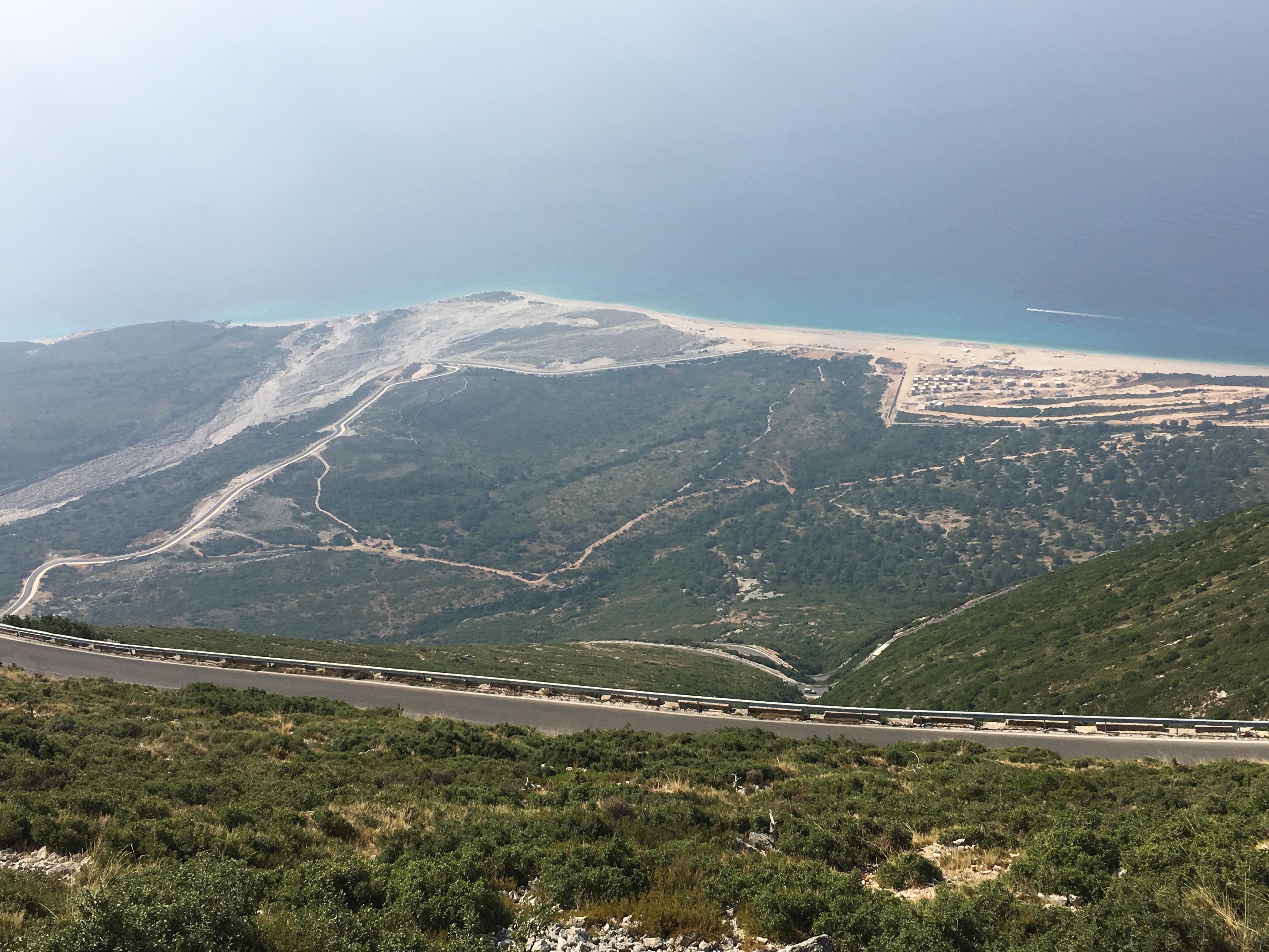 Wir wollen Meer, raus aus den Bergen. Wir sagen den Kühen, Schafen und Feen im Hochland ade. Die nagelneue Straße führt uns in Richtung Shkodra – der weite Blick von oben über den See eröffnet eine neue Landschaft. Das Klima wird mediterraner, wir kommen langsam ins Schwitzen, die Zeit der kühlen Bergluft ist vorbei. Wieder einmal wollen wir Strecke machen und vergessen dass es Mittag ist, wir uns stärken sollten und uns dem Ziel nähern. Eine alte Römerstraße Richtung Küste trug nicht gerade zur Entspannung der hungrigen Lage bei. Auf der ersten Hälfte eine abenteuerliche Herausforderung, in der 2. Hälfte jedoch die Frage/Feststellung „ich bin mir nicht sicher ob ich das so toll finde“. Es war aber doch toll, gerade weil es nicht klar war, ob wir bis zur nächsten Verbindungsstraße kommen und es war auch nicht sicher ob uns die Brücke tragen wird. Der rettende Ort mit Blick über die Küste, einem Restaurant mit hervorragendem Fisch, frischem Brot und Salat macht die letzte Etappe zum Kap Rhodon zu einem Spaziergang.