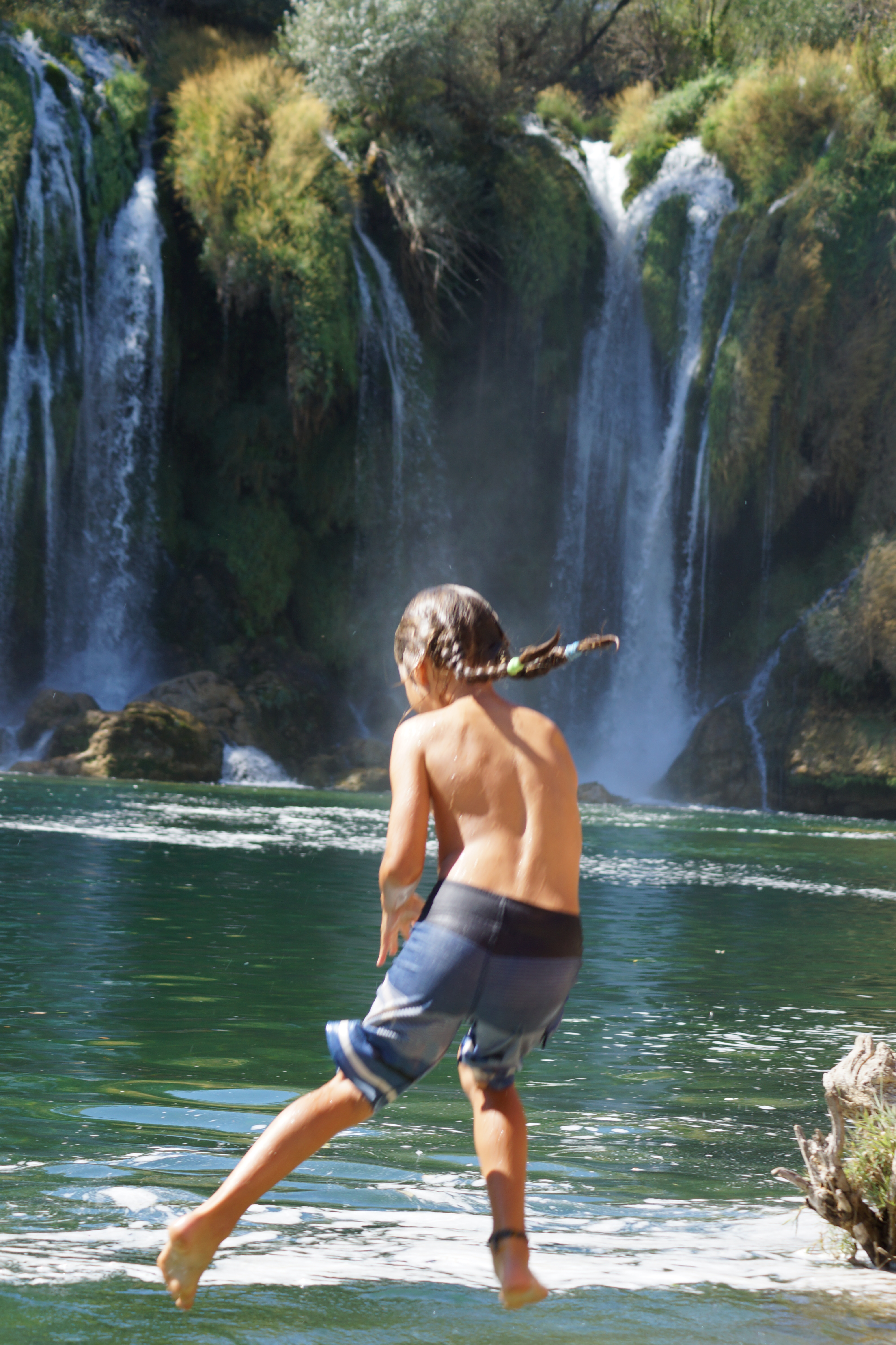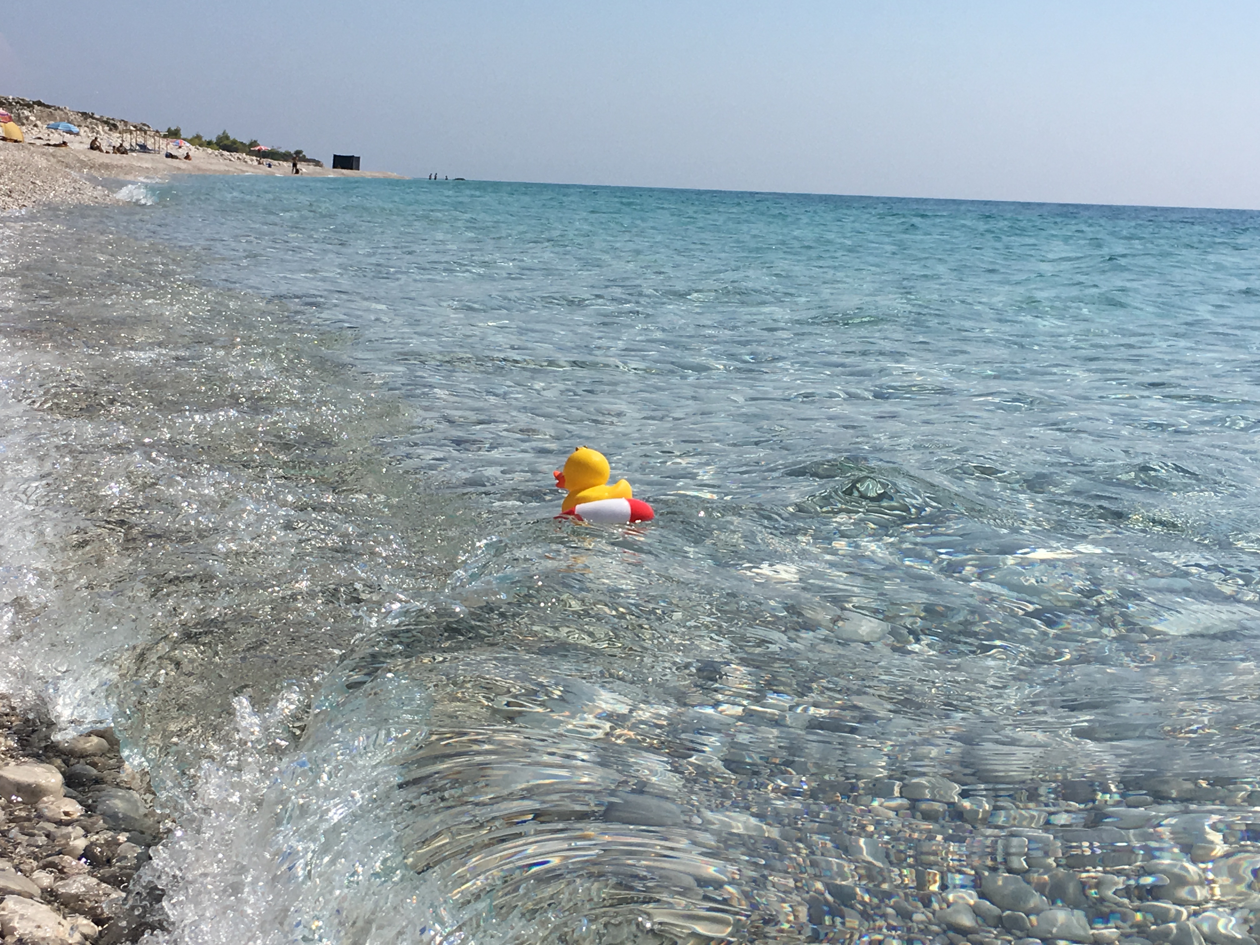 Nach einer Abkühlung im eiskalten Wasser werfen wir noch einen letzten Blick auf die Wassermassen, die sich über grüne Gräser, Büsche und Felsen in die Tiefe stürzen. Im kristallklaren Wasser entdecken wir Wasserschlangen und Fische. Ein lohnender Zwischenstopp auf dem Weg ins nächste Land. Kroatien, das schroffste, felsigste Land das ich kenne, mit seinen perfekten Autobahnen und überfüllten Ferienorten. Es ist langweilig auf den Straßen, wir vermissen die entgegenkommenden Autos auf dem Standtreifen, die Schafe und Esel am Straßenrand und kein einziger Fußgänger ist auf der Autobahn zu sehen. Nach drei Stunden kommen wir am angepriesenen Campingplatz „Romantica“ an.