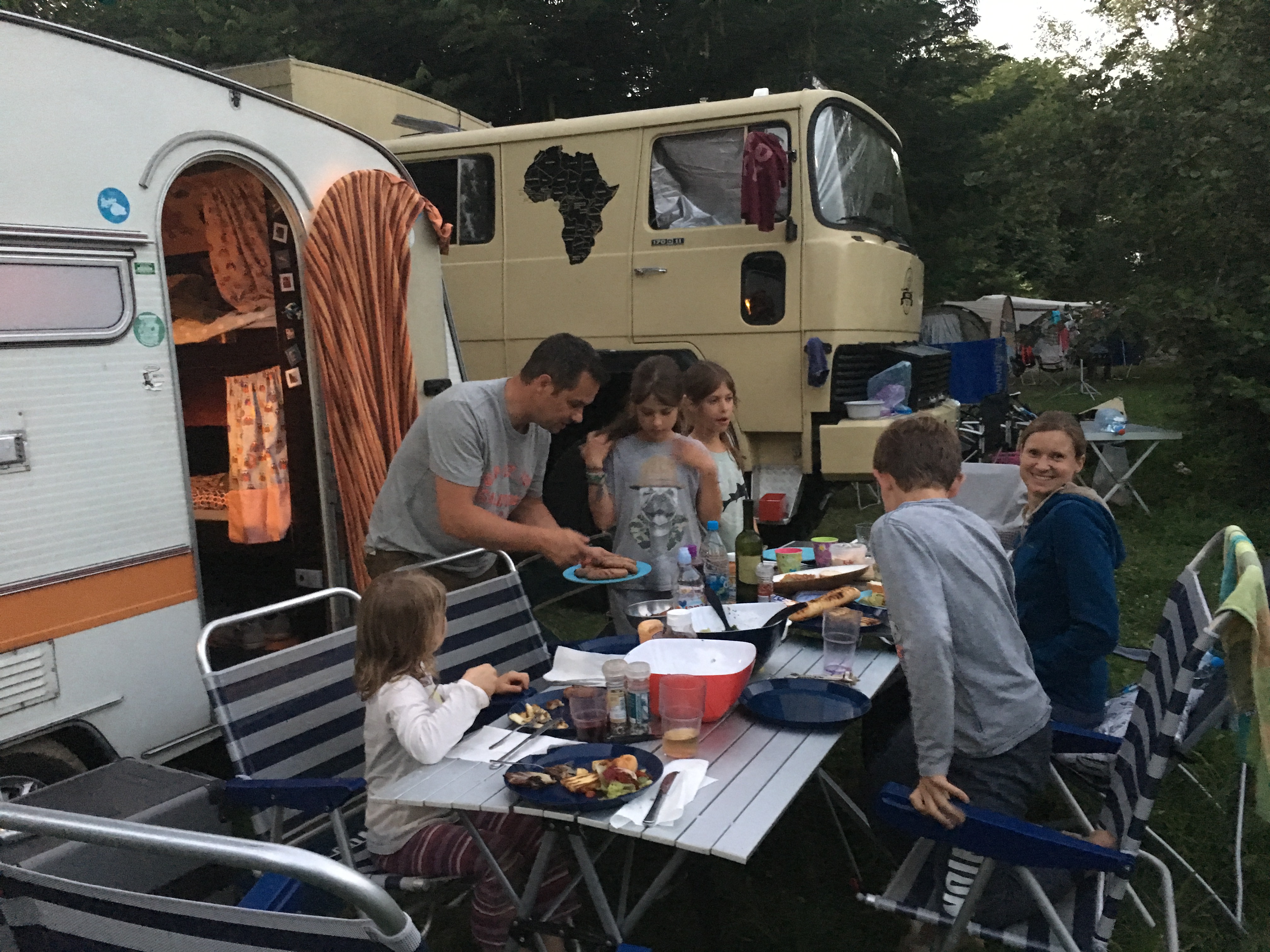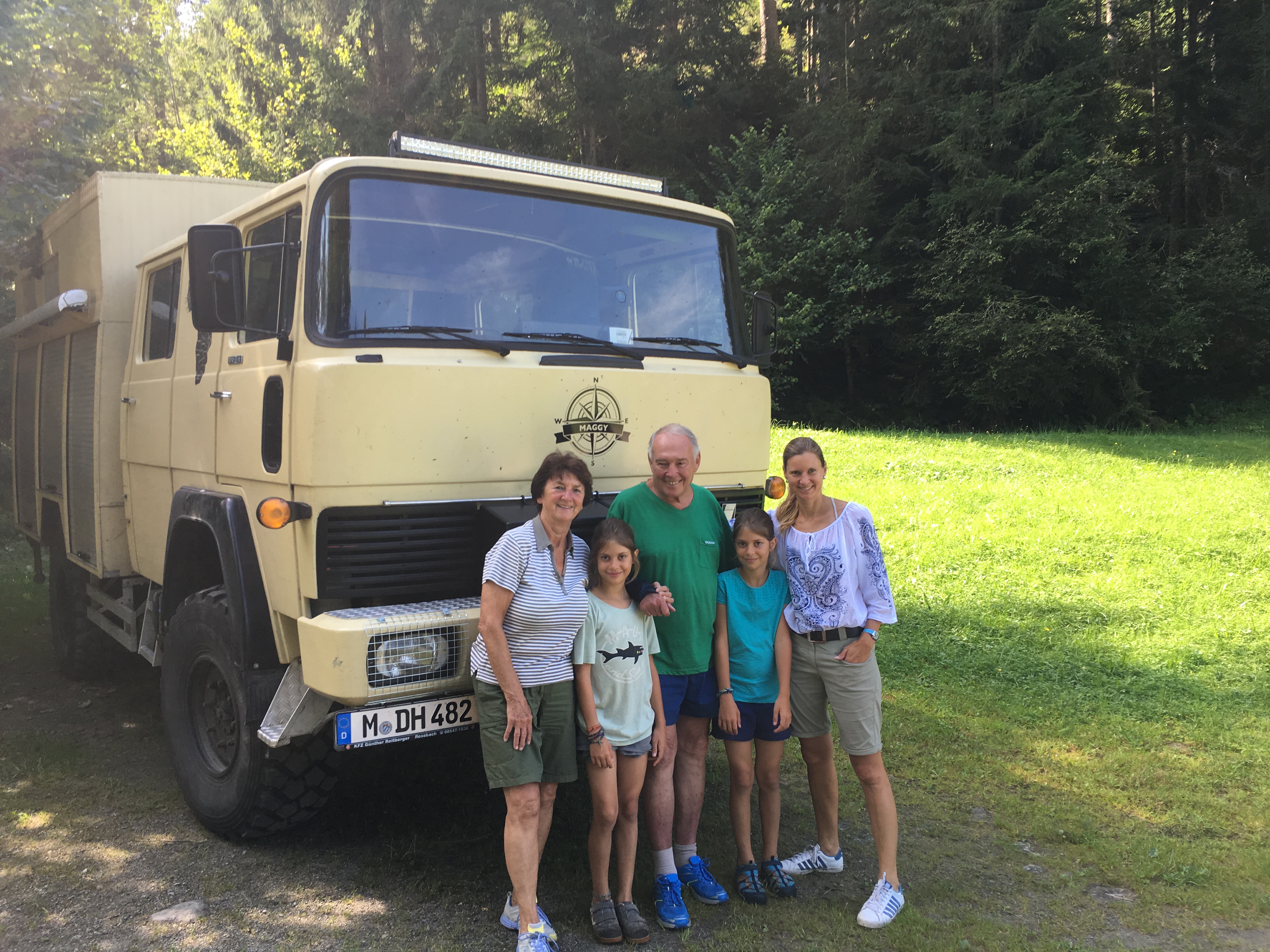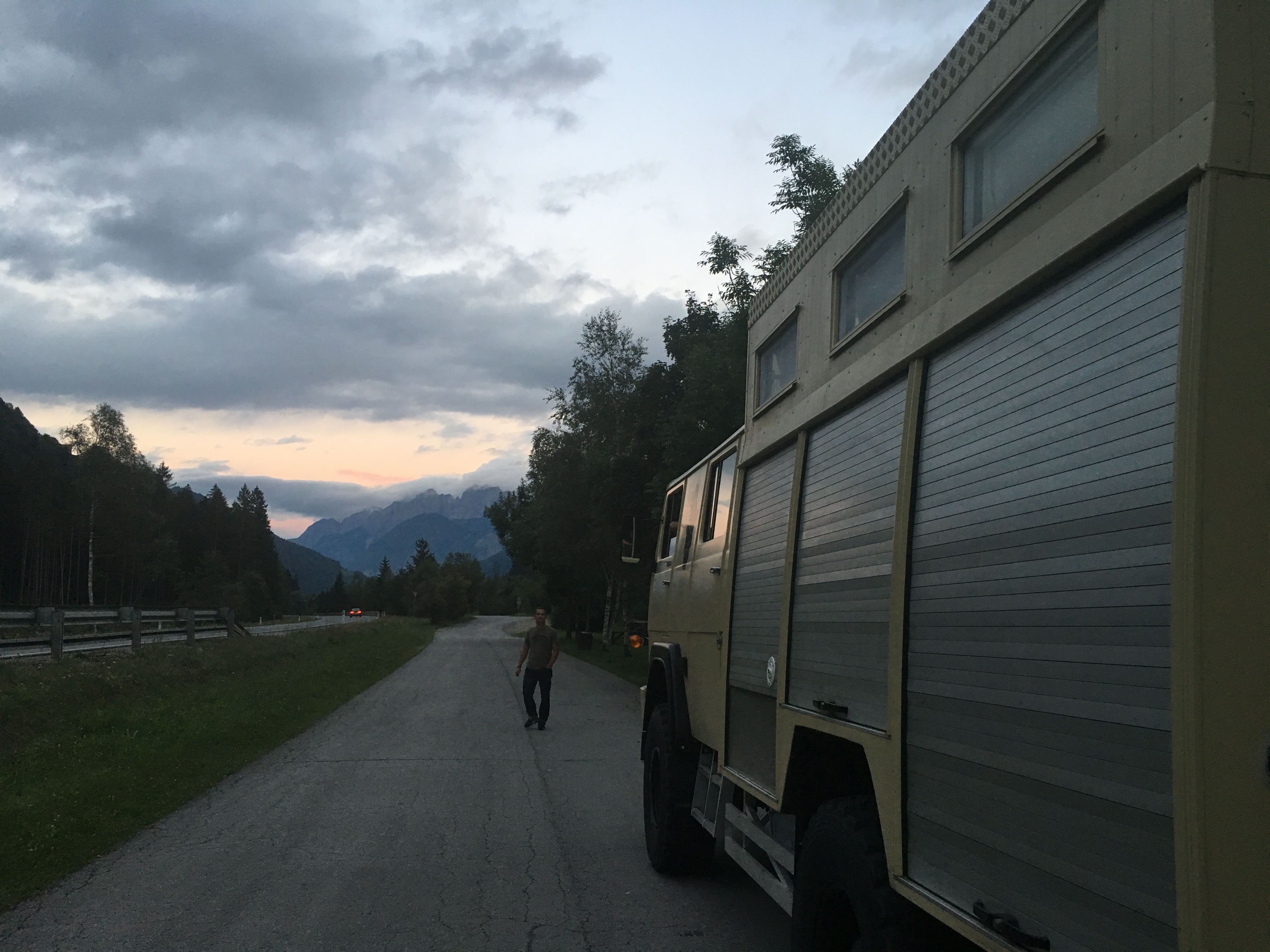 Nach sieben Stunden fahrt ist man durch, auch wenn es noch so schön war, Maggy ist laut, es rumpelt und man ist einfach lange unterwegs und hat irgendwann keinen Bock mehr. Aber genau dann heißt es erstens den Platz zu finden, zweitens einen guten Stellplatz. Hier verhält es sich wie bei einer Wohnungssuche, nur im Kleinformat. Einen Garten oder Balkon soll sie haben, ein großes Bad, Restaurants und Einkaufsmöglichkeiten in der Nähe, zentral aber auch Naturnah. Eben die eierlegende Wollmilchsau. In diesem Fall entscheiden wir uns für die 2. Reihe. Vor uns ein Pärchen, mit 3 Kindern und einem Unimog (Mockl) aus Starnberg. Nach einer Stärkung und einer traumt erholsamen Nacht schließen wir uns mit den neuen Nachbarn zu einer Wanderung zusammen, man fühlt sich gleich verbunden und wir verbringen 2 schöne Tage miteinander. Nach einem letzen Grillen und Potje-Essen trennen sich unsere Wege am nächsten Morgen in Richtung Österreich.