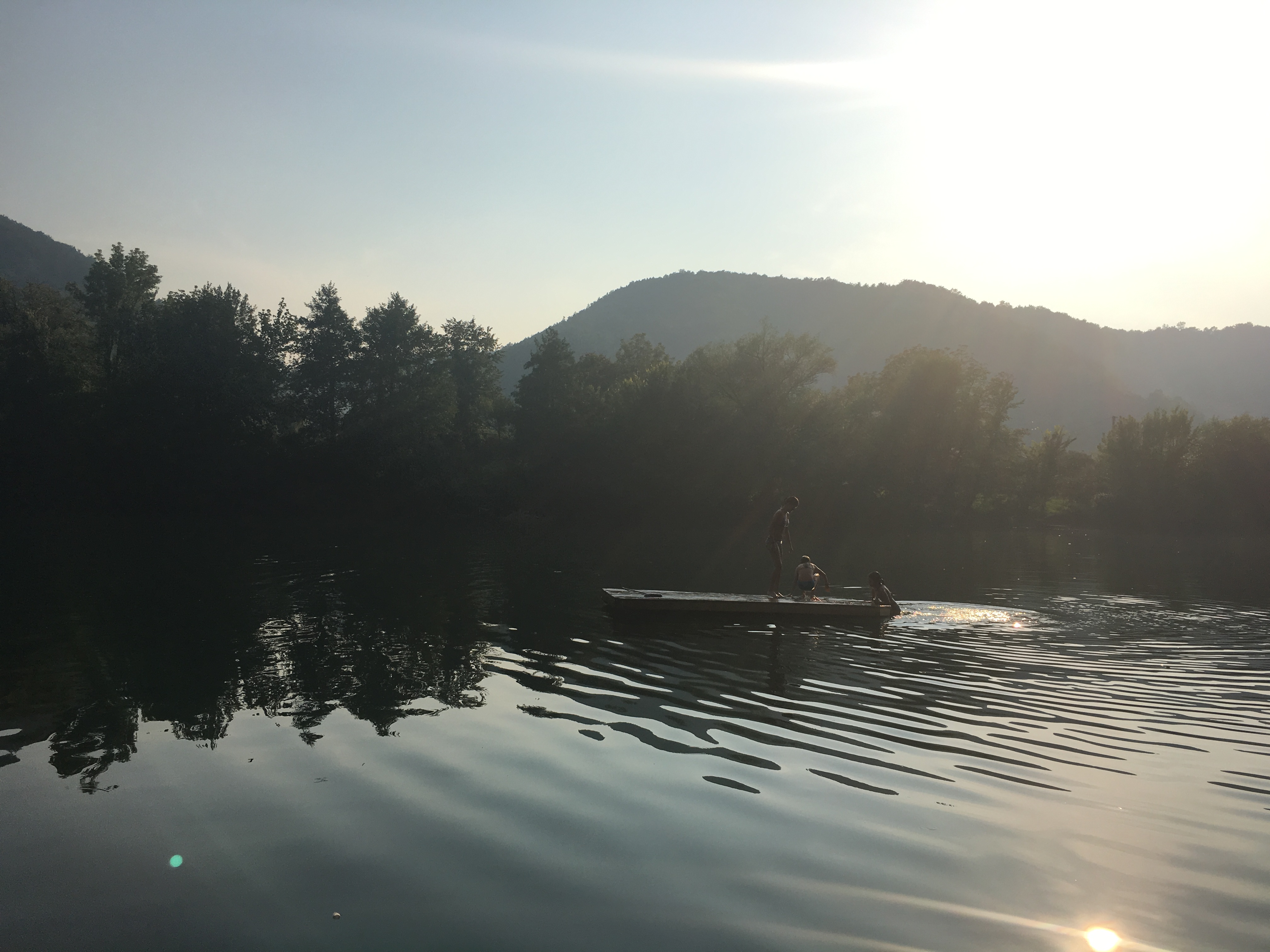 Am 12.8. geht es los, in einer Woche wollen wir nach Albanien reisen – über Österreich, den Fernpass – Karawankentunnel nach Slowenien. Das erste Ziel ist an der Kolpa, Kamp Podzemelj ob Kolpi (http://www.kamp-podzemelj.si), wir überraschen dort unsere Freunde Anja, Michi, Theo und Leni und bleiben länger als geplant. Es ist einfach zu schön beim Angeln, Kanu fahren, Seilschwingen, klettern und einfach gemeinsam viel Spaß haben. Der Vorteil an unserer Art zu Reisen ist, dass man unabhängig und ohne festgelegten Plan reisen kann, dennoch fällt der Abschied von alten Freunden und netten Urlaubsbekanntschaften immer wieder schwer.
