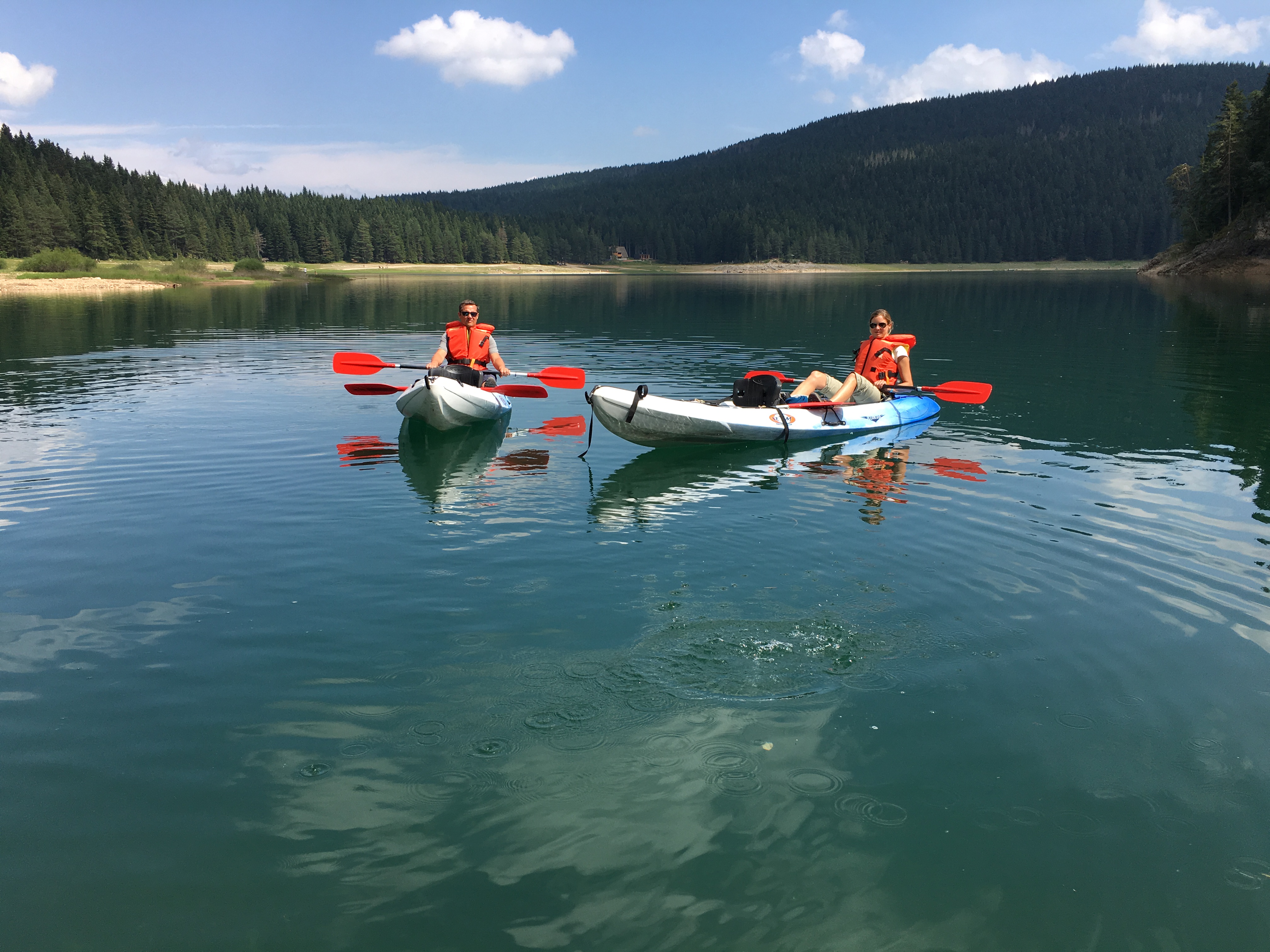 Die entgegenkommenden Autos haben schon angekündigt dass es sich hier um einen Tourismusmagneten handeln muss. Hier karren die Busse zum Black Lake, er liegt malerisch schön im Nationalpark und ist leicht zu erreichen, was aber auch heißt, dass wirklich jeder versucht ein bisschen Naturpark zu erhaschen. Am Campingplatz residieren jedoch eher Bergsteiger und Mountainbiker, die es ernst mit den Bergen und ihrer Schönheit meinen. Von dort aus bahnen wir uns den Weg durch den mit Pilzen überfüllten Wald zum See, mieten ein Kanu und lassen uns von den Besucherströmen nicht aus der Ruhe bringen. Am Nachmittag geht es mit Angeln und Taschenmessern auf Beutetour – mit 1kg Schwammerl und ohne Fisch kommen wir zurück. Am Abend spazieren wir in die Stadt, buchen eine Rafting-Tour durch die Tara-Schlucht für den nächsten Tag, gehen einkaufen und in einem der zahlreichen Restaurants essen. Zabljak war schon vor dem Krieg wohl ein beliebtes Ziel zum Skifahren und Wandern. Zahlreiche große und prächtige leerstehende Hotels verfallen einfach. Daneben werden neue Häuser gebaut, die zeigen, dass die Gegend durchaus aufstrebend ist und jede Menge Potenzial zur Vermarktung hat. Viele nette Bars, gute Restaurants und ein großer, gut bestückter Supermarkt werden von Reisenden, vor allem aus den Balkan-Ländern, aber auch Italien und Frankreich, Deutschland und England, besucht.