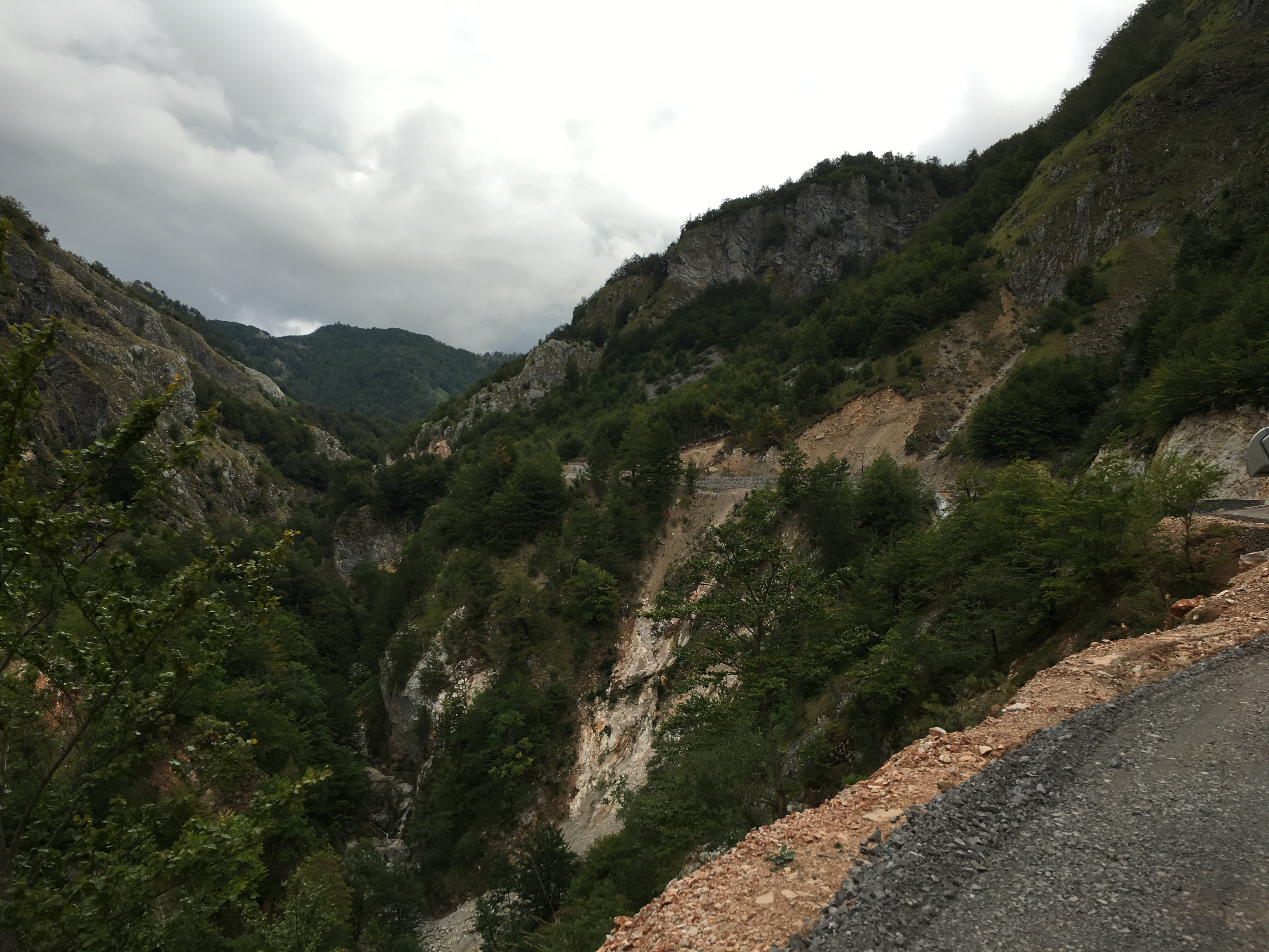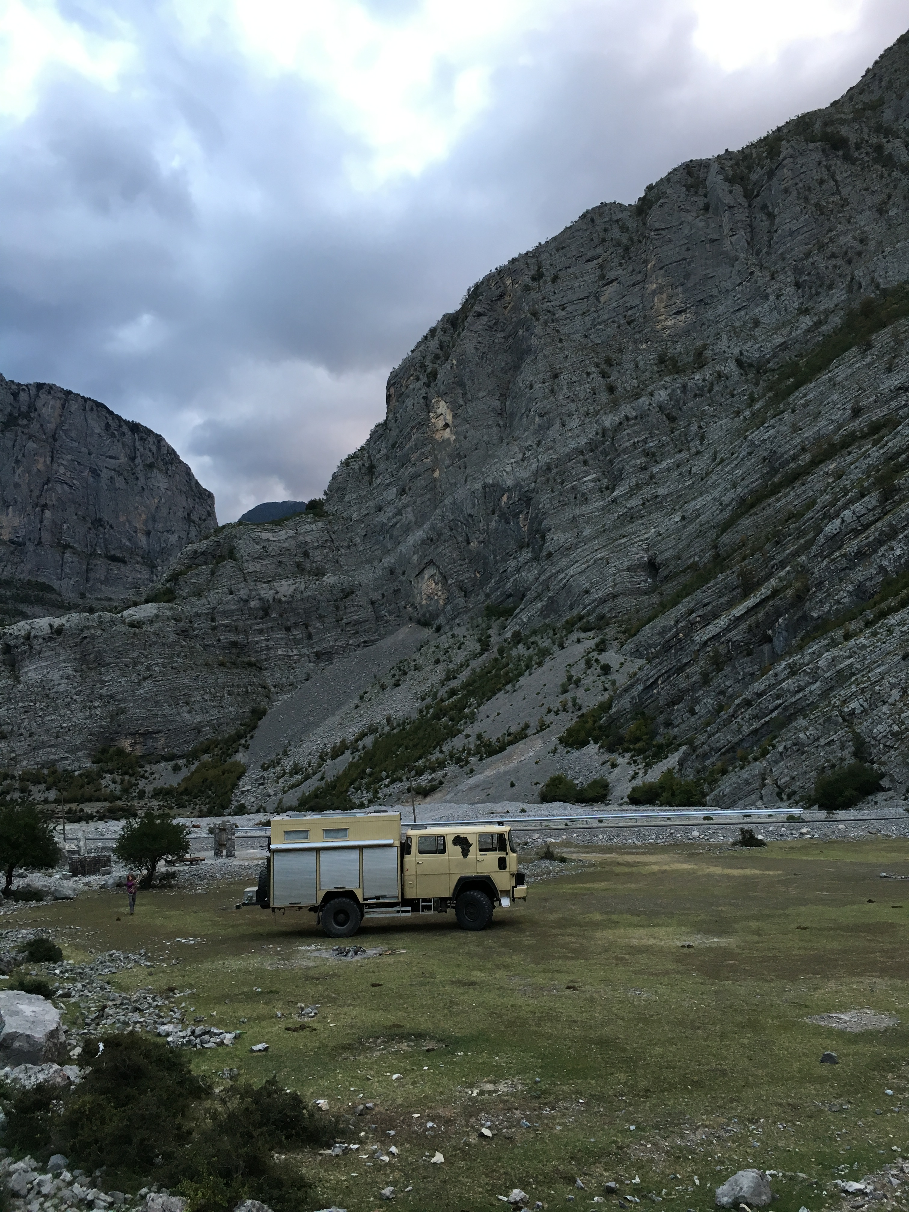 Erstaunt und amüsiert haben wir gleich hier einen Vorgeschmack erhalten was sich die nächsten 50 km als Albaniens Straßen in Arbeit herausstellen sollte. Wir lassen das Vermosh-Tal rechts liegen und tuckeln mit 20-40 km/h durch die Berge, mit Pausen zwischen 10-45 Min. bedingt durch Bauarbeiten. Das alles finanziert durch die EU – dank der wundervollen Landschaft, die es sich sicherlich lohnt von mehreren Touristen zu bereisen. Nach zwei Stunden wackeln und kurven kommen wir in den geteerten Bereich – eine Wohltat. Mitten in den Bergen finden wir einen schönen, sagenumwobenen Platz zum übernachten. Wir sind von riesigen, steil emporragenden Felswänden umgeben. Der Sturm der Naturgeister lässt unsere Maggy die ganze Nacht wackeln als würden die Zanen, Feenwesen aus der albanischen Mythologie, persönlich daran rütteln. Ein mulmiges Gefühl.