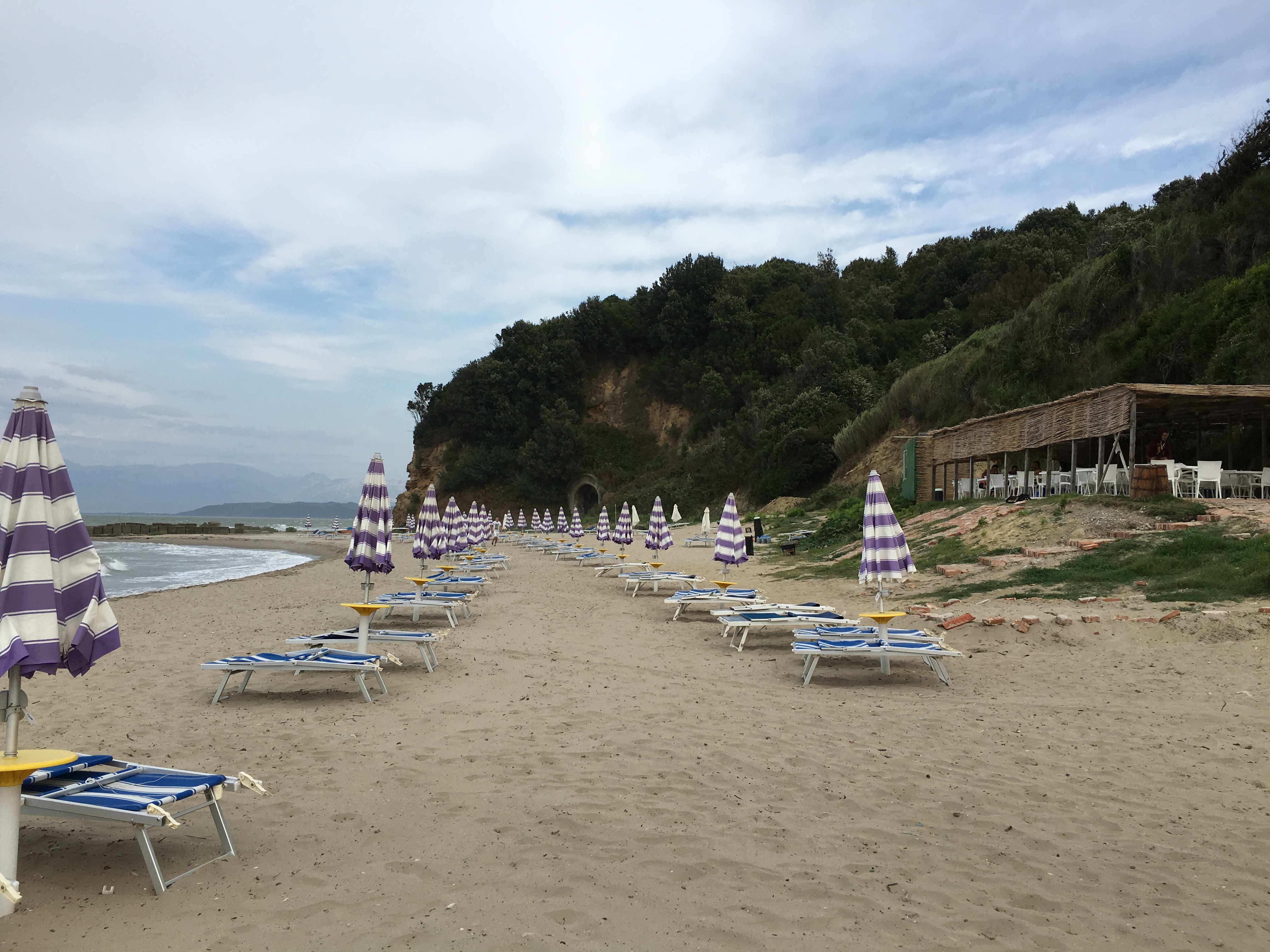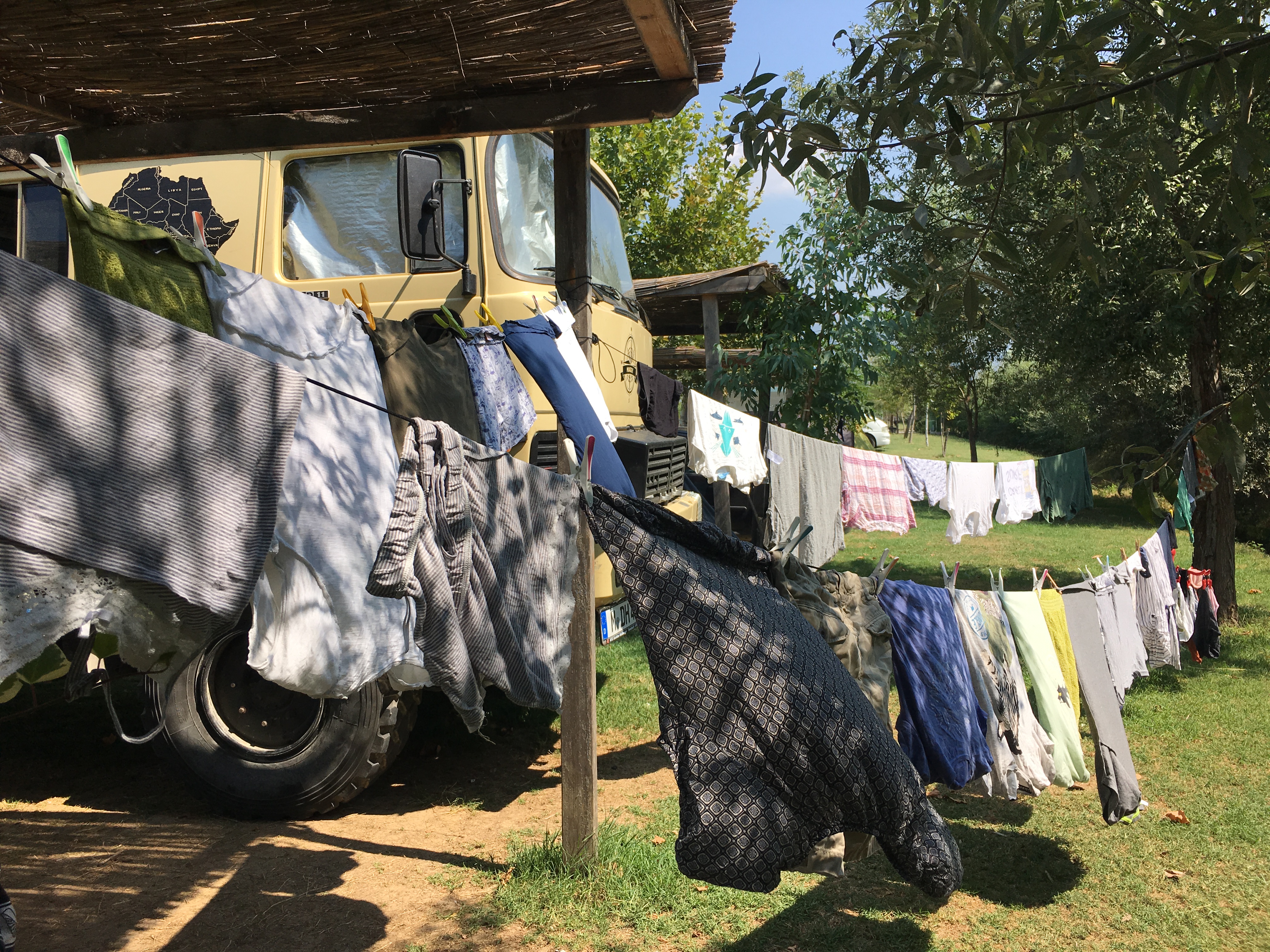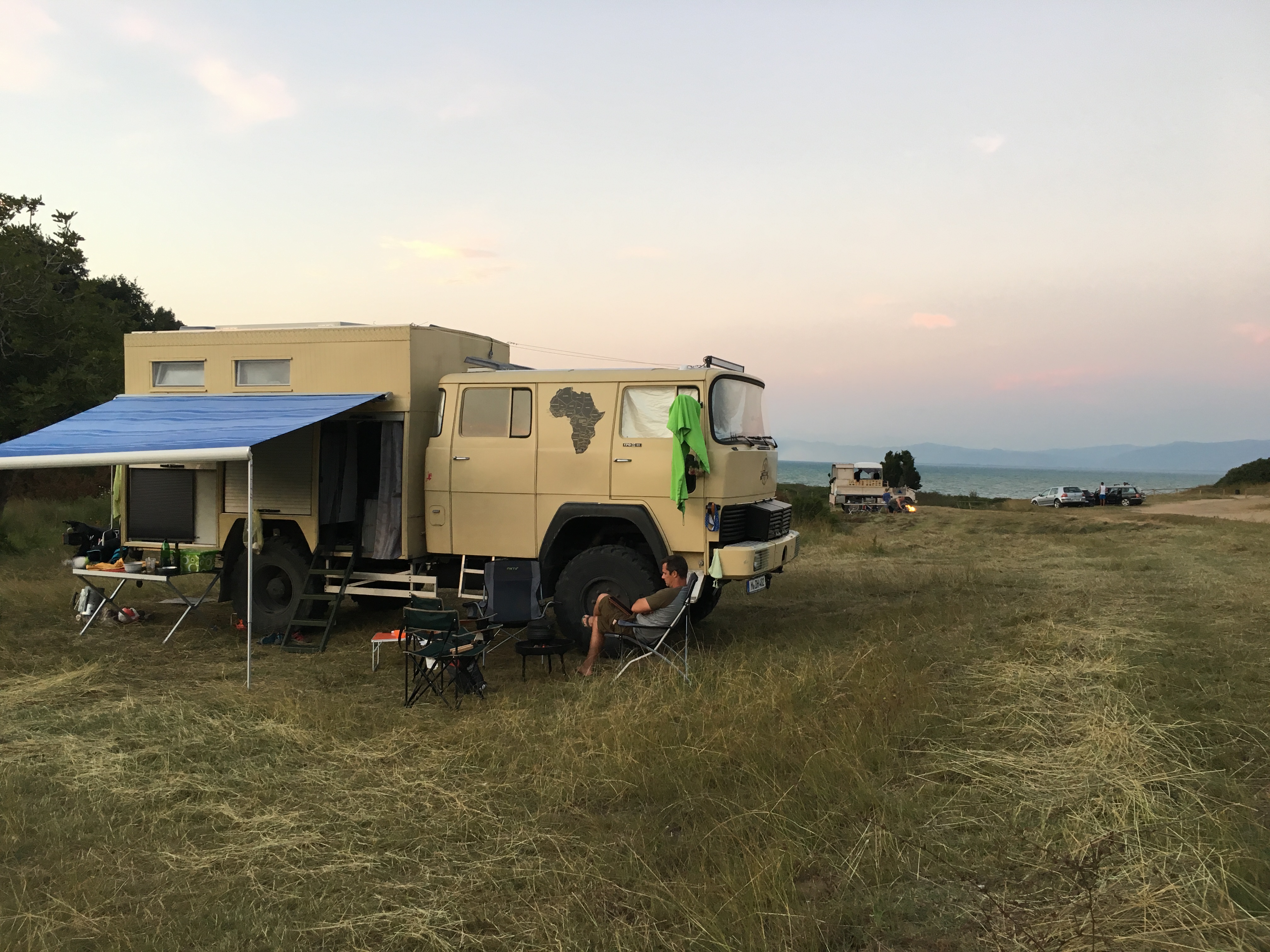 Wir fühlen uns hier so wohl an unserem historischen Ort mit Esel und Strand, dass wir beschließen noch eine Nach zu bleiben. Am Nachmittag bekommen wir auch noch sehr nette belgische Nachbarn, ein Unimog mit 12 Mann jubelnder Besatzung kommt angewackelt und alle freuen sich wie die Schnitzel als sie uns sehen. Der Besitzer fährt jedes Jahr ein Stückchen weiter, lagert sein Fahrzeug wieder ein und reiste so die letzten Jahr Step by Step durch den Balkan, Griechenland und in die Türkei und das alles offen und immer wieder mit Freunden, die er am Flughafen einsammelt und wieder absetzt. Auch ein spannendes Reisemodell. Wir erleben gemeinsam einen schönen Strandtag, ein leckeres Essen in unserm Potje [sprich: pottki] = (gusseisener Topf mit 3 Beinen, den man ursprünglicherweise auf die Glut einer offenen Feuerstelle stellt) und schließen mit einem Drink an der Bar ab. Fazit: Toller Strand, leider viele Wespen aber auf alle Fälle einen Halt wert.