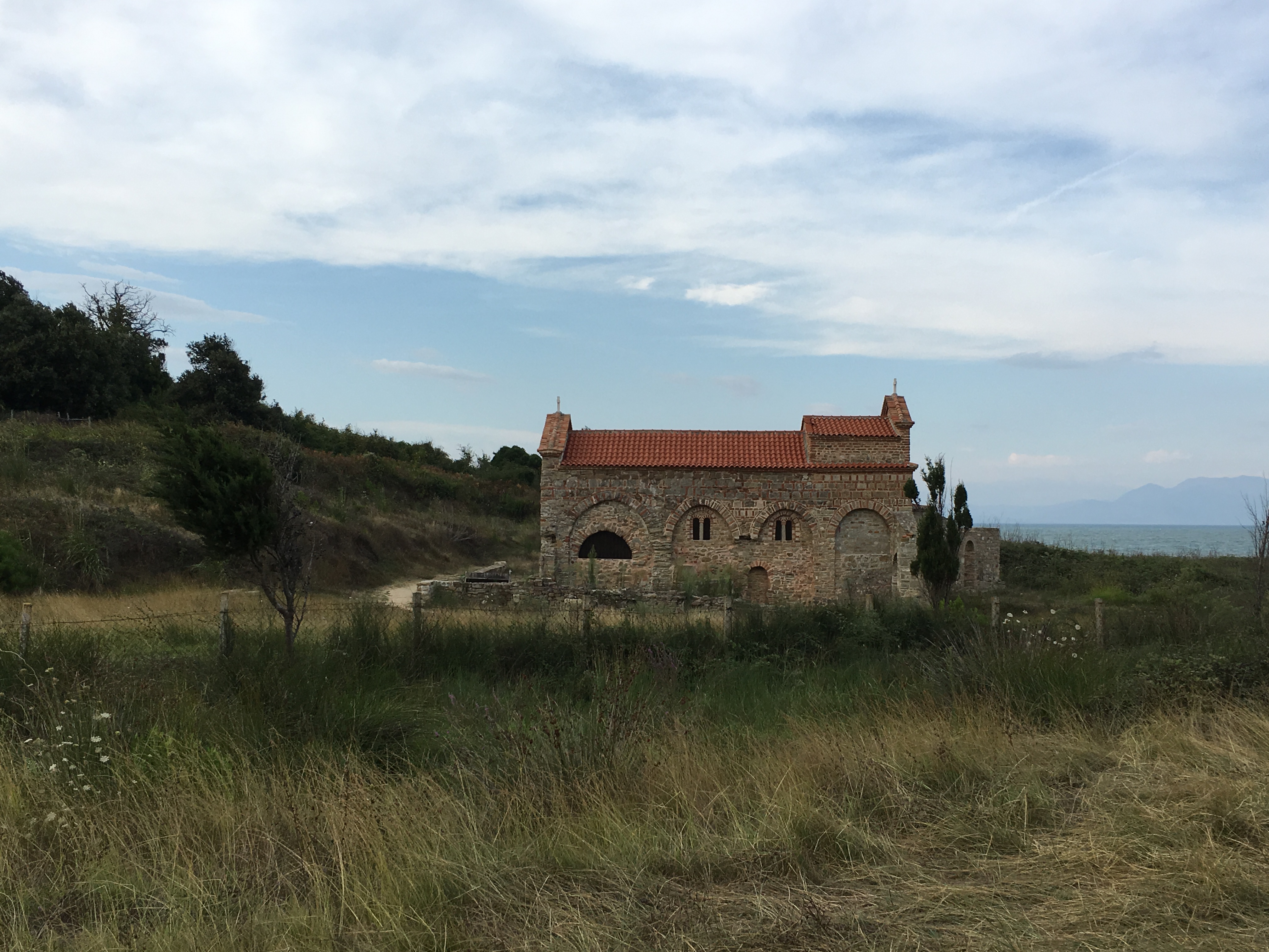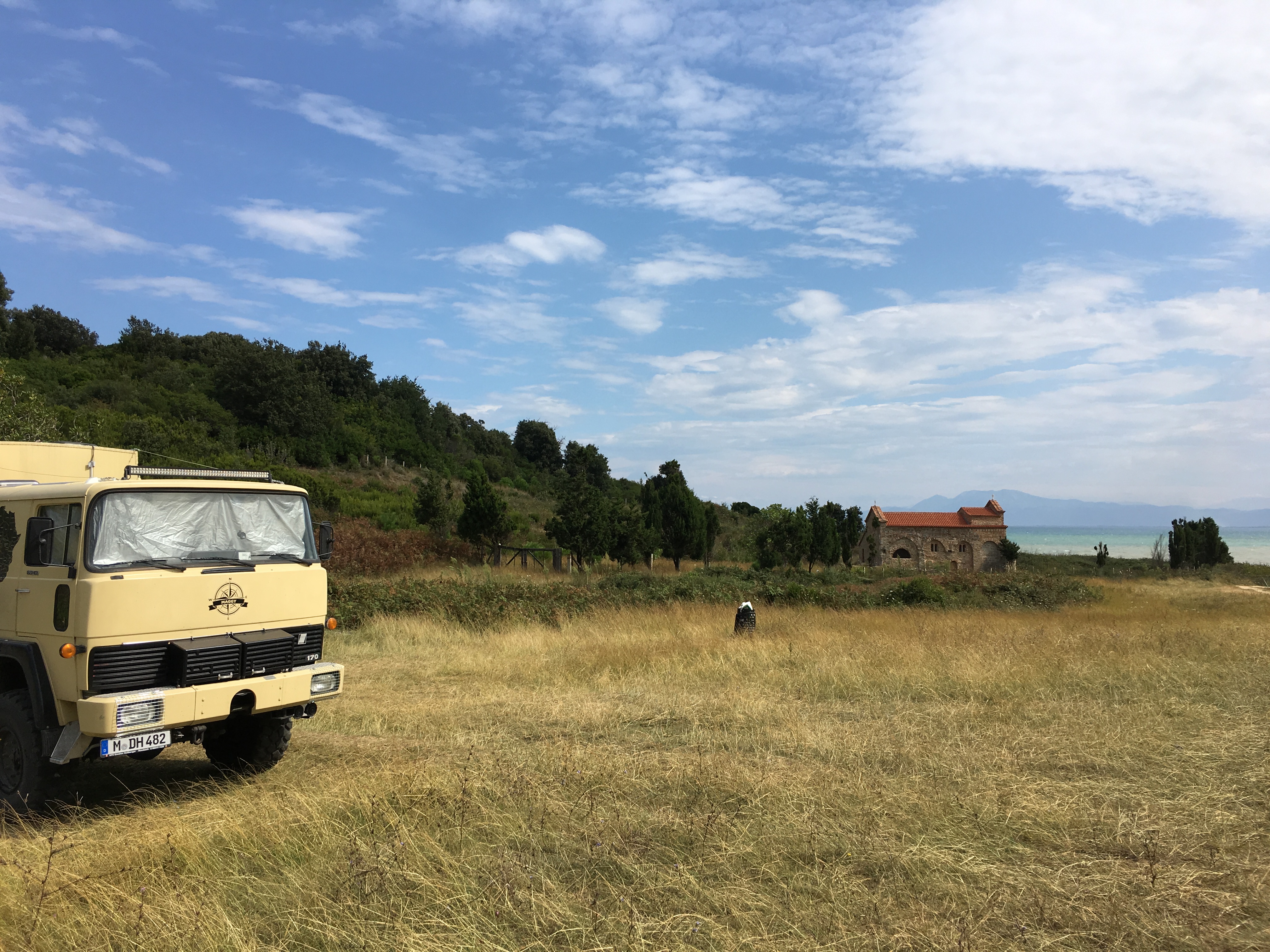 Zwei Nächte verweilen wir hier am Strand von Kap Rodon, parken nahe eines Feigenbaums unter dem ein Esel wohnt, Sophia und Fiona haben ihre Hunde mit Welpen gefunden, für uns gibt es eine Strandbar mit lecker Fisch. Hier ist wohl ein ganz besonderer Ort, ständig kommen Brautpaare und Fotografen in Porsche oder Oldtimern die unbefestigten Straßen entlanggefahren und machen Fotosessions, ein ungewöhnliches Bild. Die Kirche Shen Antonit aus dem 13. Jahrhundert, die Teil eines Klosters war Verwaltet das Kap, hier wird der Müll entsorgt und alles Sauber gehalten, ein seltenes Bild in Albanien.
