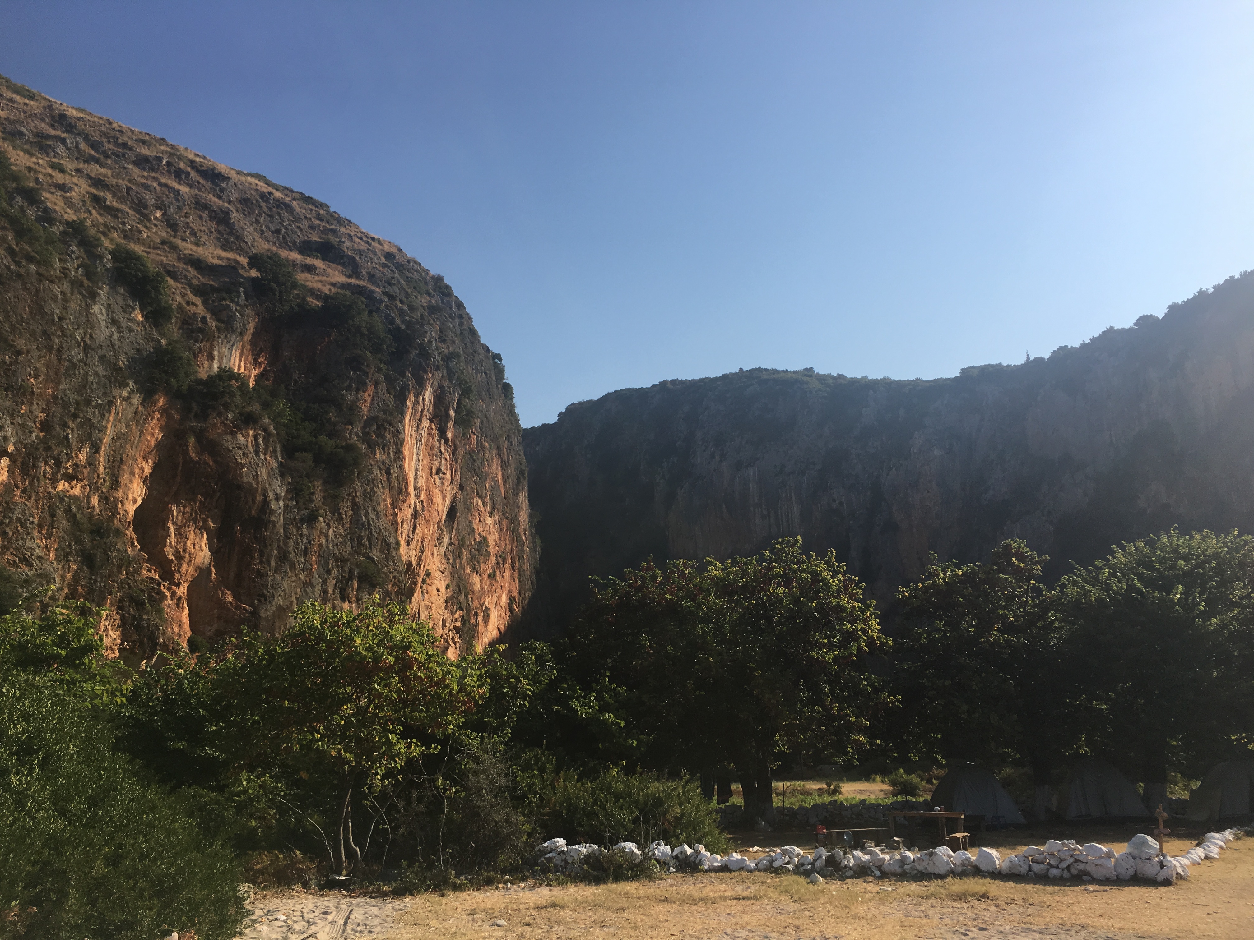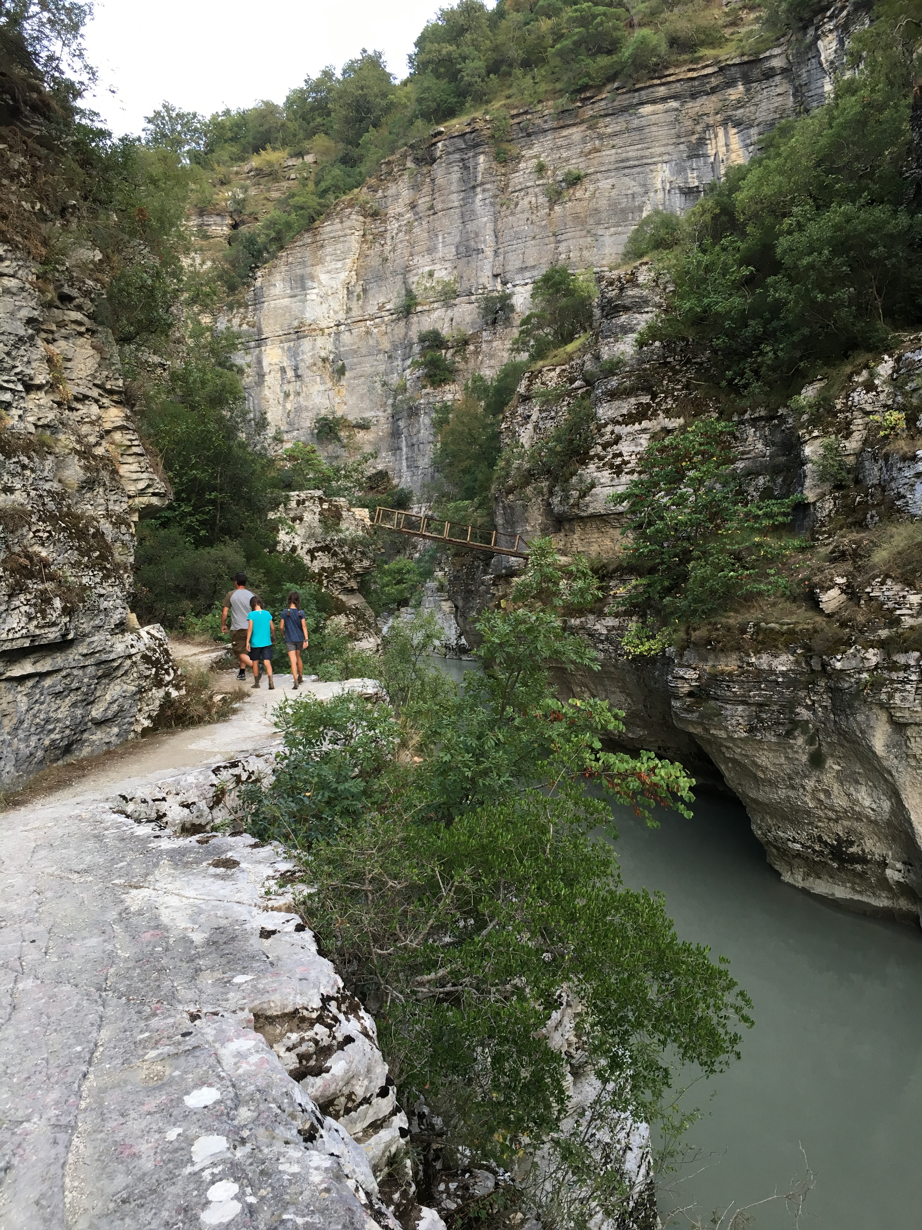 Die vielen Menschen und die Stadthektik lassen wir nach einem Einkaufsstopp hinter uns um einen schönen, ruhigen Ort zum relaxen zu suchen. Unser Weg führt nach Corovoda wo angeblich ein Wasserfall und der Osum Canyon auf uns warten. Wir fahren durch Polican an Waffenfabriken und Plattenbauten vorbei, nach Corovoda wo uns große Fabriken und ein dreckiges Flussbett erwarten. Unser Lied „Albanien, Albanien“ das wir immer singen wenn uns langsam die Verzweiflung überkommt macht die Landschaft auch nicht schöner. In Corovoda kaufen wir uns einen Vodafon-Karte um eine bessere Internetverbindung zu haben. Mike wird im Vodafon-Laden ermutigt noch weiter zum Osum-Canyon zu fahren. Gesagt, getan stehen wir 5 Min. später wieder am Dorfplatz, das mit den Albanischen Umleitungen ist nicht so unser Ding. Das geleiche nochmal und die Dorfbewohner leiten uns lächelnd und winkend in die richtige Richtung.