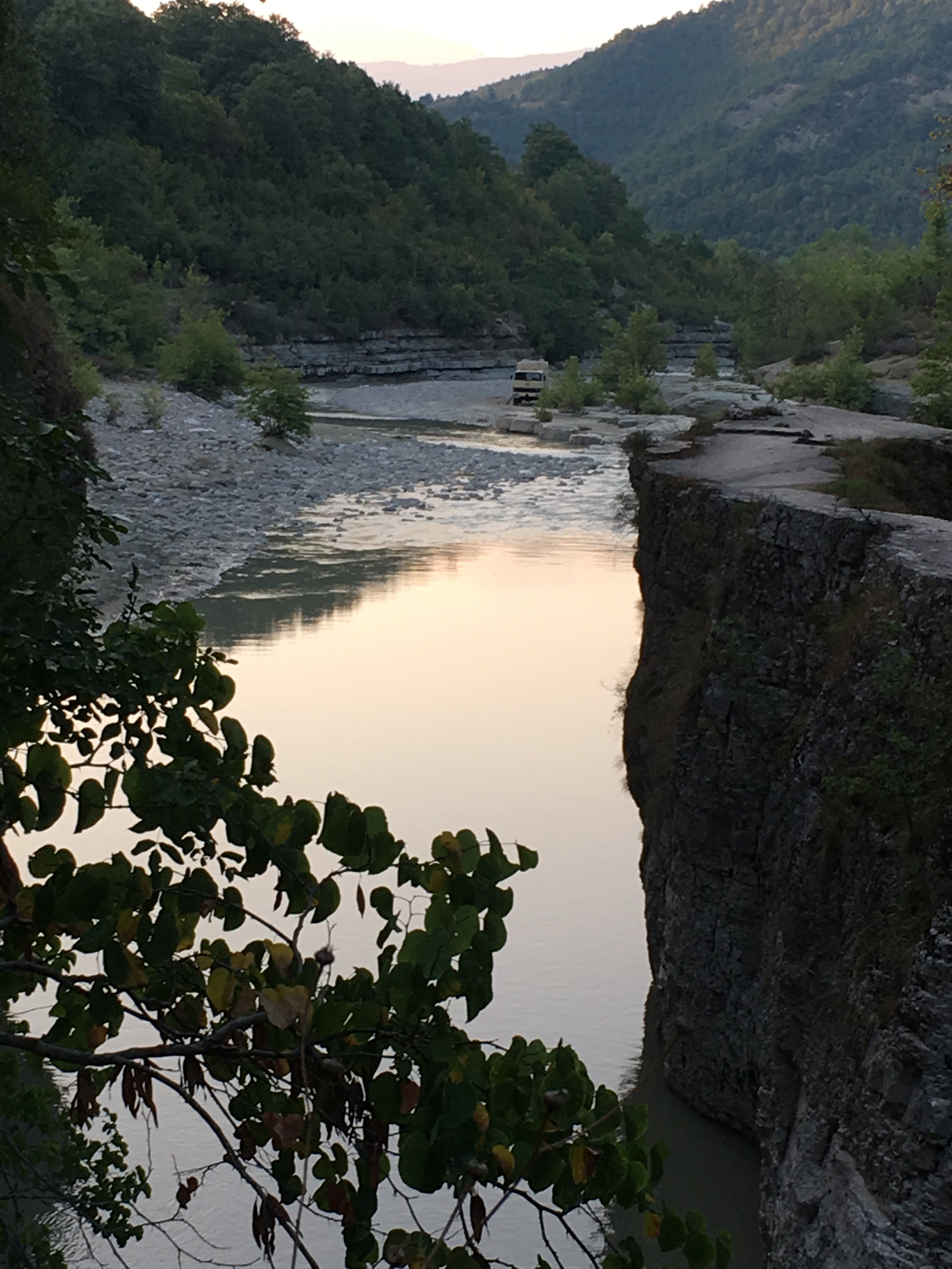 Slowenien ist wirklich sehr schön, die Landschaft mit seinen vielen Flüssen und unberührter Natur. Viele sehenswerte Orte und Naturparks lassen wir links liegen, es geht weiter durch Kroatien, nach Bosnien an die Una. Einer der vielen Tipps die wir von Freunden und Bekannten erhalten haben. Meist landen wir dann an abgelegenen Plätzen auf die man selbst nur durch Zufall stoßen würde. Jedes Mal steigt die Spannung ins unermessliche wo wir diesmal landen werden. Im Kamp Una (http://www.unacamping.de) werden wir von einem großgewachsenen, blonden, braungebrannten Mann empfangen. Er spricht uns auf Bosnisch an „dobredan“ und irgendwelche unverständlichen Phrasen. Wir sind wortwörtlich „sprachlos“ – es ist unangenehm so gar nichts zu verstehen und lediglich das „dobredan“ für guten Tag zu wiederholen und freundlich zu lächeln mit einem großen Fragezeichen über dem Kopf. Es stellt sich aber schnell heraus dass wir von dem netten Besitzer des Kamp Una auf den Arm genommen worden sind, er lebt eigentlich in Berlin und spricht perfekt deutsch. Er hatte den Auftrag uns in seiner Landessprache zu begrüßen und eiskalt erwischt. Im Hintergrund lachen sich unsere Offroad-Kollegen Jürgen mit seiner Tochter Franziska, Emil und Conny bereits kaputt. Die Kinder springen vom Floß ins eiskalte Wasser, angeln und sind happy. Wir verbringen dort einen netten Fleischbällchen-Abend, tauschen uns über Reisen und Erfahrungen bei in paar Raki aus und genießen das Leben. Tags drauf fährt jeder an sein nächstes Ziel, die Reise geht weiter