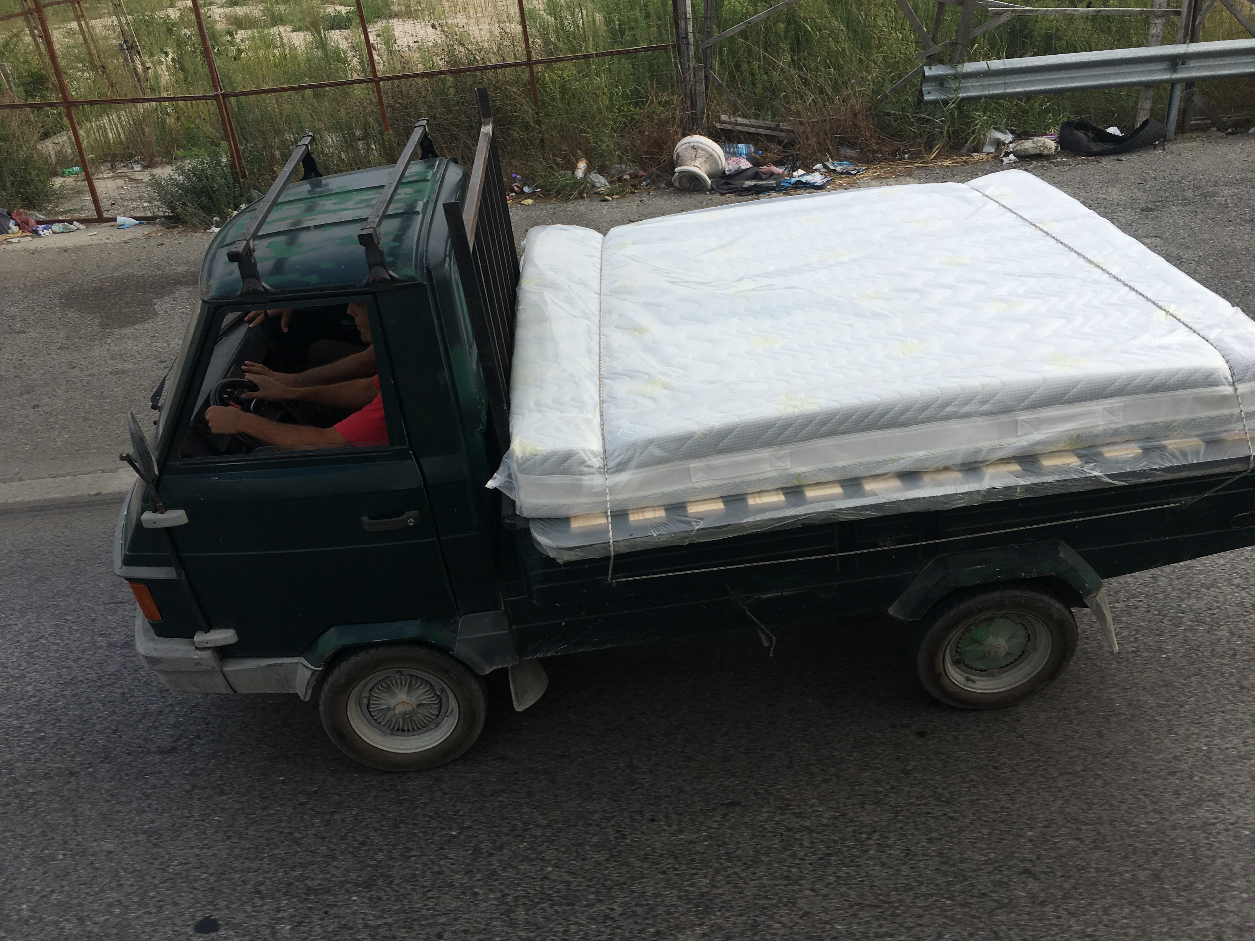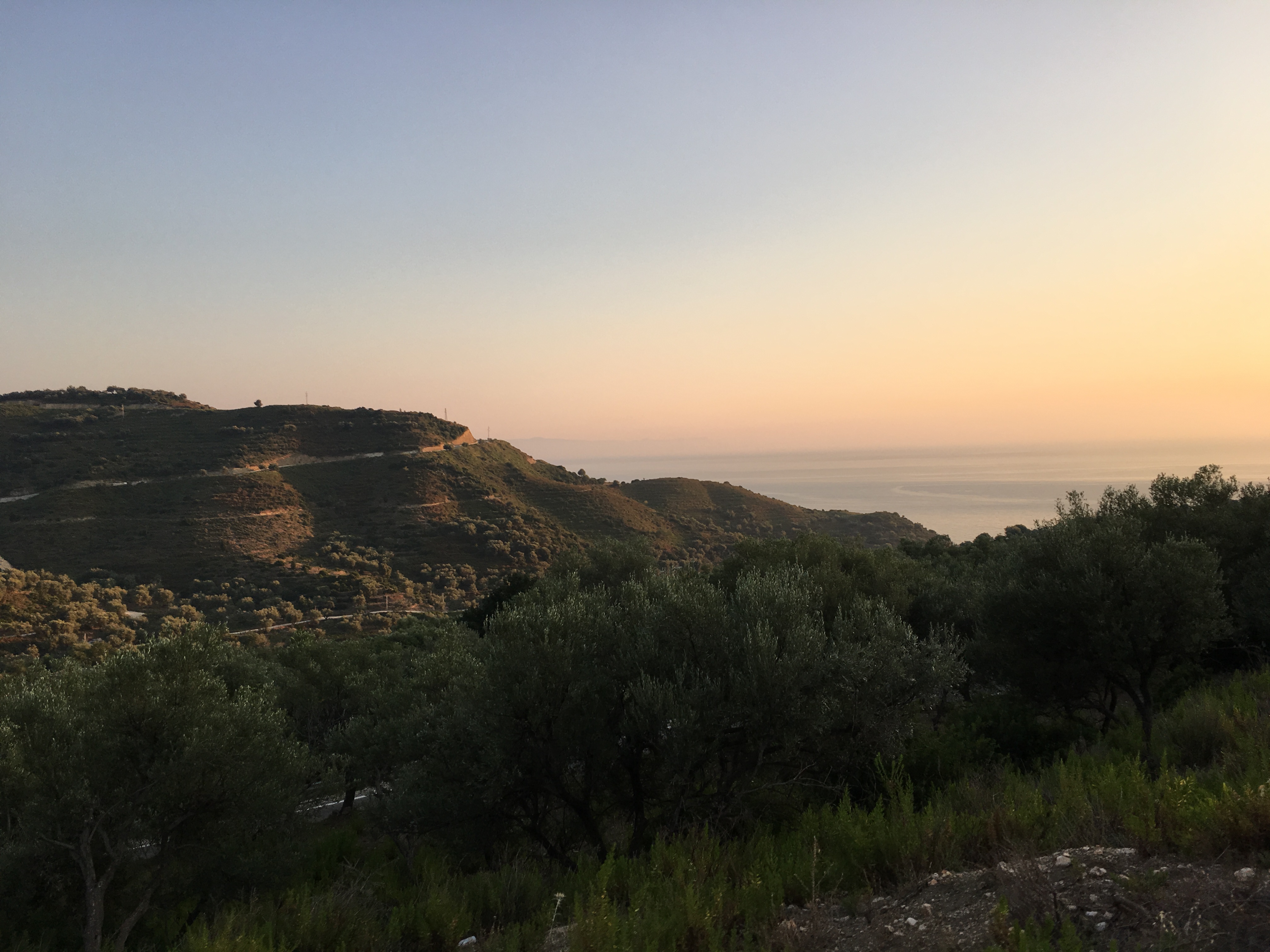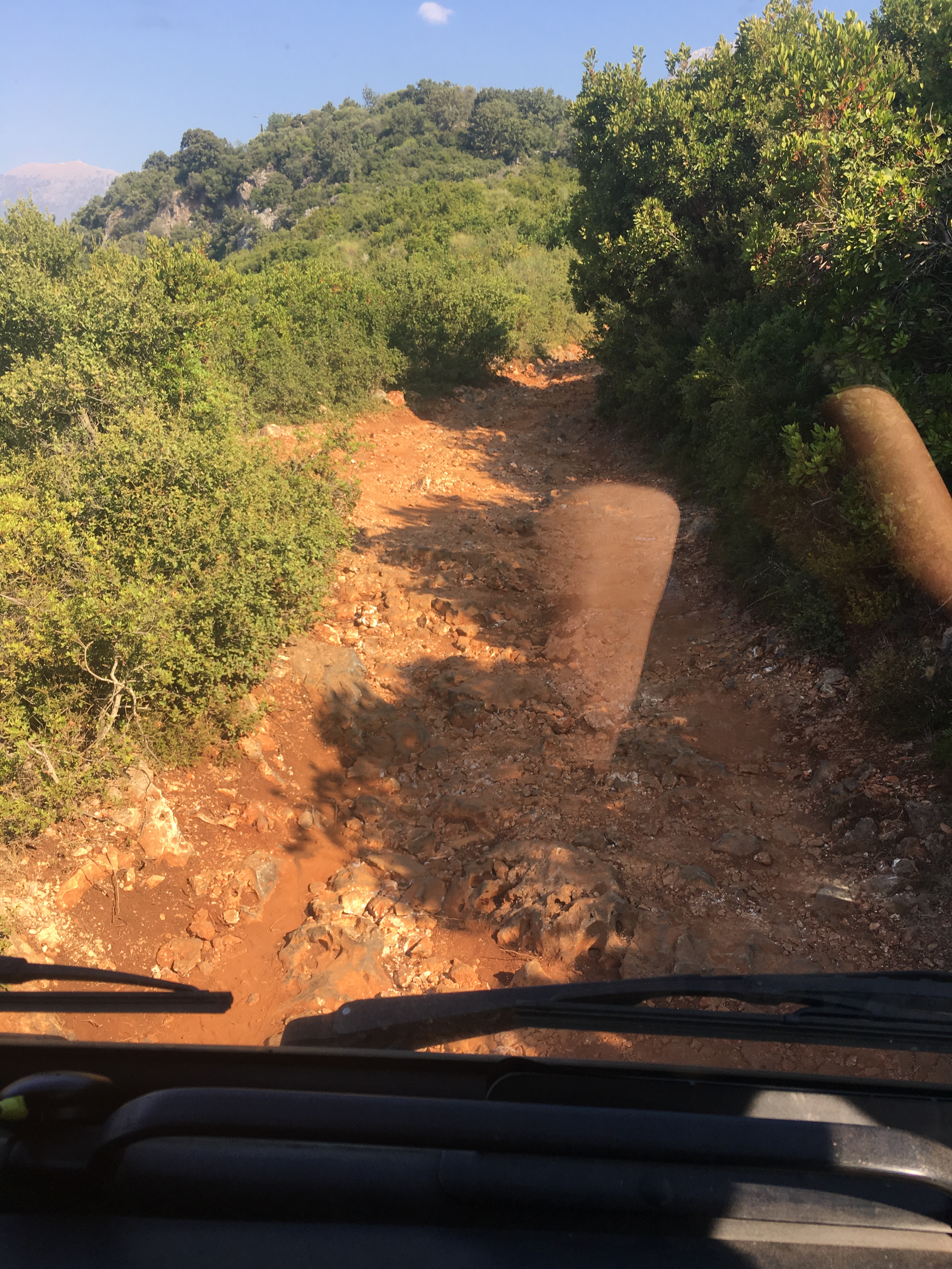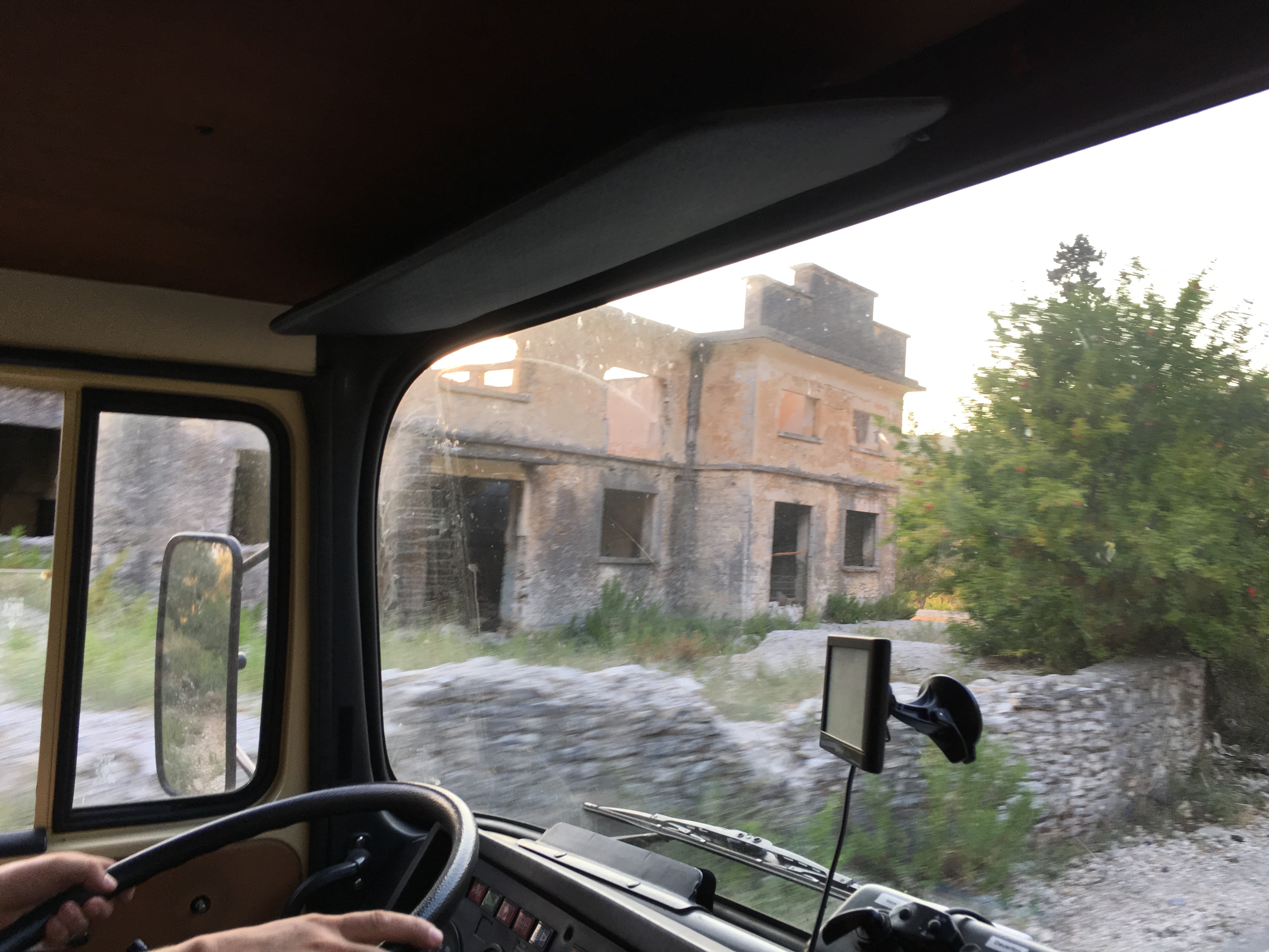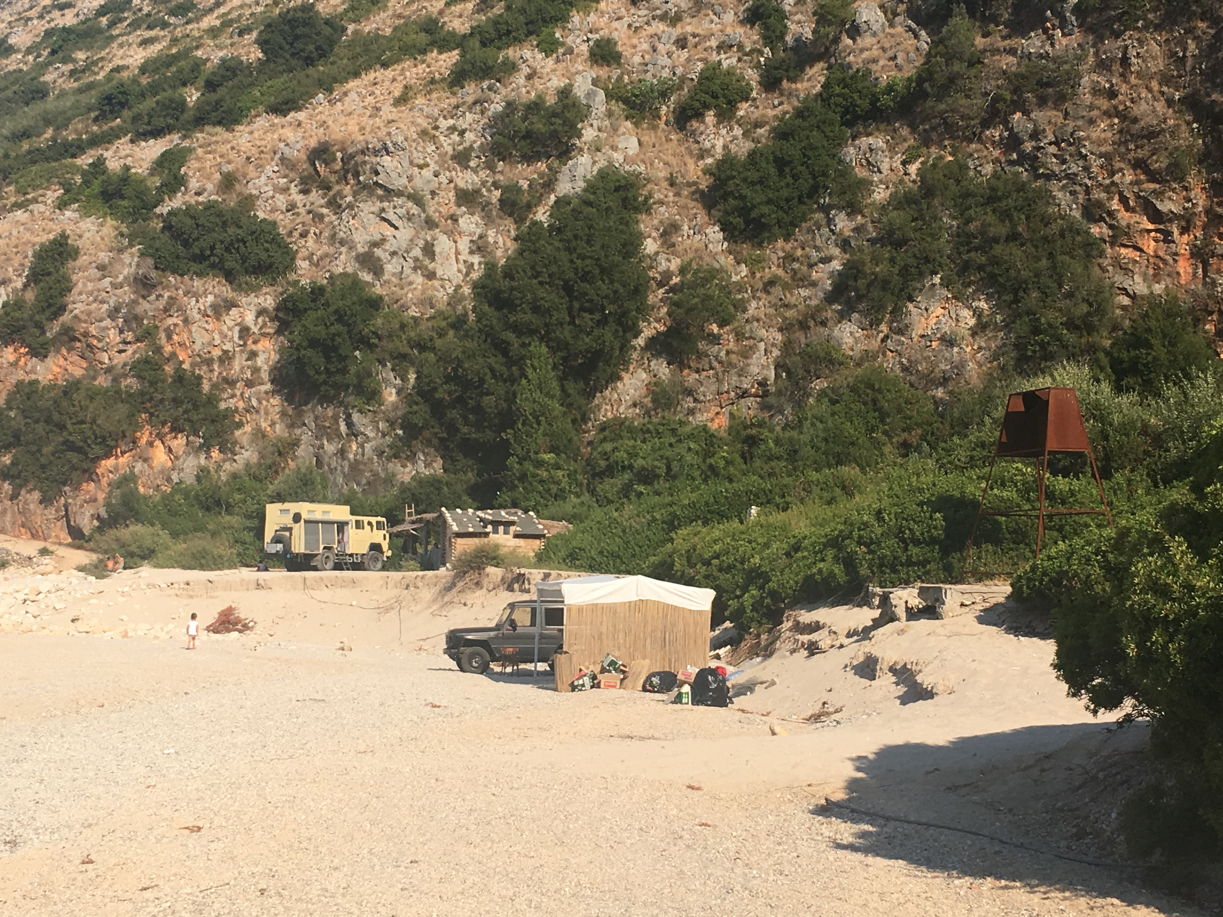 Die Abfahrt beginnt auf einer schmalen, geteerten Straße, ganz anders als wir erwartet hatten. Wir landen auf einem große Parkplatz, noch einmal haben wir Funkkontakt, Adrian meint, der erste Teil der Straße ist ausgewaschen und schwer befahrbar, aber es ist möglich. Wir wagen es, ohne uns vorher ein eigenes Bild gemacht zu haben. Die „Straße“ oder besser, der steinige, ausgewaschene Bergweg erweist sich als Mutprobe und Eignungstest für unseren 7 Meter langen Magirus. Wir schalten den großen Strahler auf dem Dach an und haben perfekte Sicht auf den durchfurchten Steinweg. Es ist die anspruchsvollste Fahrt unserer bisherigen Tour. Wir schwitzen und bewältigen die 1,4 km Strecke in einer halben Stunde, ganz langsam und konzentriert. Unten angekommen landen wir an einem tollen Stand. Es ist zwar schon dunkel, aber die kleine Strandhütte und die netten Menschen darin heißen uns herzlich willkommen. Jetzt steht nur noch eine Entscheidung an, schaffen wir es durch den schrägen Olivenbaum zum Camp-Ground oder nicht? Leider nein, wir müssen wieder 20 m retour was uns eine Stunde Zeit kostet, links und rechts nur Baum, Büsche und keine Sicht. Die Kommunikation funktioniert dann endlich als alle Navigatoren auf dem Boden liegen und sich Zeichen unter der Maggy geben. Die Nerven liegen Blank aber wir können wenden und dürfen nahe der Bar übernachten. Nach ein paar Bier und ein paar gebratenen Kartoffeln und Würstel geht es schon etwas besser. Mike gibt Adrina den Titel „Offroad Dracul“ und wir nehmen die Situation mit Ironie hin.