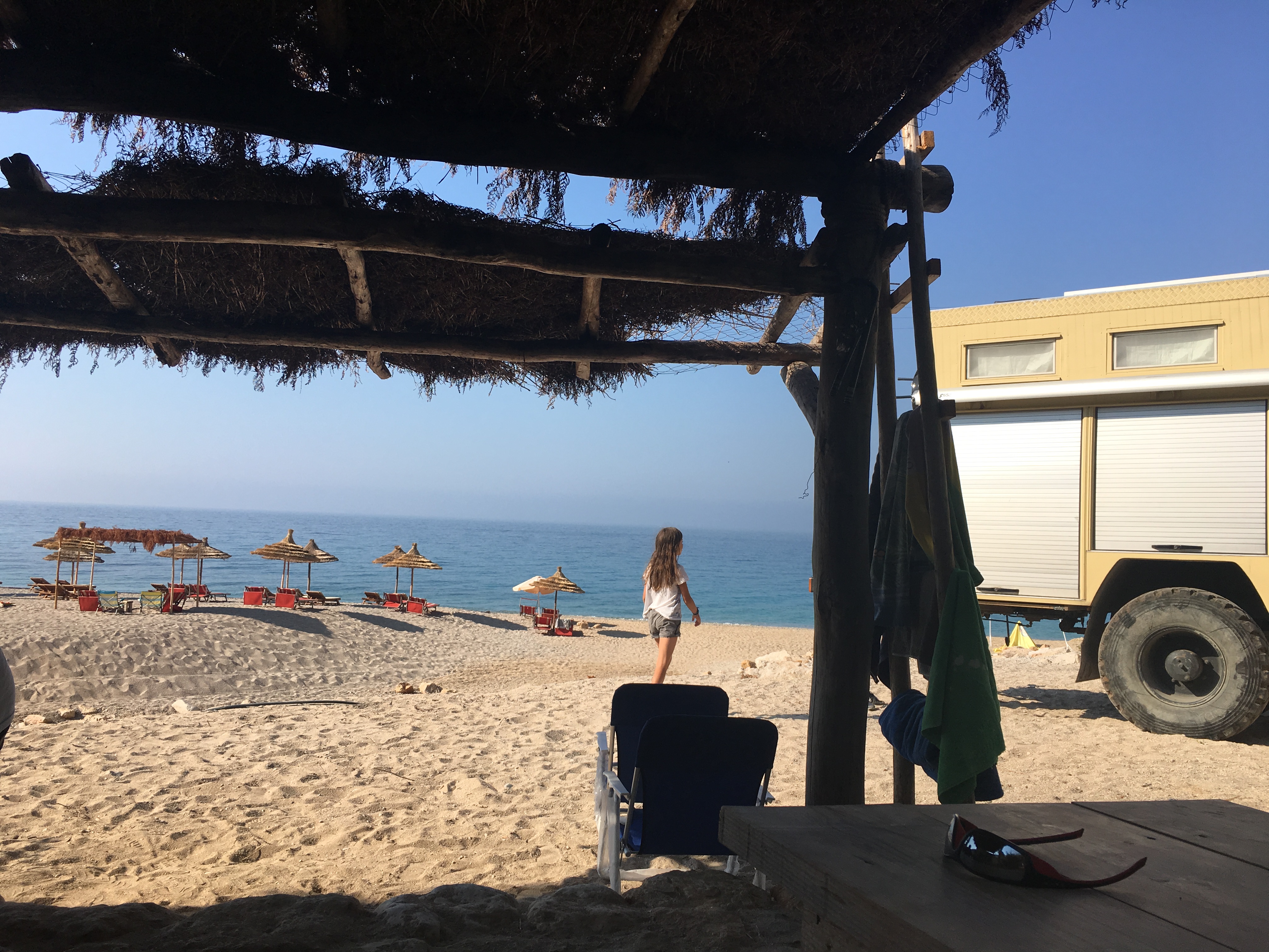 Wir werden auf ein Magirus Offroad-Mobil in dunkelgrün aufmerksam, das neugierig einen geeigneten Platz zur Bleibe sucht und auf uns aufmerksam wird. Natürlich gehen Gleichgesinnte sofort aufeinander zu und schließlich verbringen wir noch zwei tolle Tage mit den http://www.6westfalen.de, Jochen, Judith, Marie, Ruben, Lea und Hannah, die für ein Jahr in Richtung Südafrika unterwegs sind. Die Männer tauschen und eifrig über alle technischen Details der Fahrzeuge aus. Die Frauen über ihre Position als Chef-Navigator und „Mann“ für alle Fälle, die Kinder rotten sich sehr schnell zusammen und verbringen die meiste Zeit im und am Meer. Abends gibt es in einem der Strandrestaurants sehr leckere Doraden, danach ein Lagerfeuer mit selbst gebackenem Brot aus dem Potje, ein erster Versuch auf den wir neugierig waren. Am nächsten Morgen leckes, selbst gebackenes Walnussbrot, laut Judith zwar noch verbesserungswürdig – trotzdem lecker: hier ein Tipp, den ich dazu nachträglich gefunden habe: