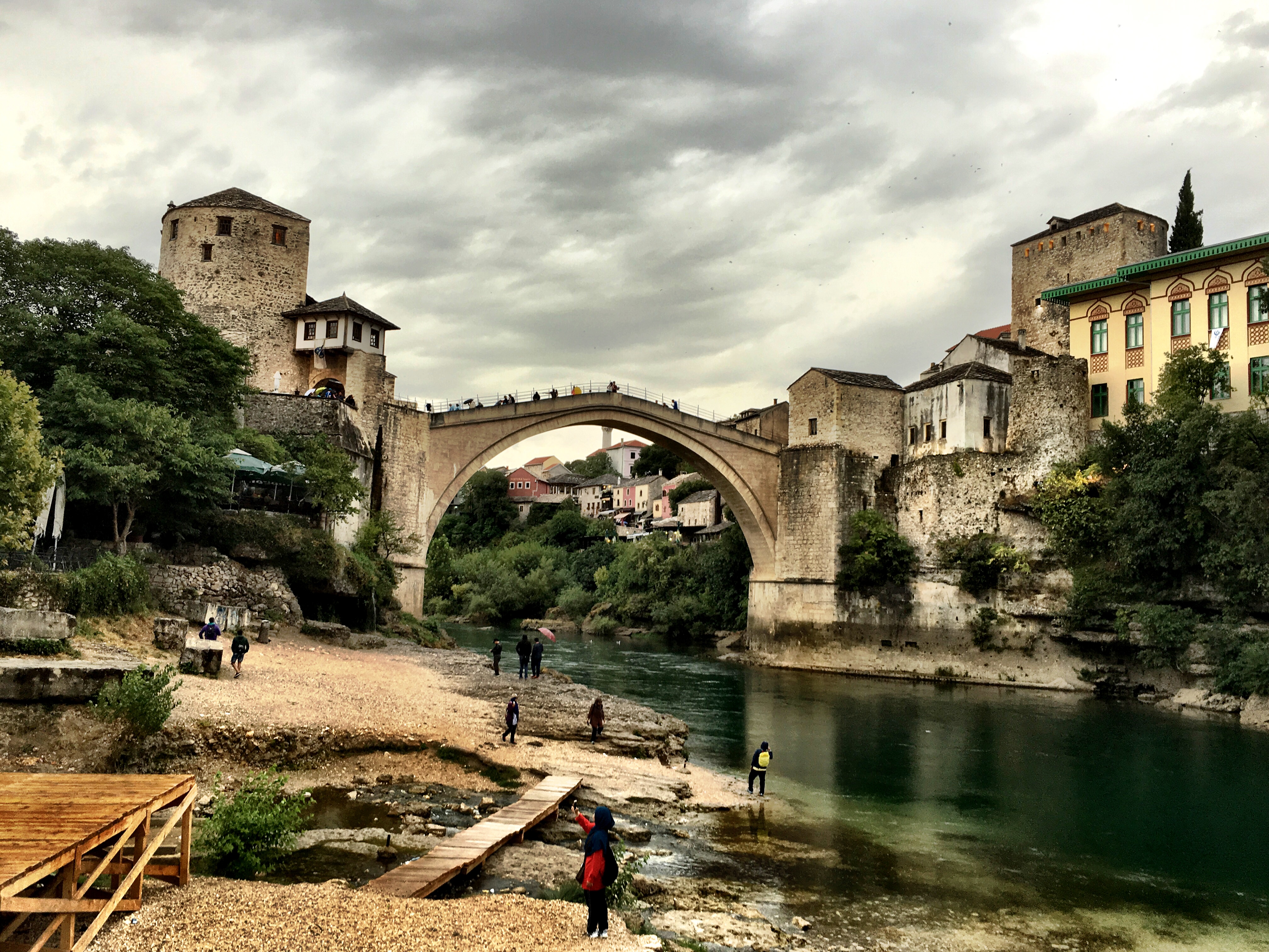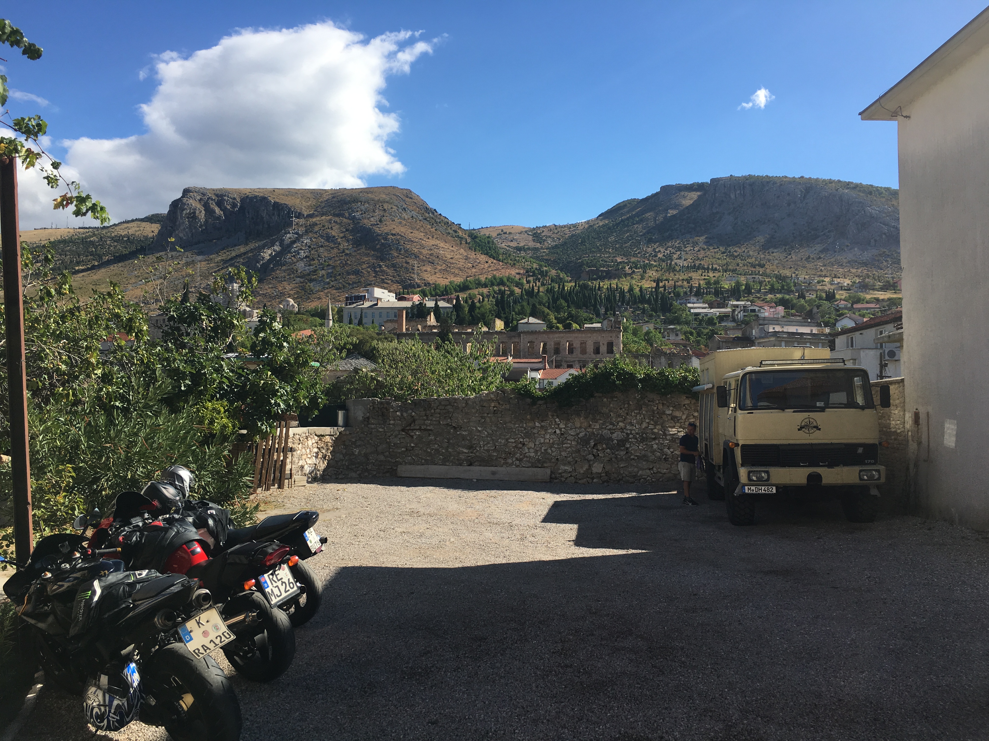 Weiter zur nächsten Stadtbesichtigung, heute Nachmittag soll es regnen und es zieht uns nach Mostar zur Stari Most, der Brücke über die Neretva, dem Wahrzeichen der größten Stadt der Herzegovina. Die Fahrt führt uns über die Berge in karge, einsame Landschaften. Rote Schilder mit Totenköpfen am Straßenrand warnen vor Landmienen, hier sind die Spuren des Bosnien-Krieges noch sehr präsent. Leerstehende Häuser, zerstörte Kirchen und Flurschäden. Fruchtbares Land, das aber nur teilweise wieder genutzt wird. Die Straße ist durch den Regen wie mit Schmierseife, wir fahren wie auf Eiern nach Mostar. Bei strömendem Regen erreichen wir den Parkplatz nahe der berühmten Brücke die im Krieg völlig zerstört wurde. Ein Parkwächter winkt uns in seinen Innenhof, wir sitzen fest. Mir kommt es gleich wie ein Nap vor und meine Warnleuchten gehen an. Patrick hat uns von einem großen Parkplatz mit direktem Blick auf die Brücke erzählt, jetzt sind wir von 3m hohen Mauern umgeben und kommen nicht vor und nicht zurück. Nach kurzem Wortgefecht einigen wir uns auf 25 Euro und haben eine Toilette, einen sicheren Platz und bekommen auch noch eine dicke Tomate und einen Stadtplan geschenkt. In Mützen und Regenjacken stapfen wir los in die seit 2004 restaurierte Altstadt von Mostar. Es ist eine Schande, dass so schöne Orte im Krieg ohne Sinn und Verstand zerstört werden. https://de.wikipedia.org/wiki/Mostar