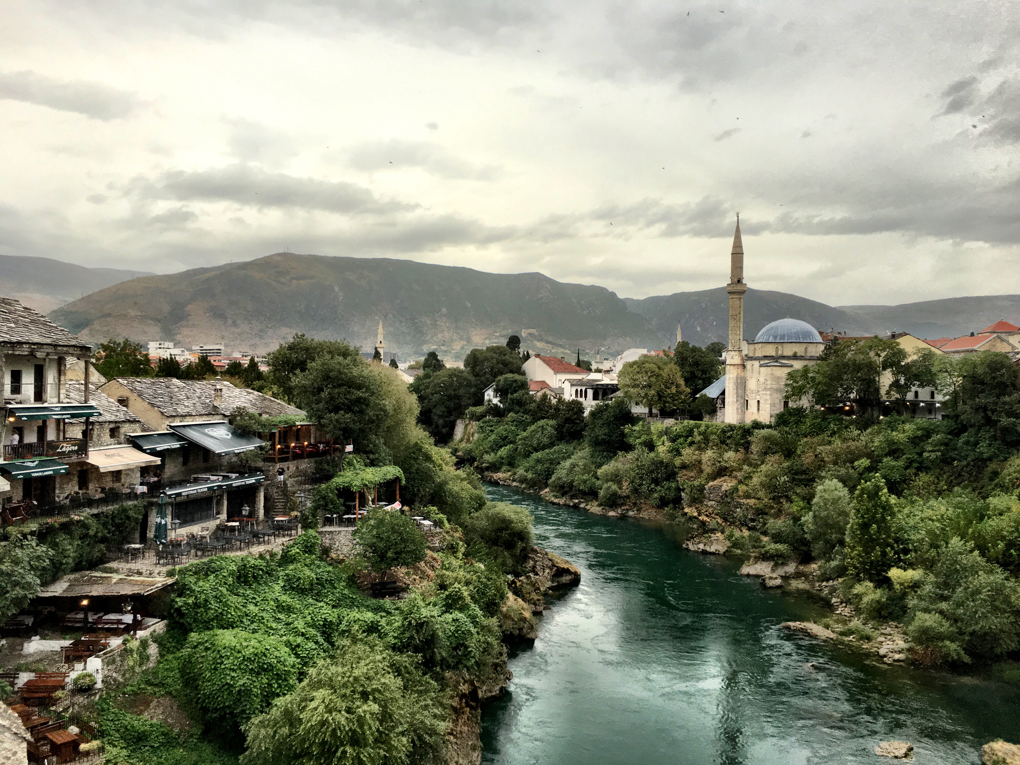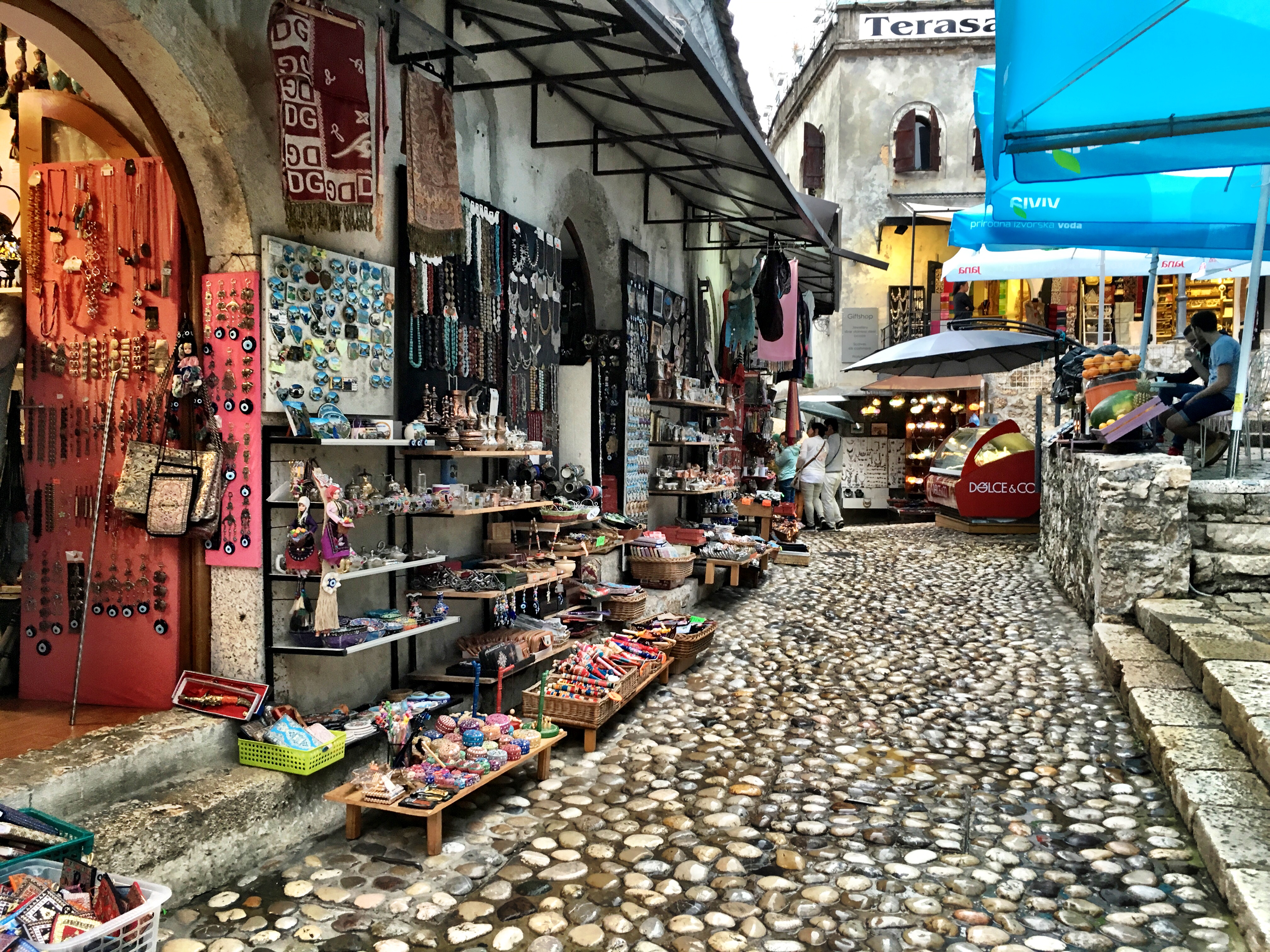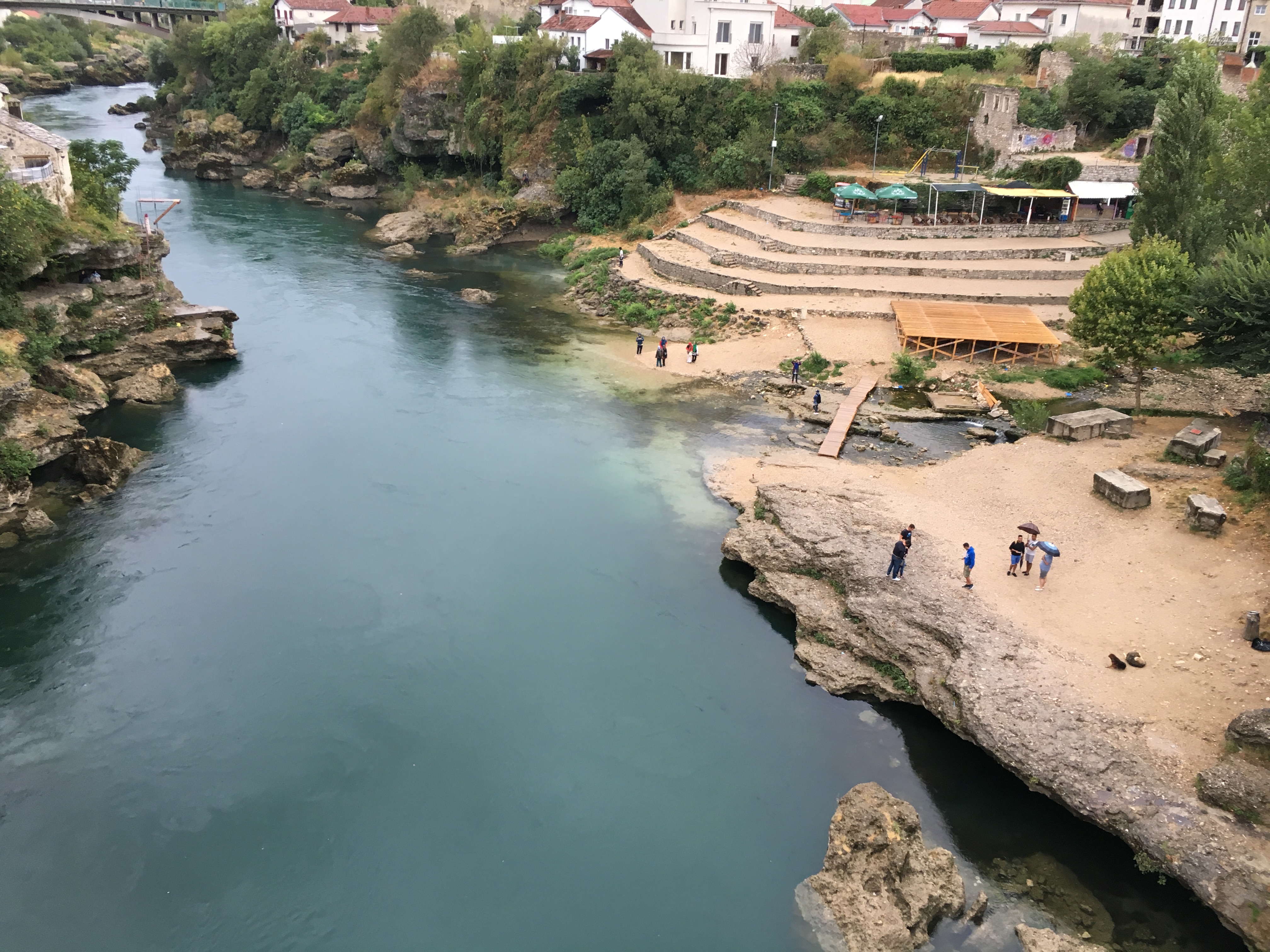 Am nächsten Tag scheint die Sonne und schnell stellt sich heraus dass der empfohlene Parkplatz einem modernen Hotel weichen musste. Auf der Brücke schauen wir noch einmal auf das türkisblaue Wasser in die Tiefe, hier wird jedes Jahr der Red Bull Cliff Diving Bosnia Event ausgetragen, das wäre mal einen extra Besuch wert. Wir schlendern noch einmal durch die engen Gassen, die mit netten Läden geschmückt sind, die von ebenso netten Menschen geführt werden und kaufen noch ein paar genauso nette Souveniers. Die Waren sind handgemachte, gestickt, gehäkelt, gedengelt oder nett verziert. Die Menschen sind trotz der vielen Touristen, die hier täglich aus aller Welt anreisen, sehr freundlich und erinnern sich auch noch am nächsten Tag dass man ein kleines Armband für 2 Euro gekauft hat, ein alternatives junges Leben in einer aufstrebenden, sehr schönen Stadt.