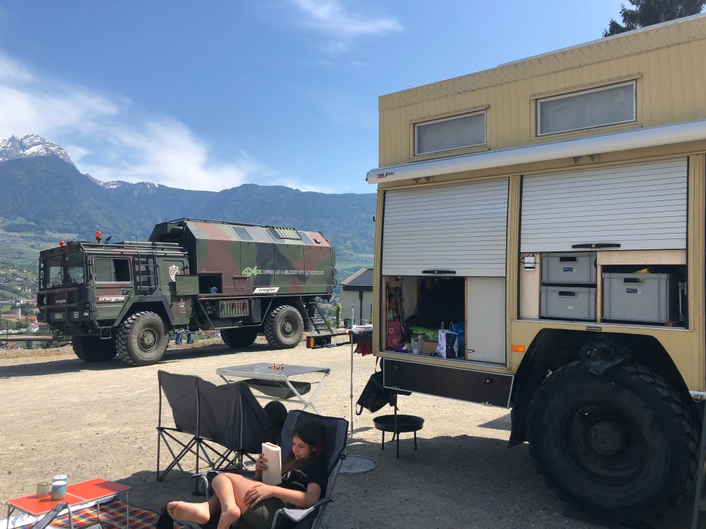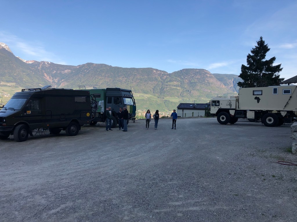 Ostern in Marling – man muss nicht weit fahren und schon ist man mitten in den Weinbergen und Apfelplantagen. Der Stellplatz bei Christian war klasse, 5 Minuten zur besten Pizzeria http://www.ladurn.it und zu Fuß 5 Minuten zum Zug. Ostermarkt in Meran, Übungs- und Familienklettersteig Knott zum ausprobieren aller Routenoptionen und natürlich Wein, Speck und jede Menge Spaß am Lagerfeuer mit Gleichgesinnten – ein tolles Treffen. * Am Rande muss noch erwähnt werden dass unsere Lichmaschine den Geist aufgegeben hat und wir vor den Bahnschinen gestanden sind und nichts mehr ging – dank der Hilfe eines Freundes wurden wir abgeschleppt. Die Batterie geladen und wir sind wieder gut in München gelandet. Mittlerweile ist die Lichtmaschine erneuert, eine größere, besssere…