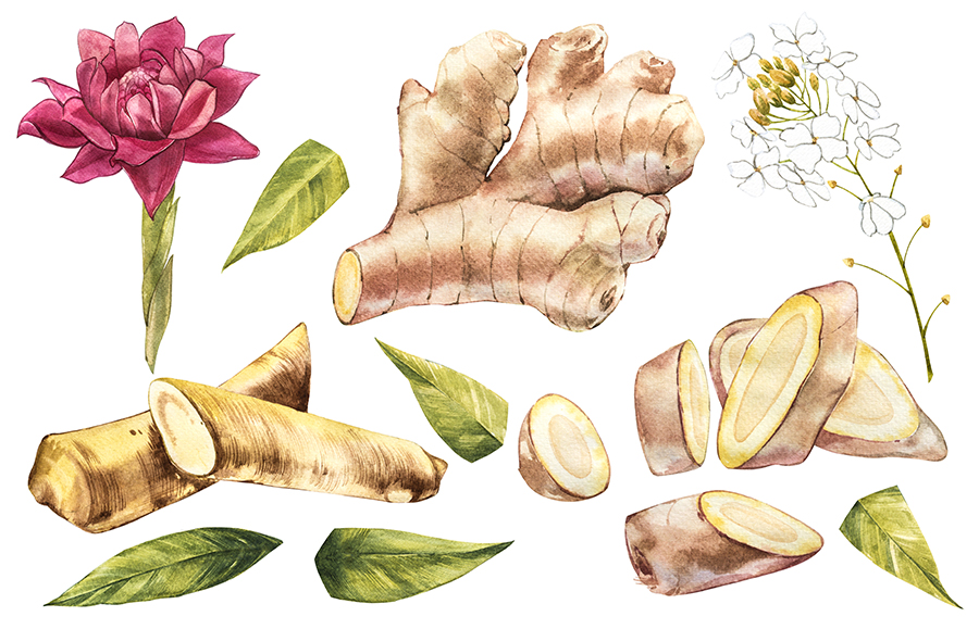 Er ist ein vielseitiges Wundermittel und hilft bei fast jeder körperlichen Schräglage aus der Patsche. Zingiber officinale, die lateinische Bezeichnung für die leistungsstarke Knolle, enthält rund 150 Inhaltsstoffe. Mineralstoffe wie Kalium, Calcium, Phosphor, Magnesium und Eisen. Ätherischen Öle wie Borneol, Cineol, Phellandren und Farnesen, sowie weitere Scharfstoffe wie Gingerole, machen den Ingwer zu einer wahren Superknolle. Nicht zuletzt enthält die Ingwerwurzel eine gewisse Menge an Flavonoide, denen antioxidative sowie krebs- und entzündungshemmende Wirkungen nachgesagt werden.